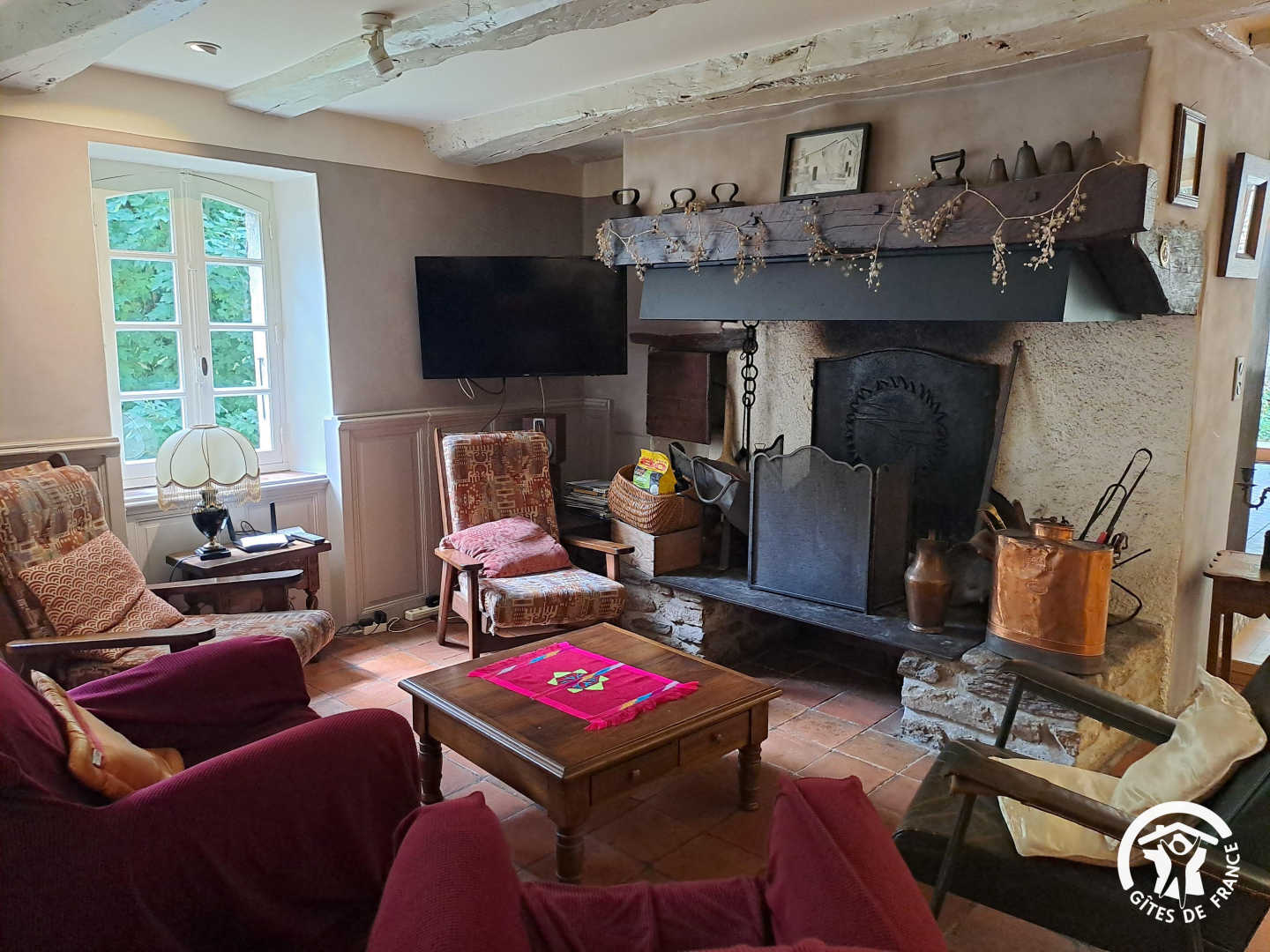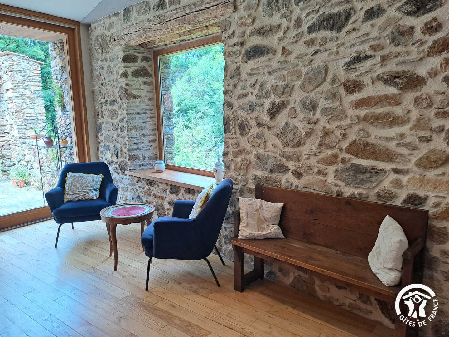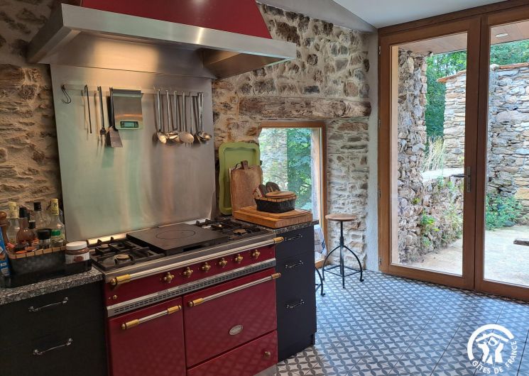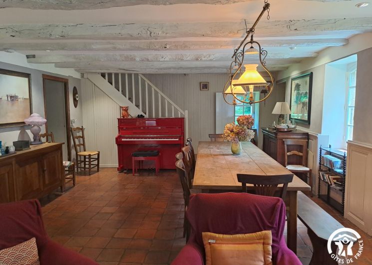 Séjour / Salle à manger avec cheminée, bibliothèque, belle et spacieuse cuisine suréquipée, avec une console centrale en granit du Sidobre et un piano Lacanche. Les musiciens ont la possibilité de jouer du « vrai » piano et ce, même en mode silencieux.