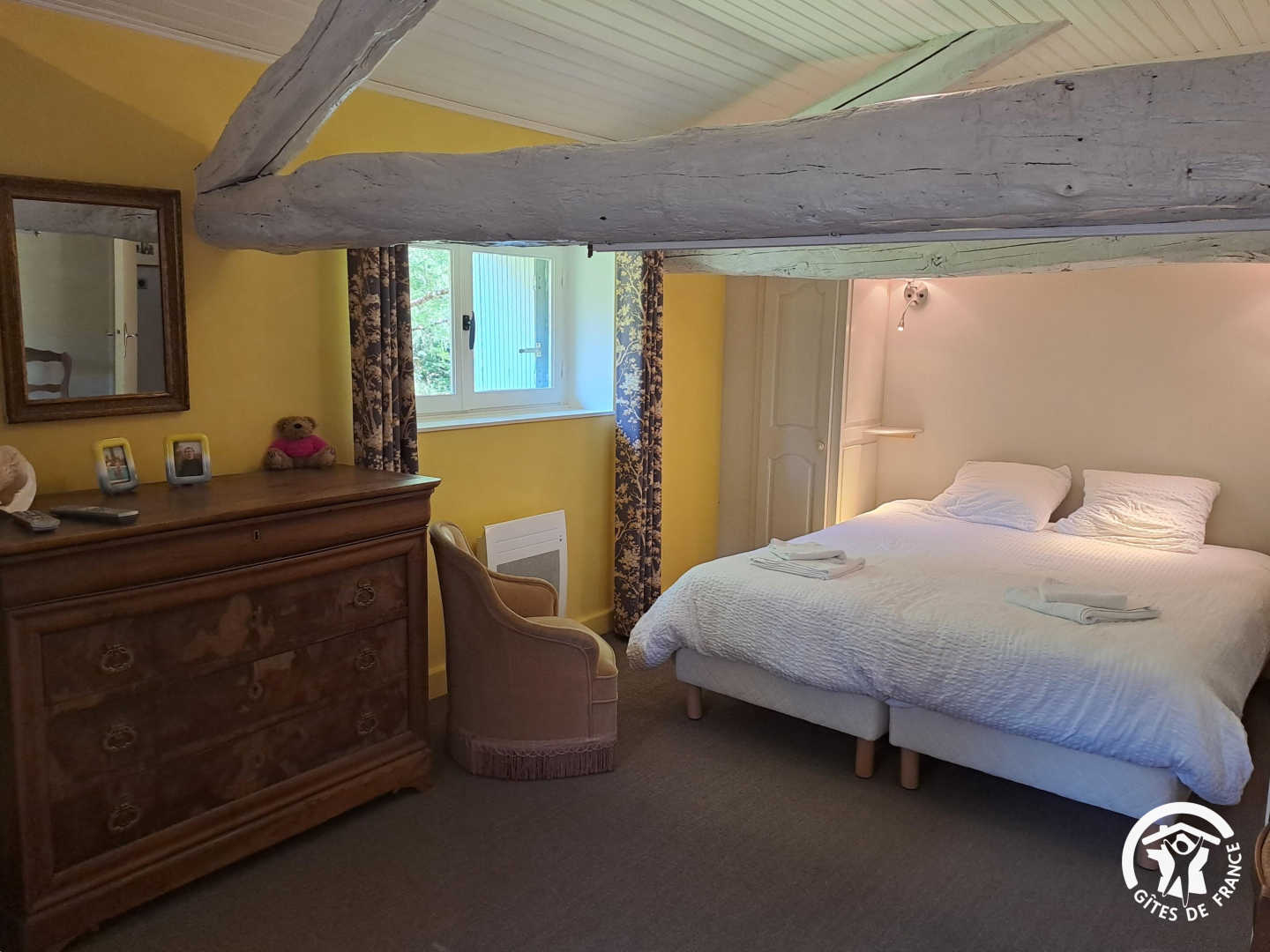 – La chambre jaune, très spacieuse peut accueillir 4 personnes avec un lit double en 160×200 et deux lits individuels.