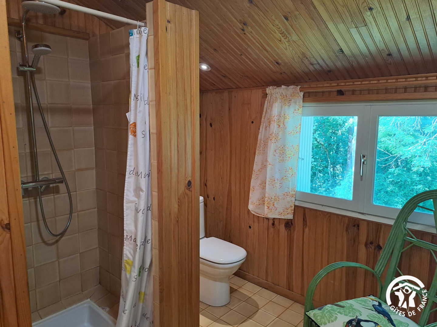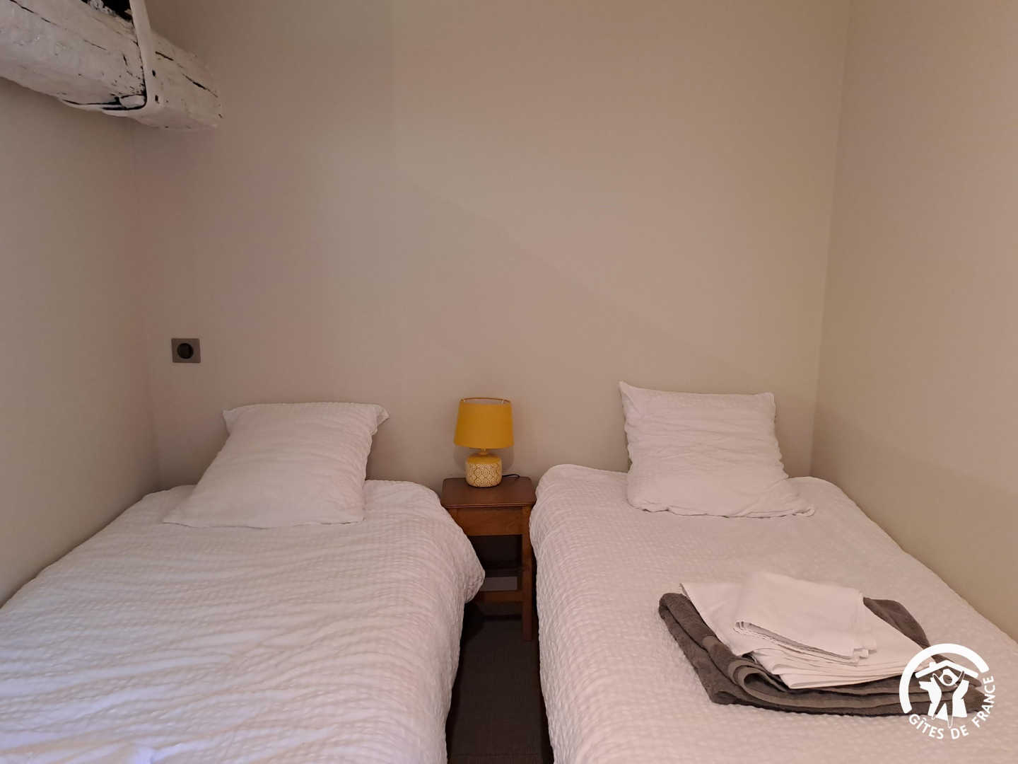 Une chambre pour 2 personnes avec 2 lits en 90×200 jumelables et salle d’eau privative, buanderie, WC et salle d’eau + WC supplémentaire dédiés aux utilisateurs du spa de nage et du sauna extérieurs.