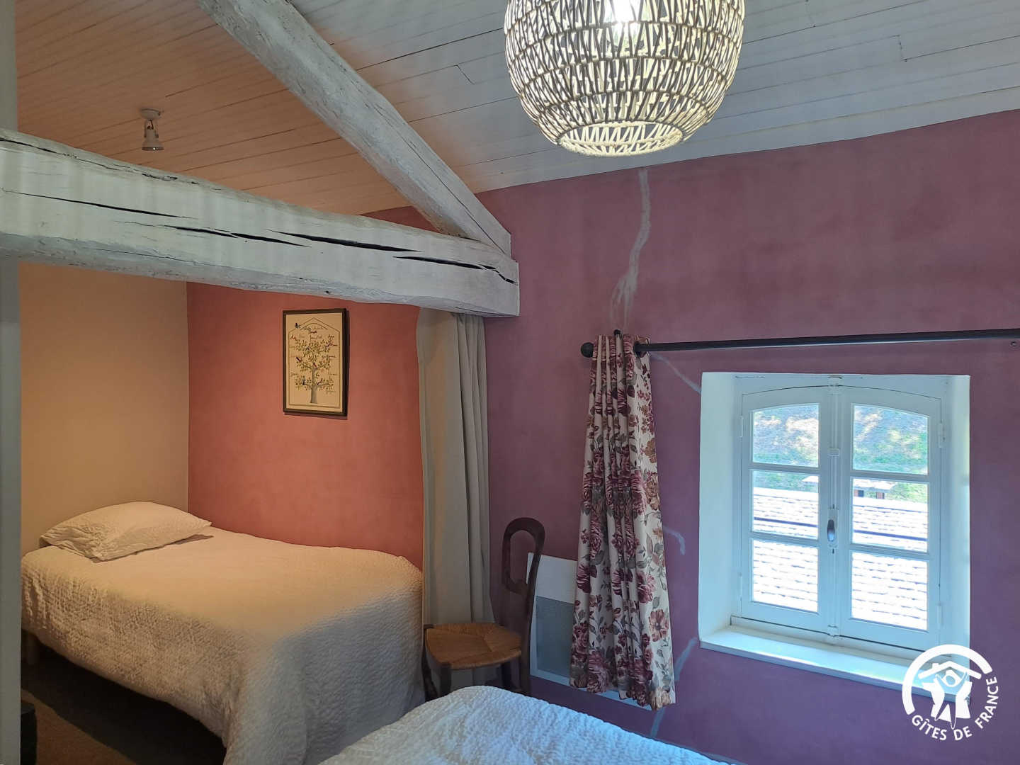 – La chambre rose est pourvue de deux lits jumelables en 90×200 (lit double 180×200) et d’un lit simple en 90×200