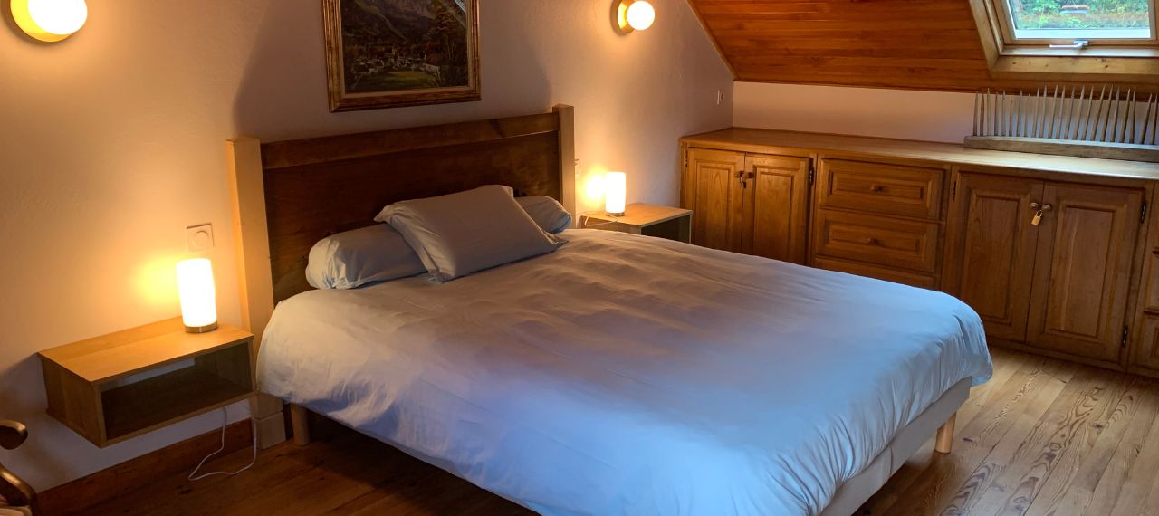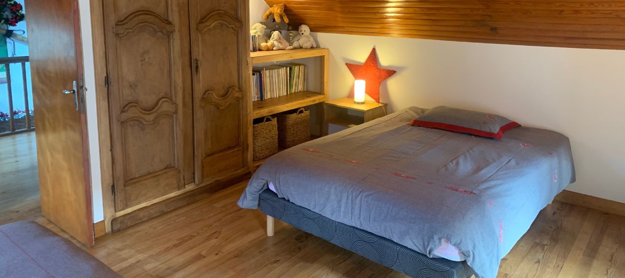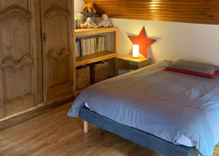 Salon avec 2 canapés et bibliothèque. Chambre avec lit 160. Chambre avec lit 140 et 2 lits 90. Espace repos avec bureau-coin lecture. Buanderie au sous-sol avec rangements.