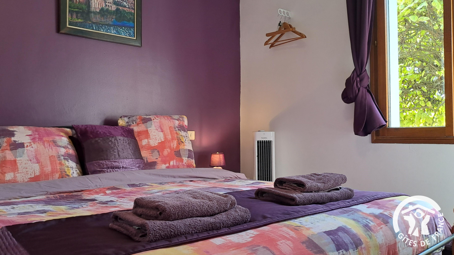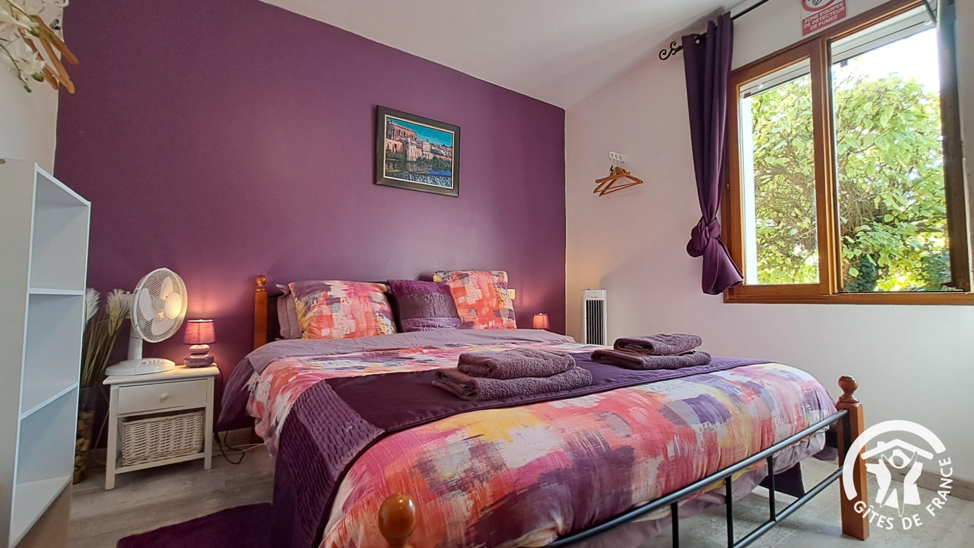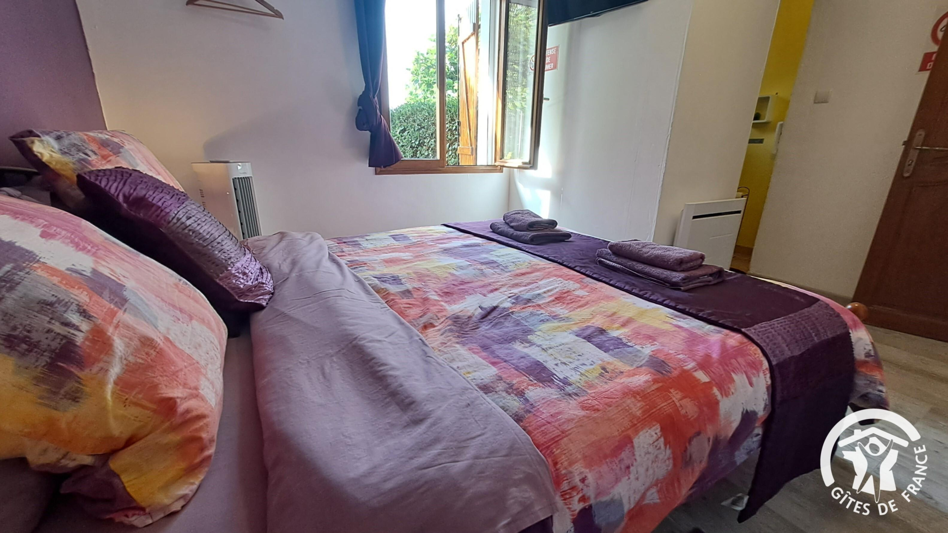 – Chambre Violette pour 2 personnes, avec lit double en 160x200cm et salle d’eau (cabine de douche hydromassante, vasque, wc).