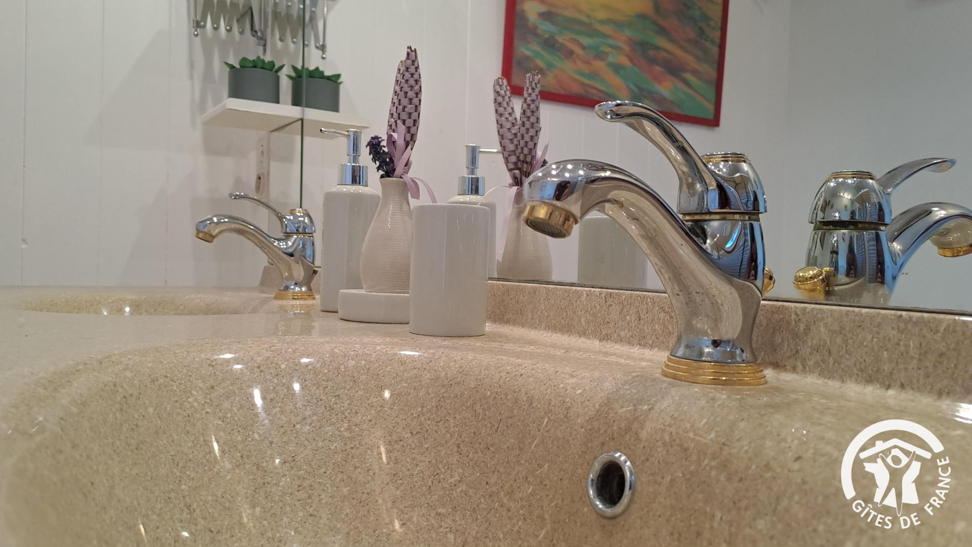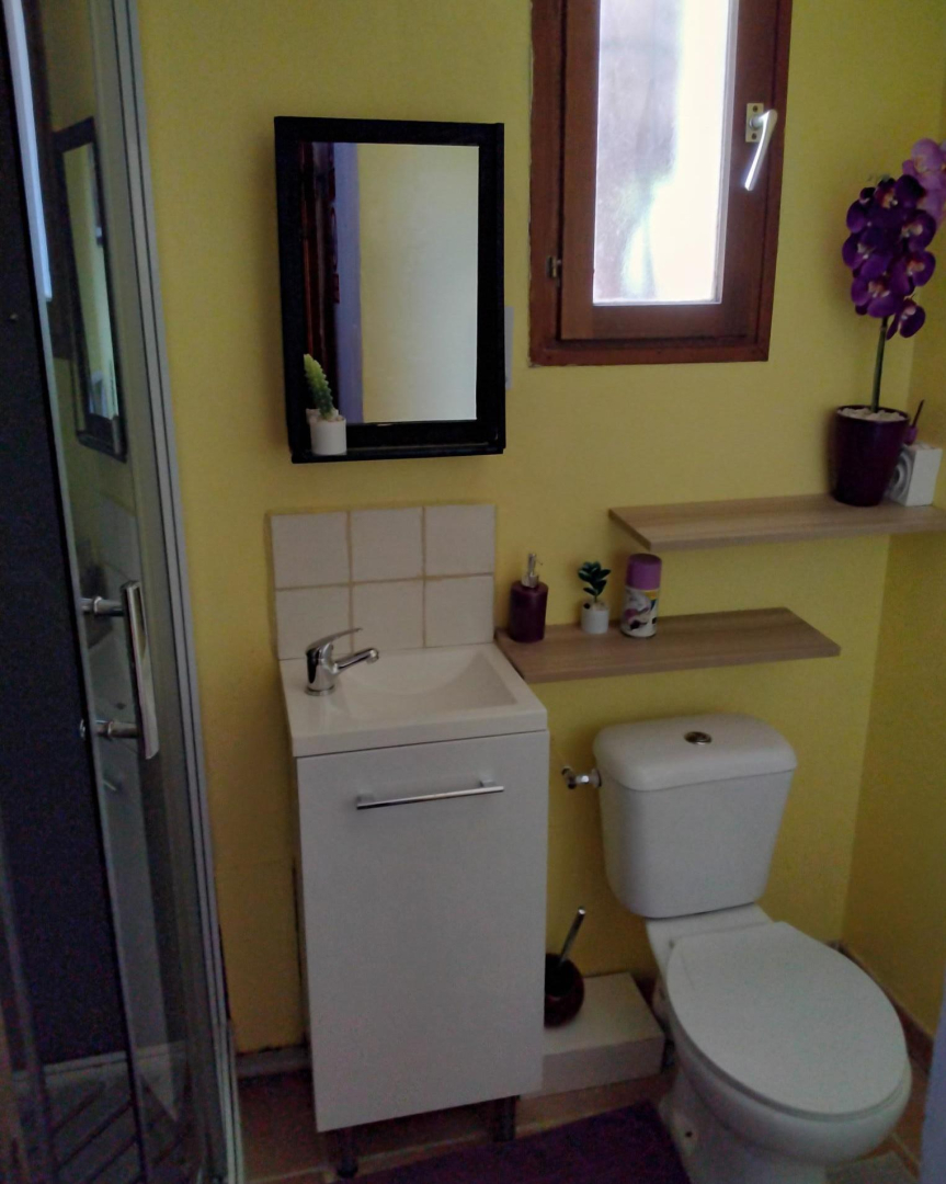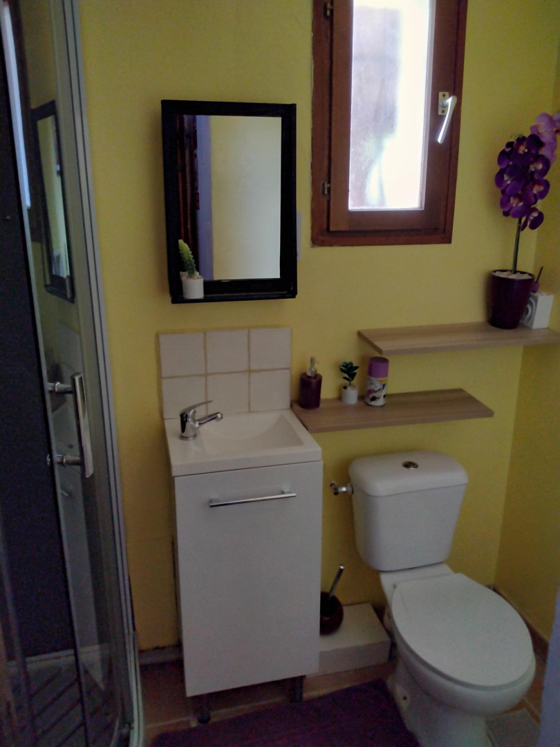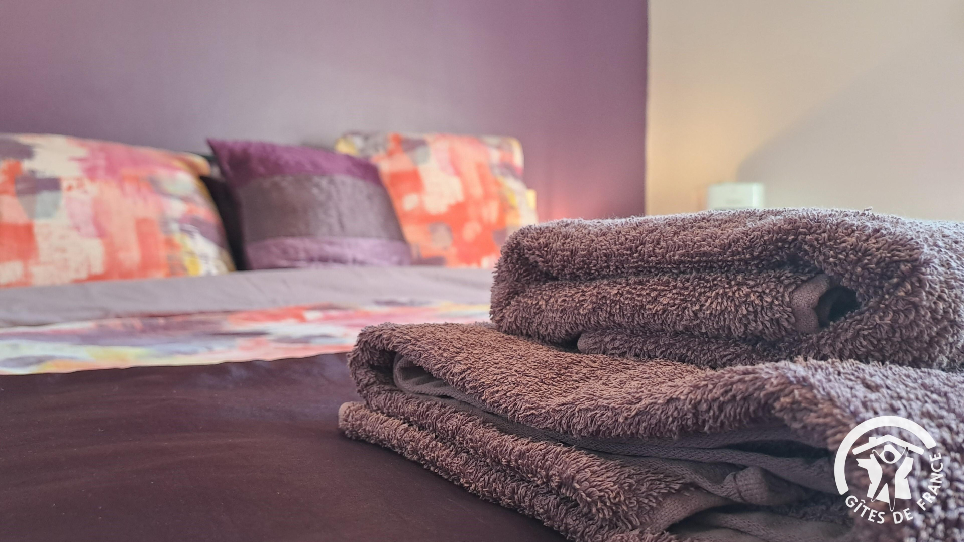– Chambre Violette pour 2 personnes, avec lit double en 160x200cm et salle d’eau (cabine de douche hydromassante, vasque, wc).