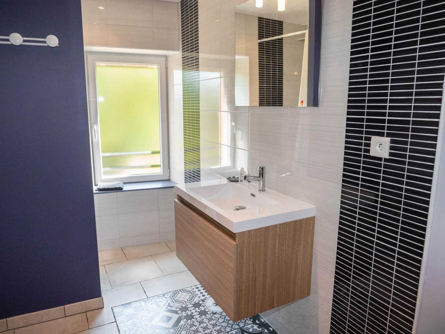 A l’étage, se trouvent les deux chambres, une mezzanine au-dessus du salon et la salle d’eau avec un wc.