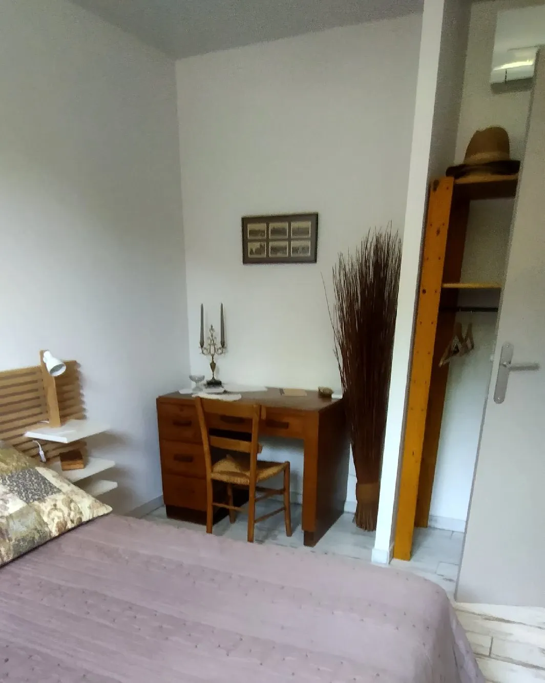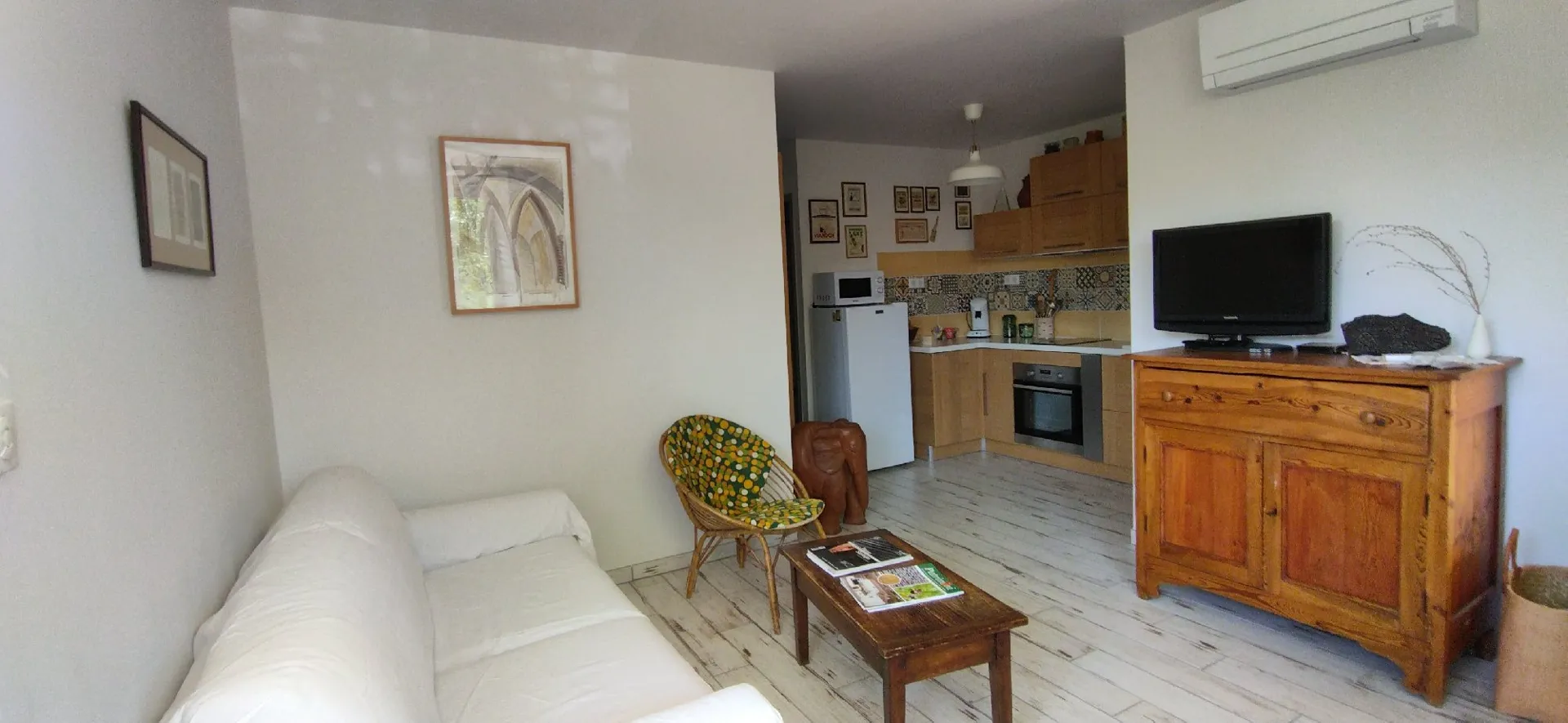 Agréable rez-de jardin, pour deux personnes, dans la villa des propriétaires, appartement entièrement rénové de 40 m2 avec une entrée indépendante, 1 grande pièce à vivre salon/cuisine très bien équipée, 1 chambre, 1 salle de douche et 1 WC séparé. Jolie terrasse de 30 m2, à l’ombre de deux vieux amandiers, donnant sur jardin. Parking gratuit.