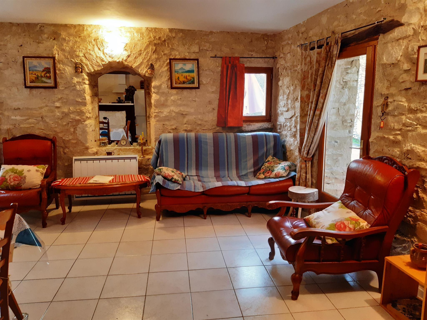 Au rez-de-chaussée se trouve une pièce à vivre aux murs de pierre qui conservent la frâicheur même en plein été, avec cuisine équipée ouverte.