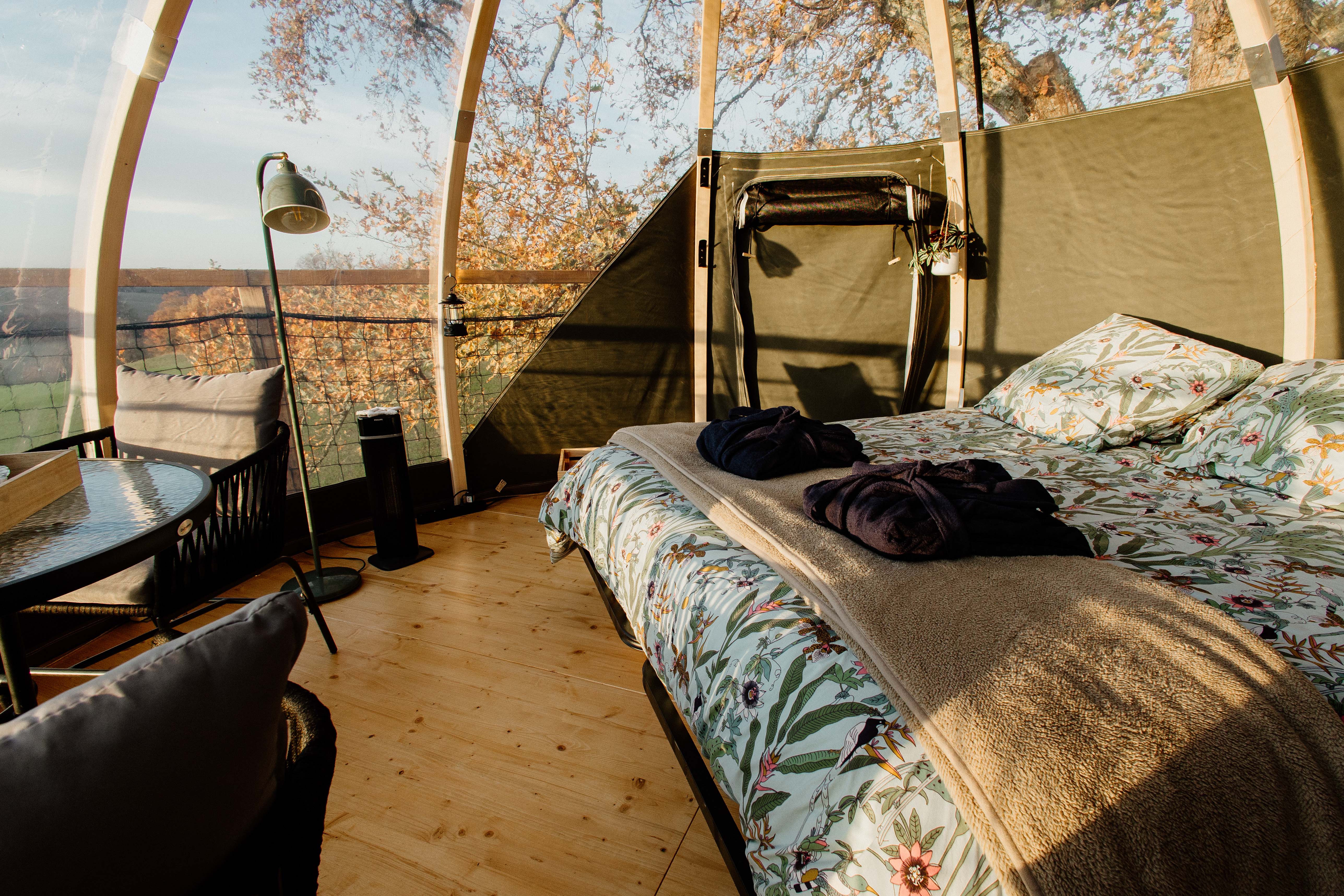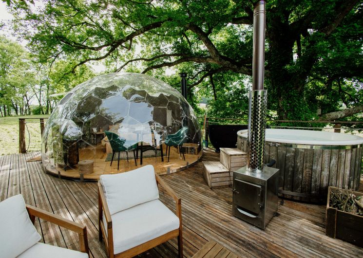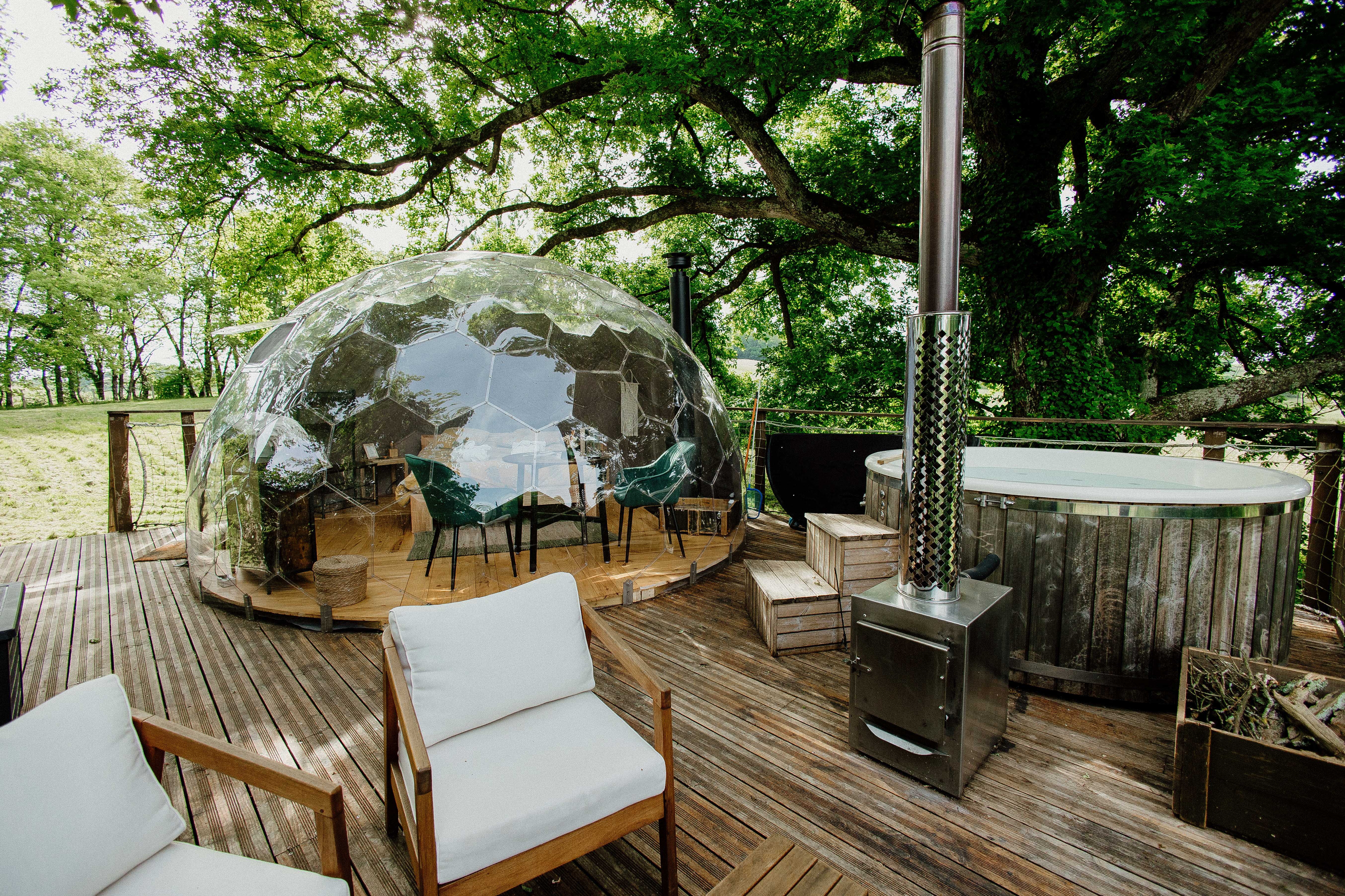 Nichés dans des chênes bicentenaires, notre Dôme et notre Bulle vous offriront une expérience atypique et inoubliable. Profitez en journée d’un panorama extraordinaire sur la nature environnante, et en soirée d’une vue magnifique sur le ciel étoilé. La chaleur de votre bain finlandais privatif situé sur la terrasse vous apportera un bien-être incroyable. La piscine située à quelques mètres est également accessible. Vous disposerez d’une salle de bain et de toilettes privatives situées directement sous la terrasse. En hiver (pour le Dôme), le poêle à bois vous offrira une chaleur réconfortante. Enfin, en option, vous pourrez profiter si vous le souhaitez de notre délicieuse planche repas pour le repas du soir. .