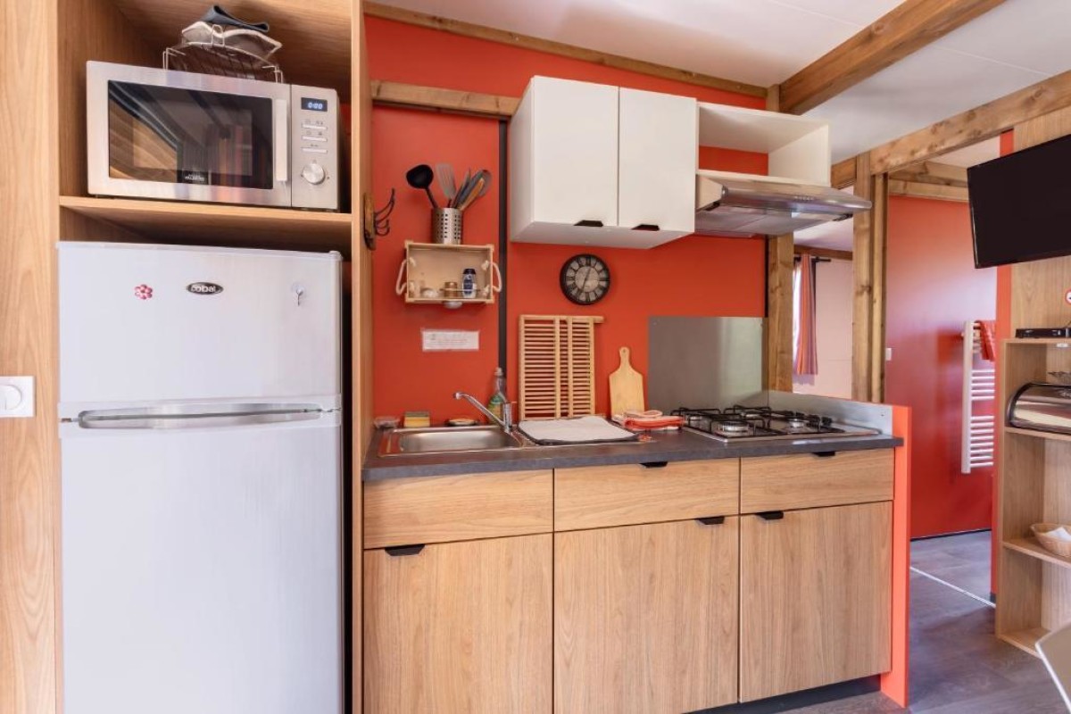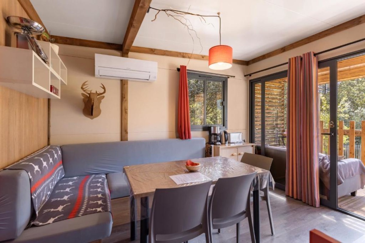 Situé dans un domaine intime composé de 5 chalets, le chalet vous accueille pour un séjour paisible en pleine nature. Chaque chalet dispose de sa propre terrasse privée aménagée avec mobilier de jardin, idéale pour les repas en plein air ou un moment de lecture. Vous profiterez également d’une piscine à partager, parfaite pour se rafraîchir après une journée de découverte. Laissez-vous envoûter par la vue directe sur l’impressionnant château cathare de Peyrepertuse, perché sur son éperon rocheux. Un SPA privé est situé sur la terrasse en option. La région regorge de trésors à explorer. Outre le majestueux château de Peyrepertuse accessible en quelques minutes, vous pourrez visiter celui de Quéribus, autre joyau de l’époque cathare. Les amateurs de nature apprécieront les sentiers de randonnée qui sillonnent les Corbières, les gorges de Galamus ou encore les baignades dans les rivières environnantes. Les villages typiques, les marchés locaux, les caves à vin, et les plages de la Méditerranée à moins d’une heure vous promettent un séjour riche, entre culture, paysages et détente. Au village: concerts d’été hebdomadaires, la P’tite Epicerie et sa Table (bistrot de pays) avec ses bons plats de produits locaux. Chalet climatisé: – Un séjour avec cuisine ouverte (cafetière à filtre, mini-four, réfrigérateur, TV, table à manger) – Chambre 1: un lit 140x190cm – Chambre 2: 2 lits 90x190cm – Chambre 3: 2 lits 90x190cm – Salle d’eau indépendante: douche – WC indépendant Le chalet reste frais l’été et chaud l’hiver. Bonne connexion 4G. Terrain clos pour les animaux. Sur place profitez d’un accès à la rivière à l’ombre des saules pour avoir de la fraîcheur (idéal pour les baignades de nos amis à 4 pattes), du club house avec bibliothèques, jeux , TV ,du ping-pong, du boulodrome , du trampoline et plus encore. Petit-déjeuner facultatif (8€/pax), d’autres services sont proposés garde d’enfants, animaux.. Vous pouvez louer les autres chalets du domaine en groupe.