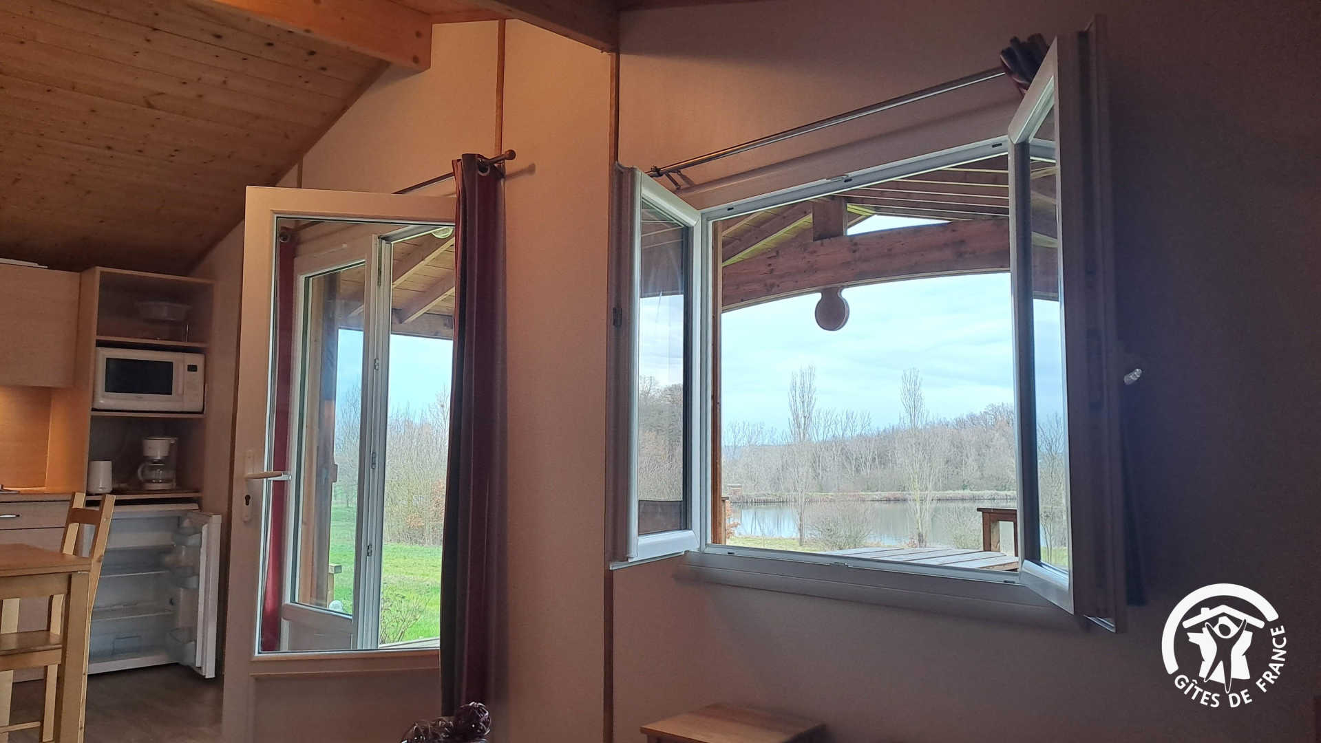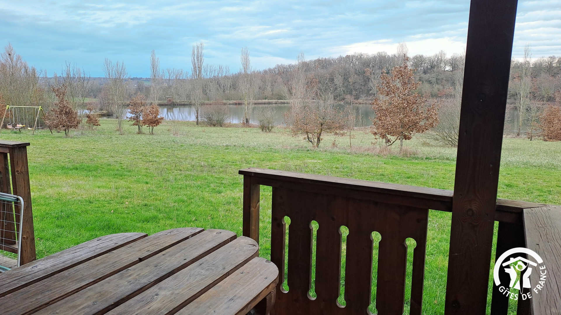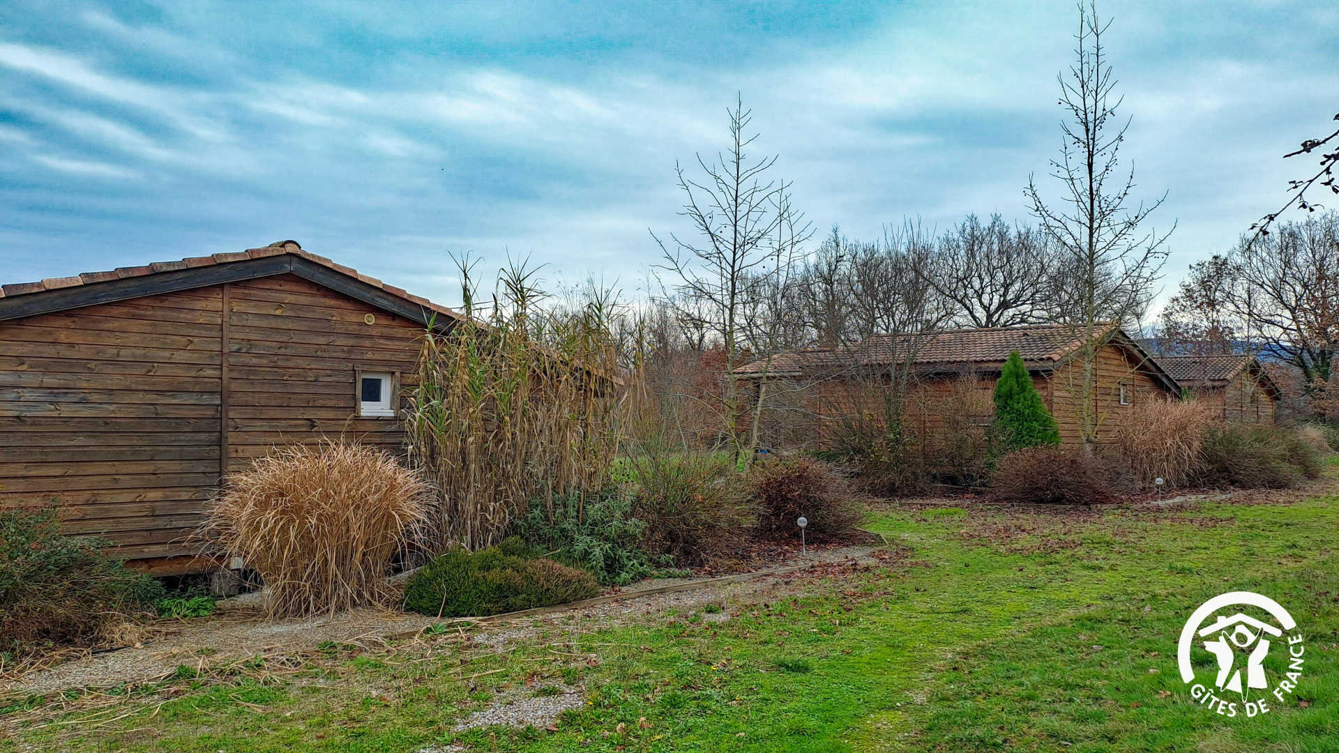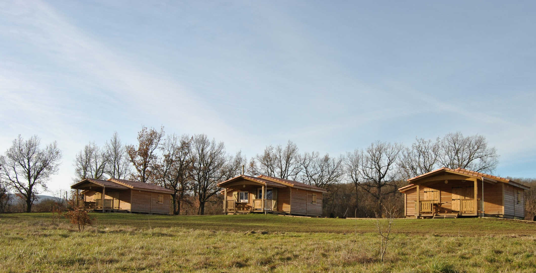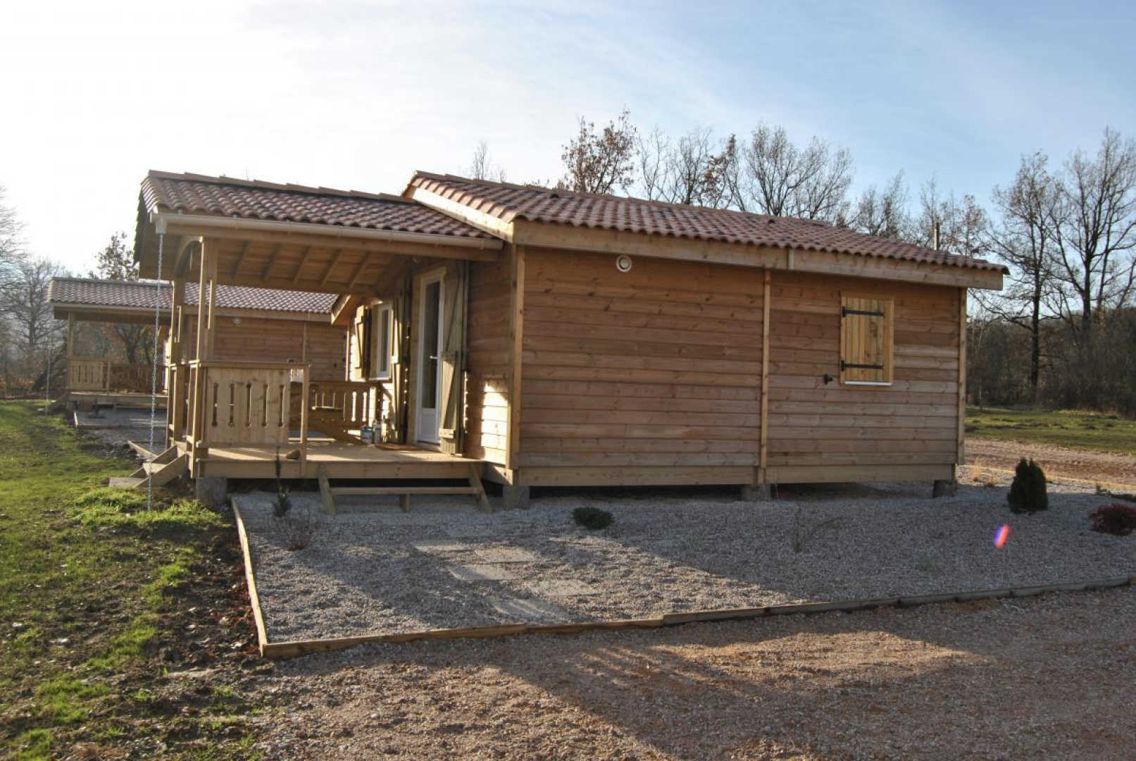 Retrouvez trois chalets posés au bord du lac du Perche, à proximité de la Ferme de la Bonicarde.