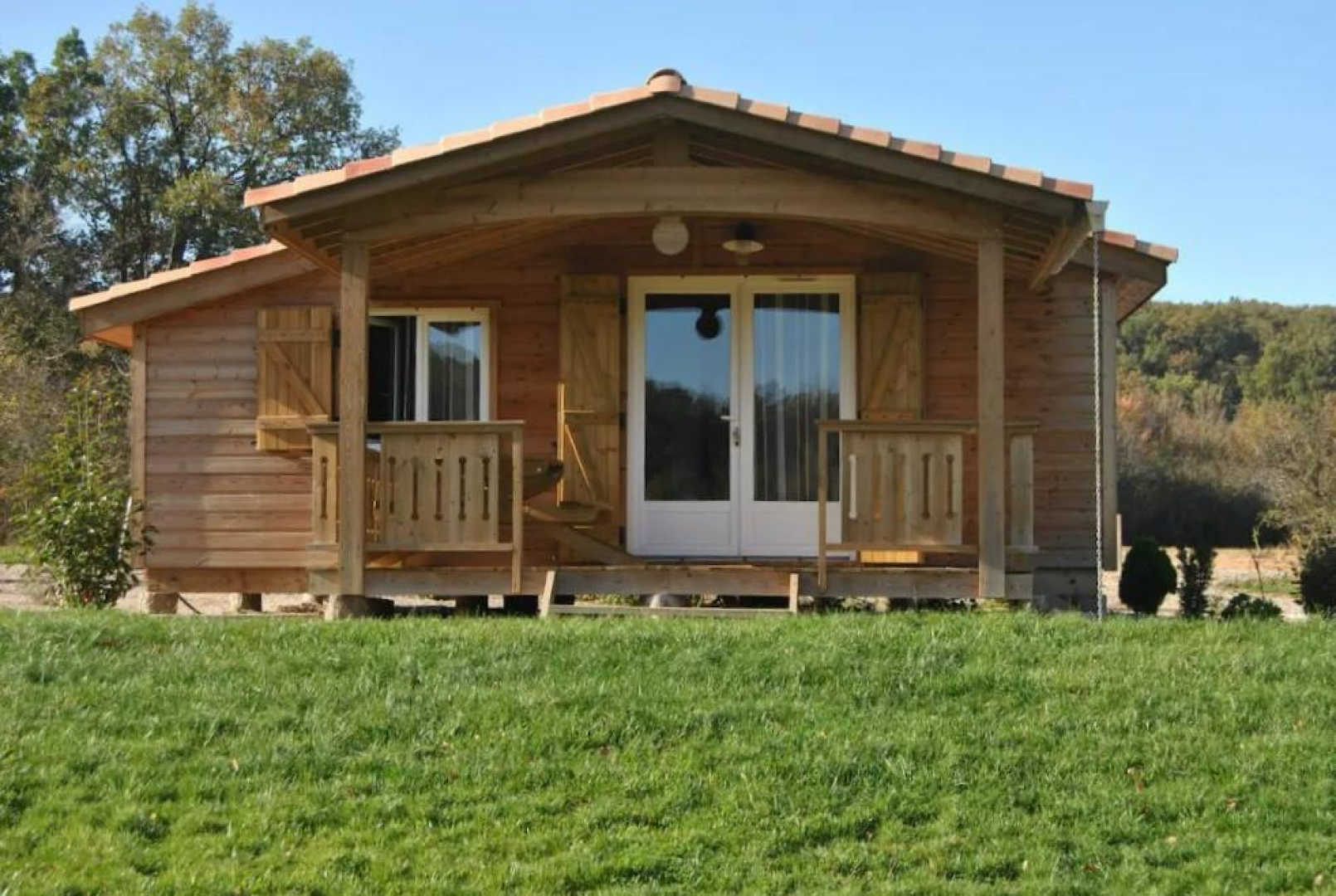 D’une surface de 35m², le chalet offre une pièce à vivre avec coin cuisine, coin salon, puis deux chambres, salle d’eau et wc. Une jolie terrasse couverte donne directement sur le lac. Deux marches pour accéder à la terrasse et donc au chalet qui est ensuite de plain-pied.
