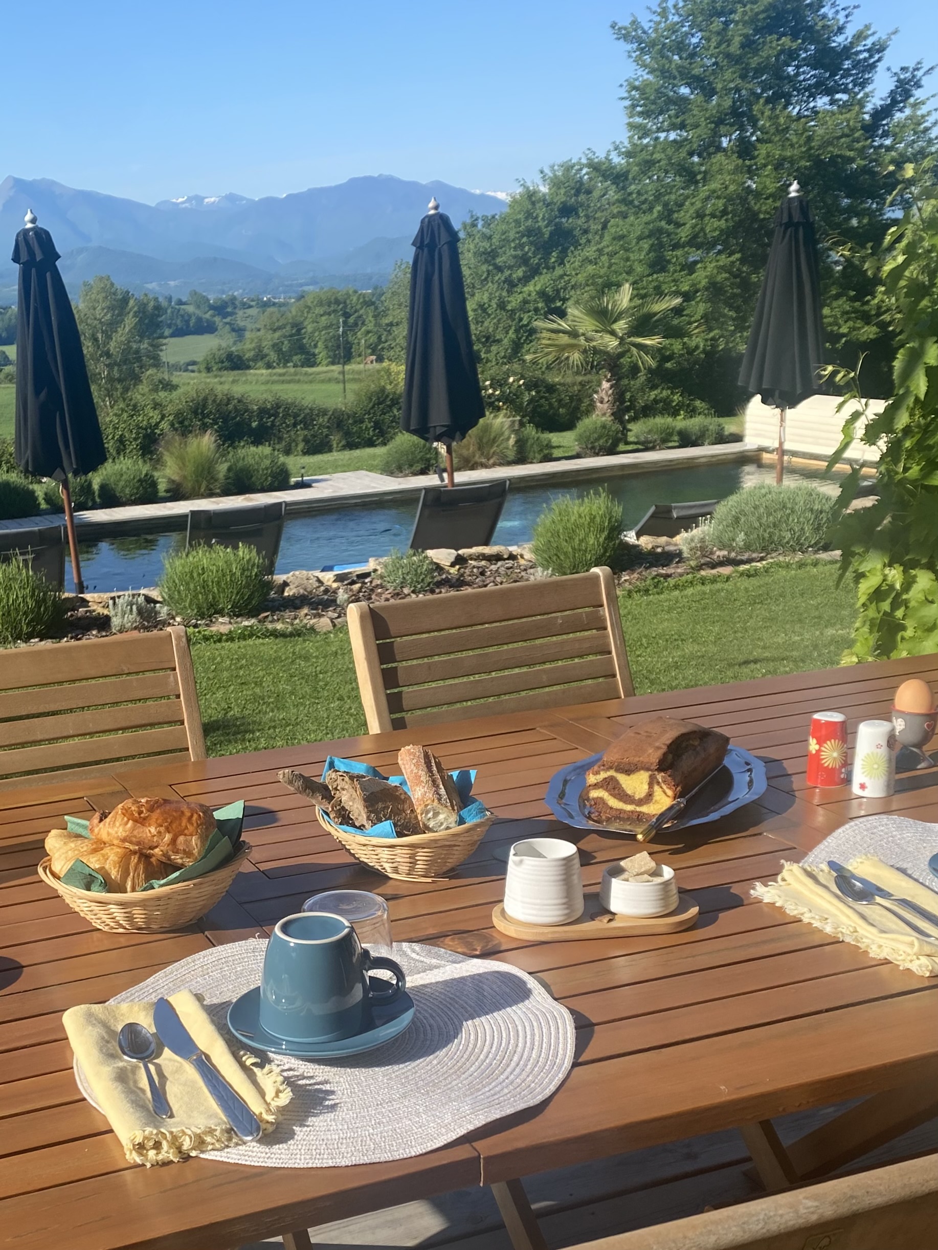 4 chambres d’hôtes doubles dont 1 suite parentale 2-3 personnes avec piscine en bois massif immergé face au Pic du Cagire et à la chaîne des Pyrénées