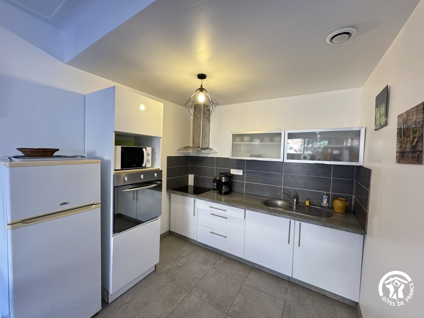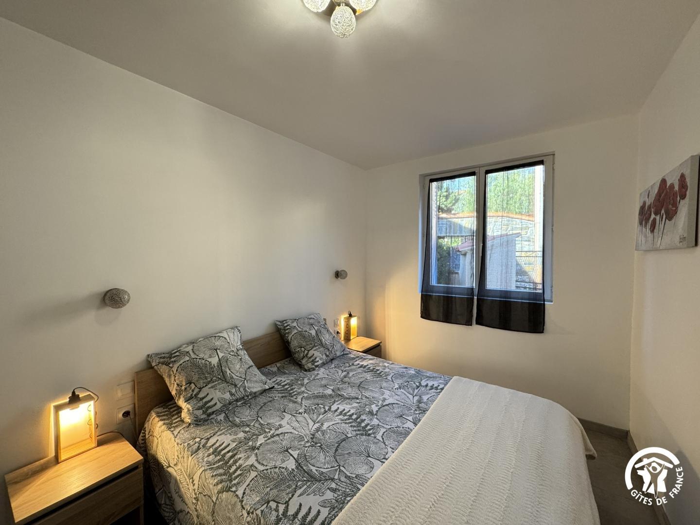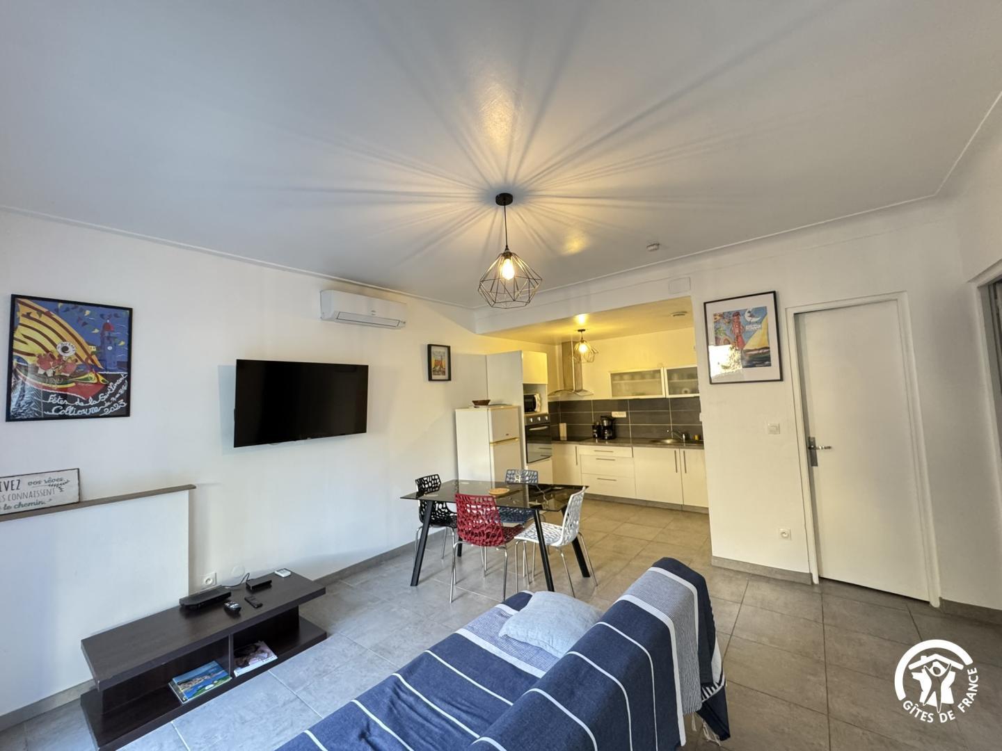« Ce gîte de plain pied, à l’ambiance traditionnelle et confortable, vous accueille pour un séjour à deux ou en famille, dans un environnement calme. En entrant, vous accédez à une pièce à vivre climatisée lumineuse où les espaces se prolongent naturellement entre salon et cuisine ouverte. La cuisine est entièrement équipée pour faciliter votre quotidien, plaque 3 foyers vitrocéramique, bouilloire et cafetières à filtre et Senseo. La salle d’eau dispose de WC intégrés. Le gîte comprend deux chambres : • Chambre 1 : 1 lit 160×200 • Chambre 2 : 1 lit 160×200 L’extérieur offre une terrasse agréable, parfaite pour prendre vos repas ou profiter de la douceur du climat. Vous disposez également d’une place de stationnement dans le garage collectif, ce qui est particulièrement appréciable dans Collioure. Le lave-linge est à disposition dans la buanderie commune.