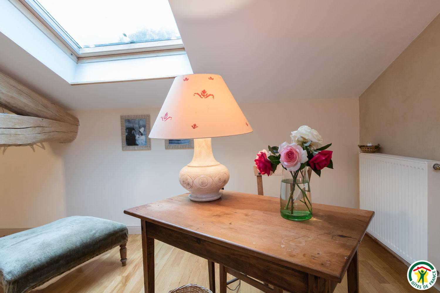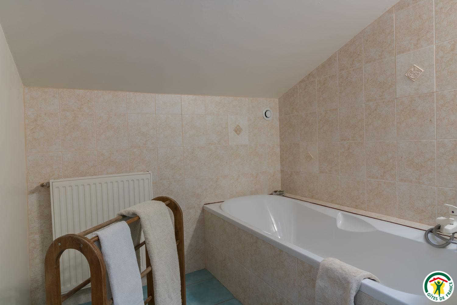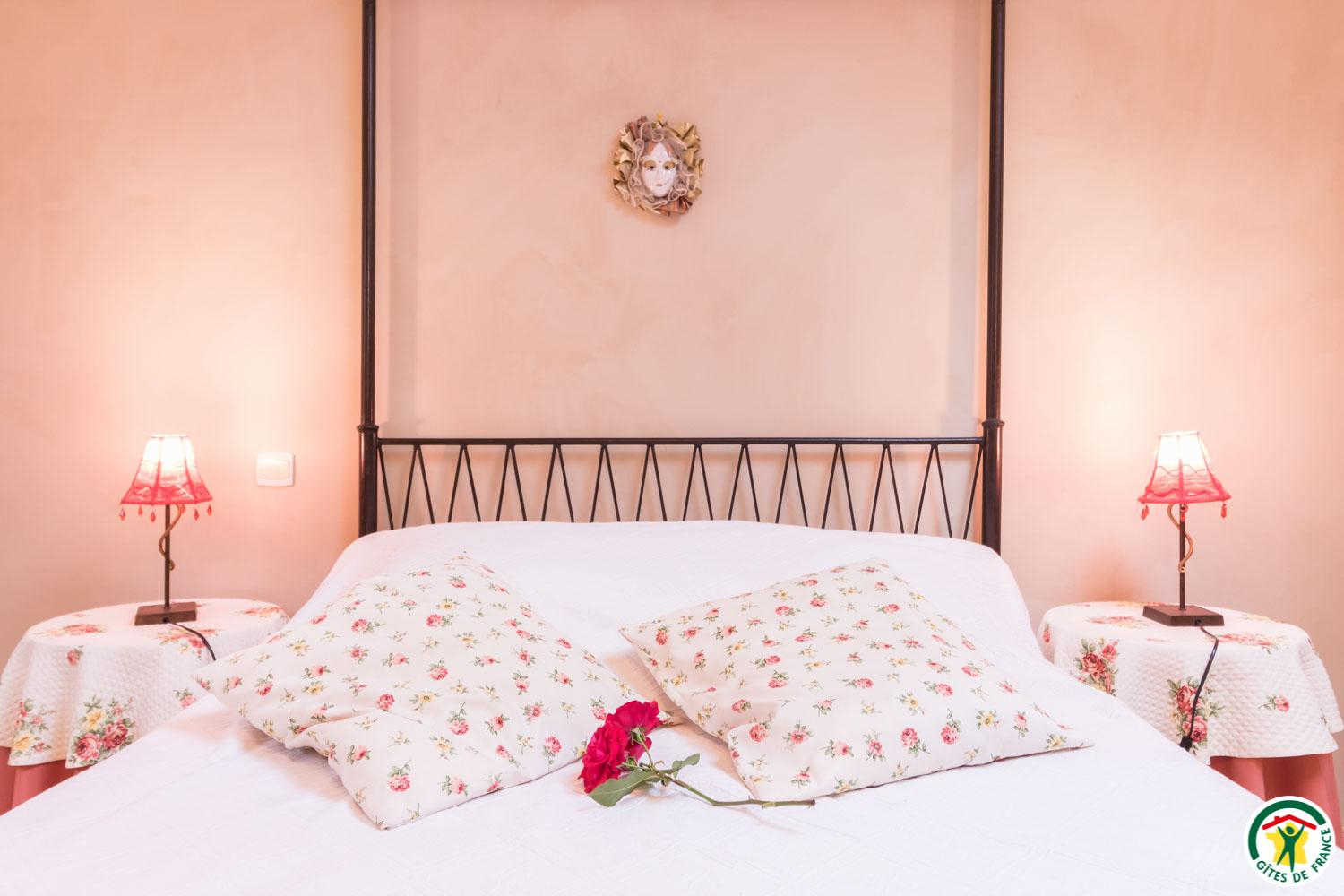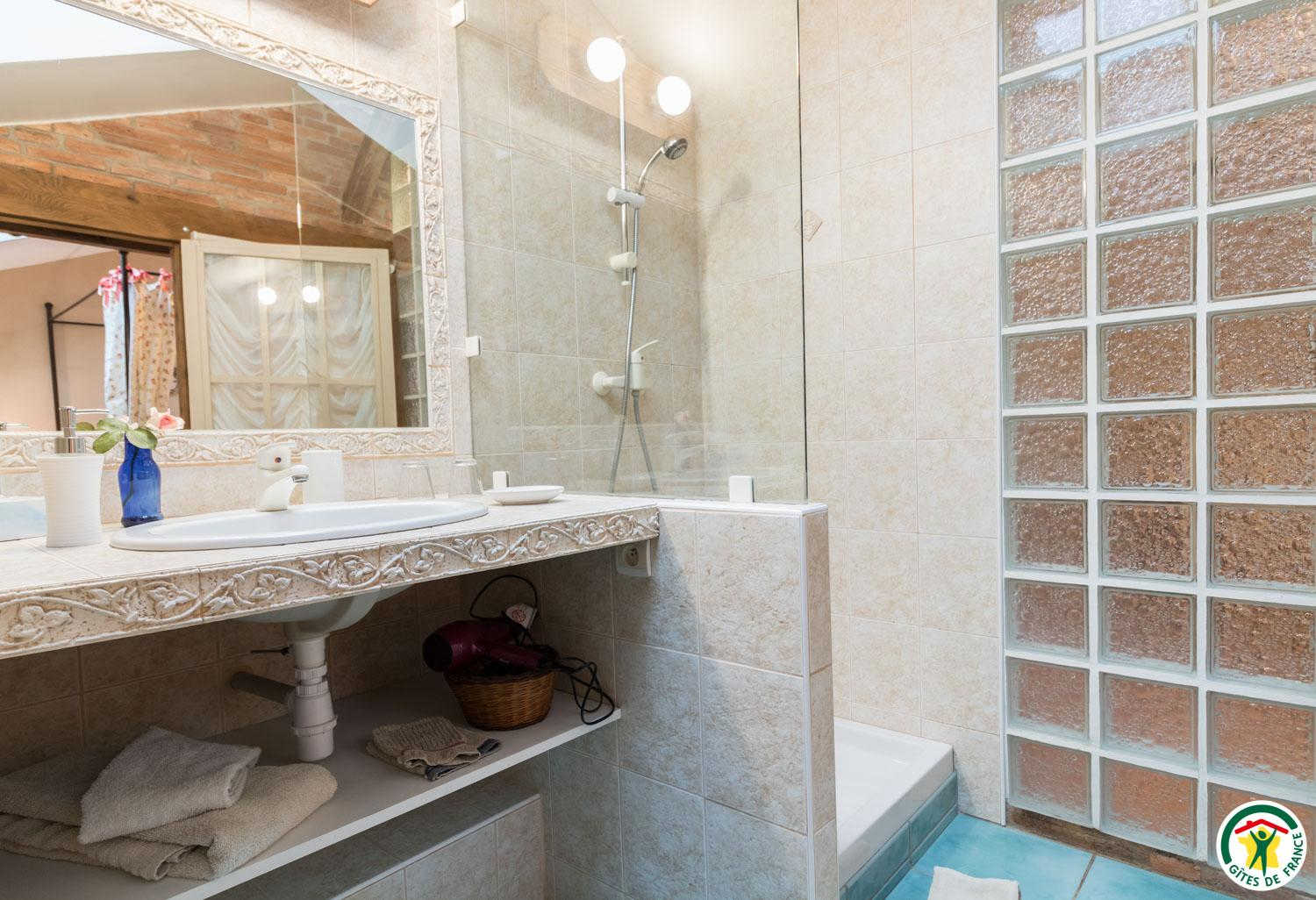 – à l’étage : chambre « Venise » mansardée (1 lit double en 140cm à baldaquin + 1 lit simple en 90cm + salle de bains, douche et WC).