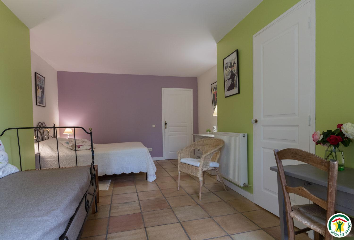 – au rez-de-chaussée : salle à manger, coin-salon/bibliothèque, chambre « Toulouse-Lautrec » avec terrasse privative (1 lit double en 160cm + 1 lit simple en 90), chambre « Arcachon » avec accès handicapés (1 lit double en 160cm), chambre « Toulouse » (1 lit double en 160cm + 1 lit simple en 90cm), avec chacune salle d’eau communicante et WC séparé (dans la salle d’eau pour « Arcachon »).
