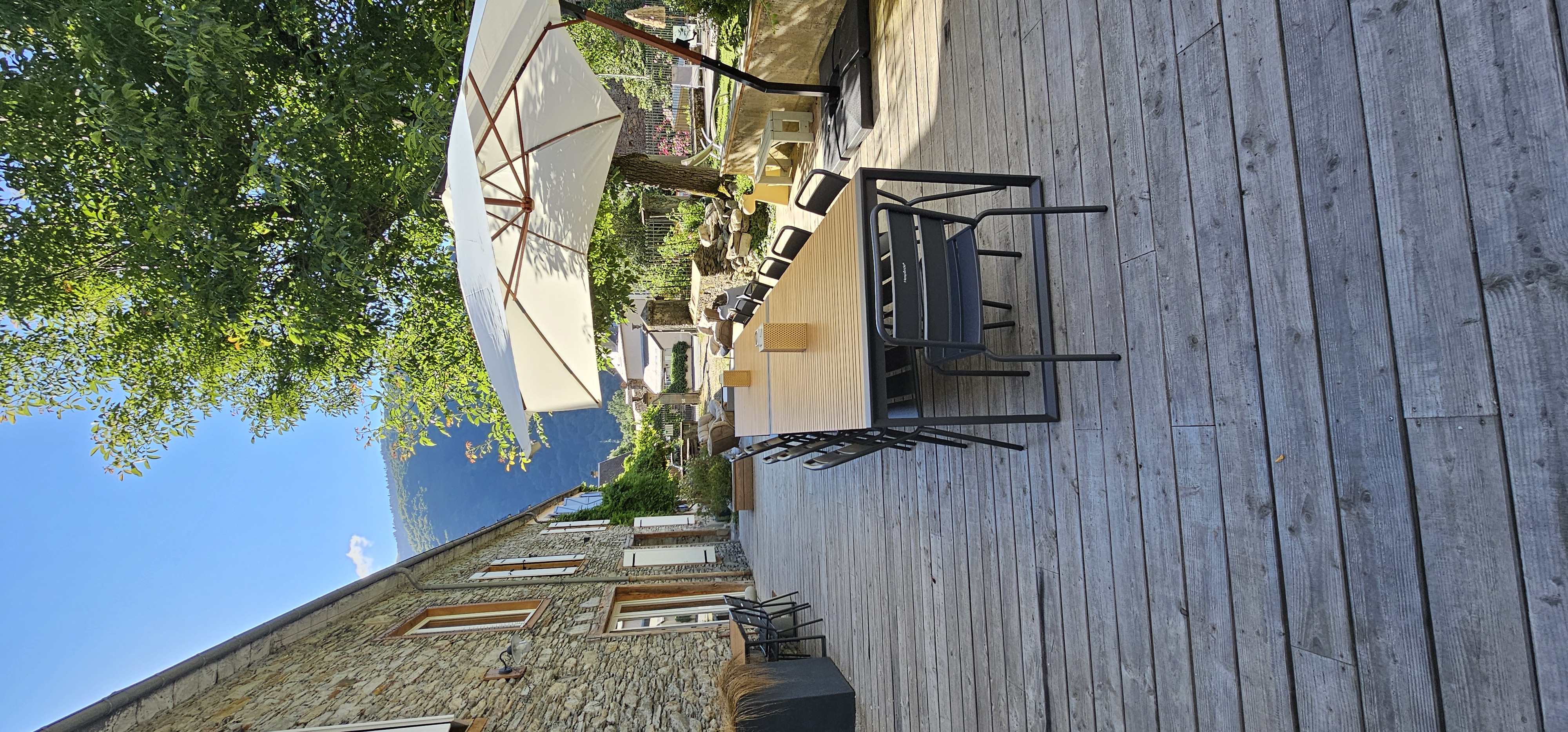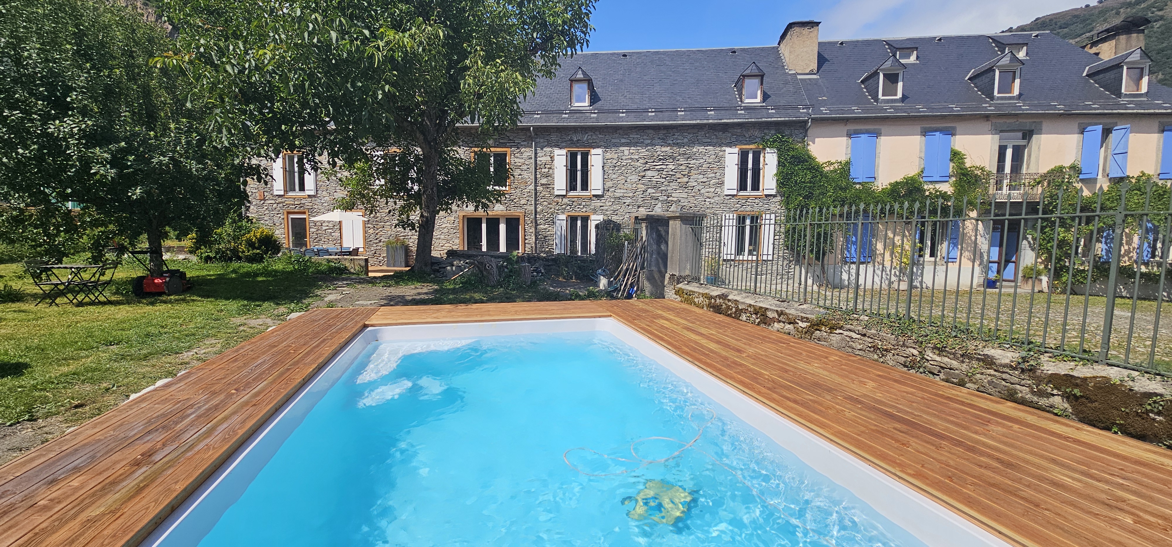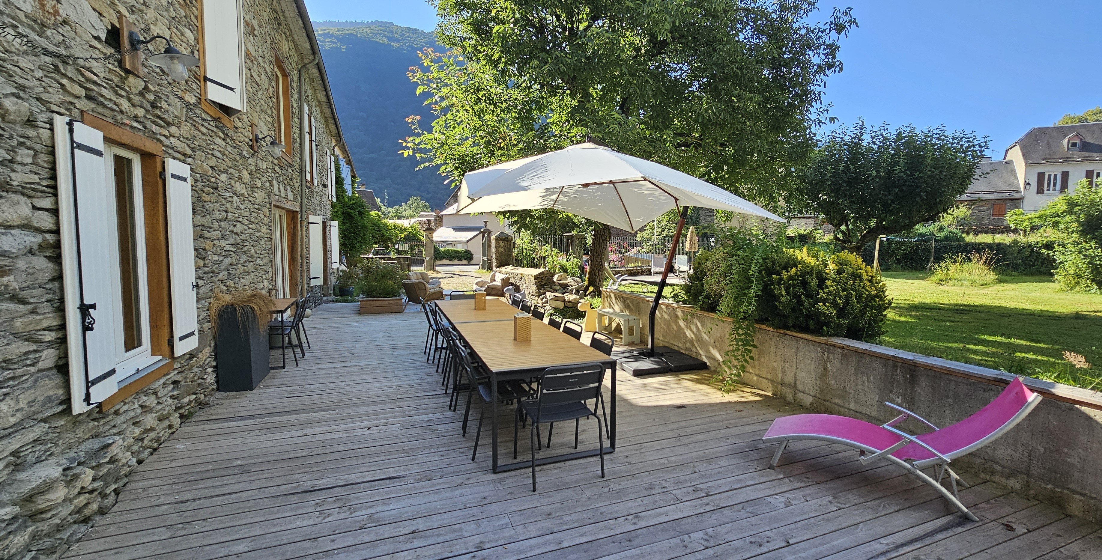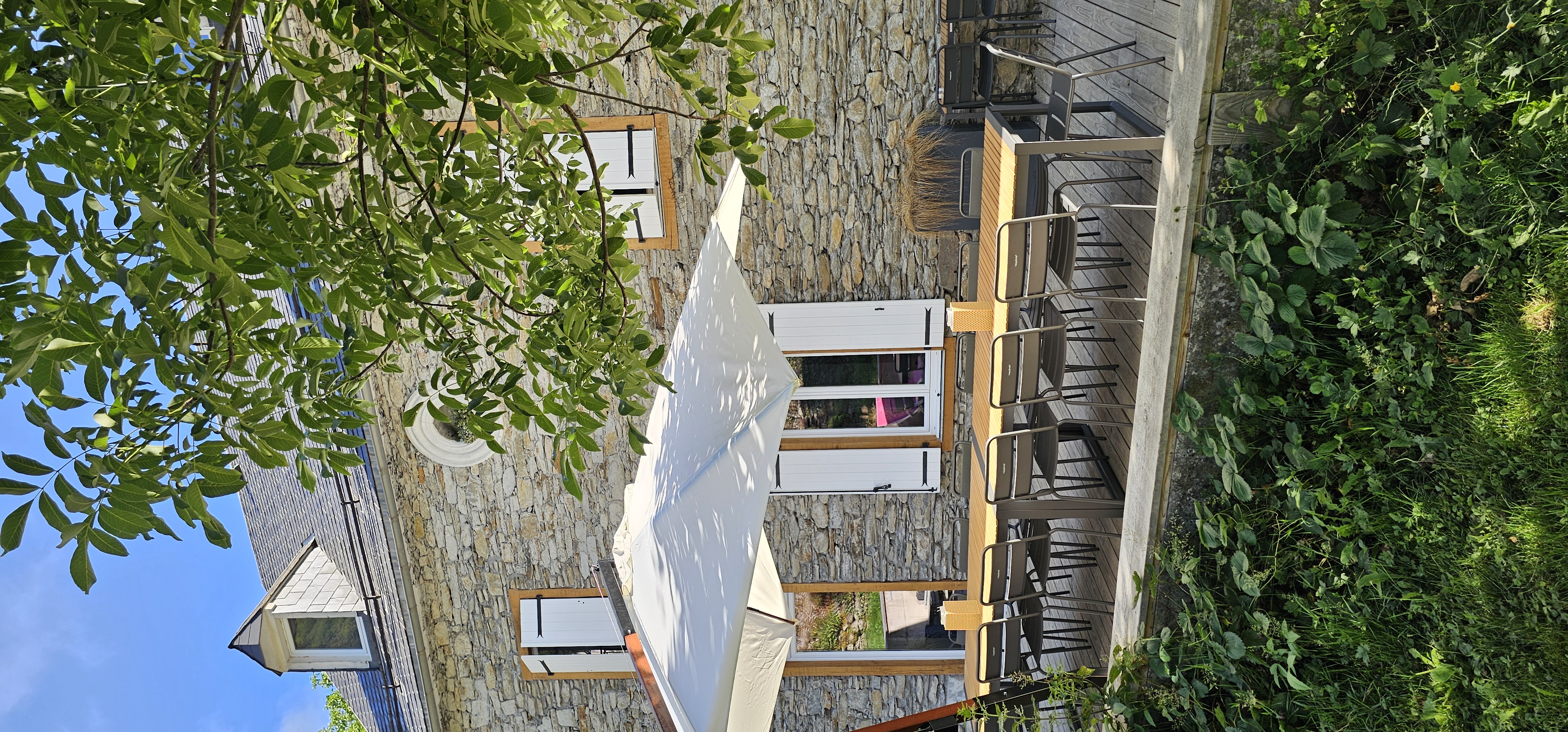 Dehors, c’est une terrasse de 90 m² qui vous attend avec de quoi prendre de bon repas ou vous détendre à l’ombre d’un arbre ou d’un parasol. Enfin, vous pourrez également profiter de notre piscine enterrée ou vous reposer dans le jardin arboré.