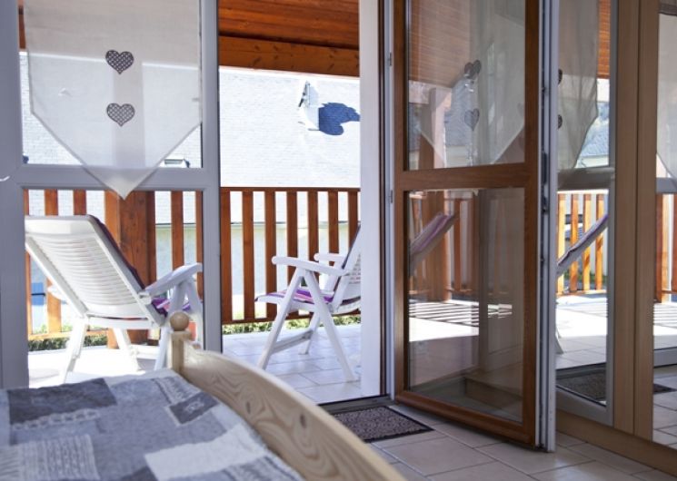 Appartement de 70 m² en duplex situé au 1er étage comprenant : Au rez-de-chaussée, une cuisine américaine équipée, un salon/séjour avec canapé convertible, une chambre donnant sur terrasse (1 lit en 140 et 1 lit en 90), une salle d’eau (douche) et un WC indépendant. A l’étage, une chambre (2 lits en 90) et une salle d’eau (douche). La location bénéficie de 2 terrasses couvertes.