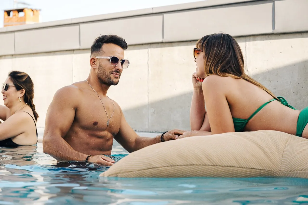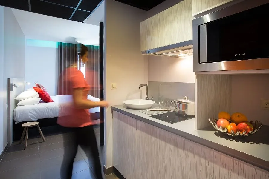 Studio contemporain de 30 m², idéal pour 2 personnes, avec grand lit 180 cm, kitchenette équipée, Wi-Fi, TV et climatisation. Accès inclus : piscine rooftop, sauna, salle de sport et vélos. Parking gratuit à proximité.