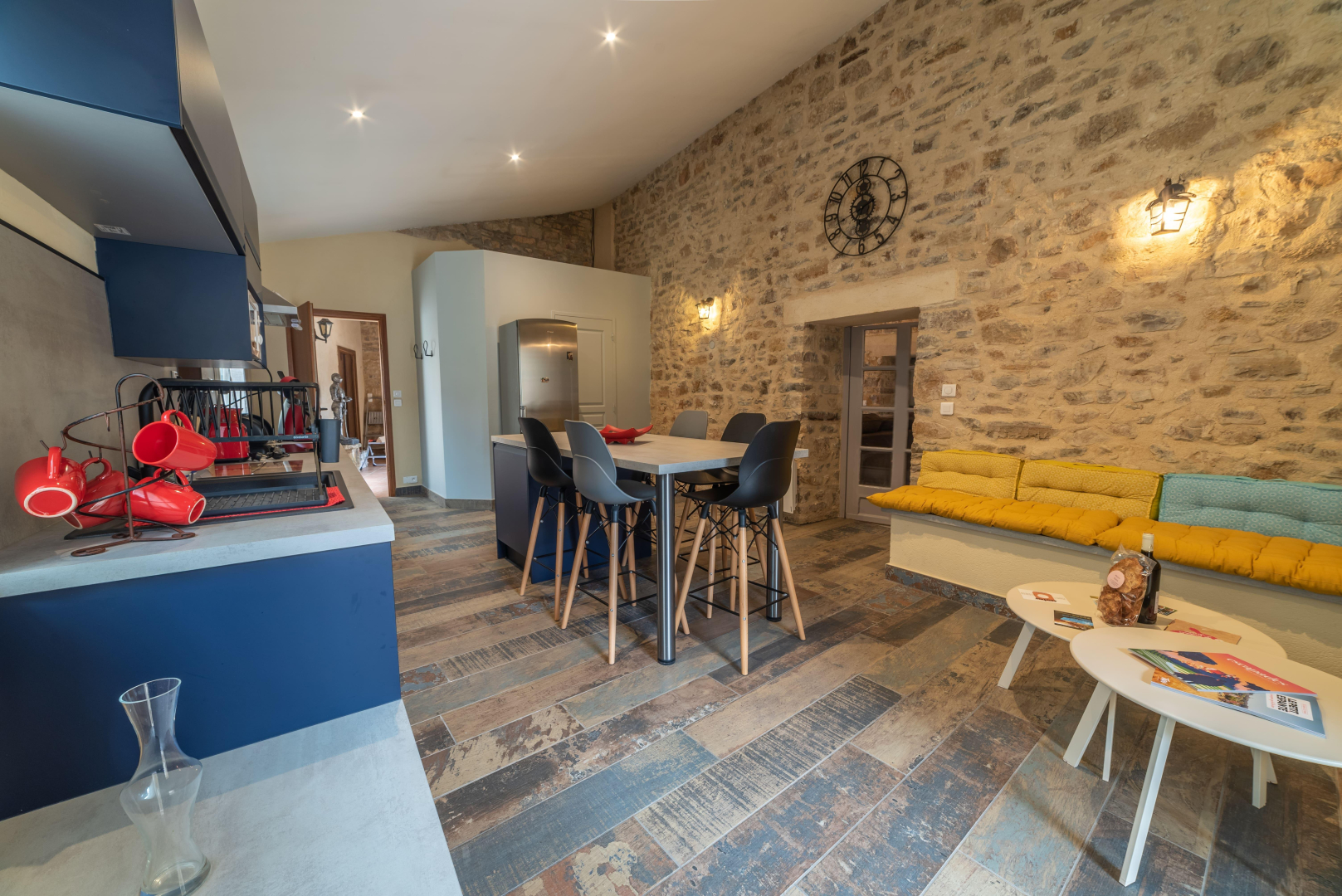 LE MOLIN : salon avec sa grande cheminée vous accueille, pendant que les enfants profitent d’un coin cocooning juste à côté grâce au vidéoprojecteur. Accédez ensuite au balcon et sa surprenante vue. Vous y apprécierez des grillades grâce au barbecue/plancha, sinon, la cuisine / salle à manger est juste à côté.