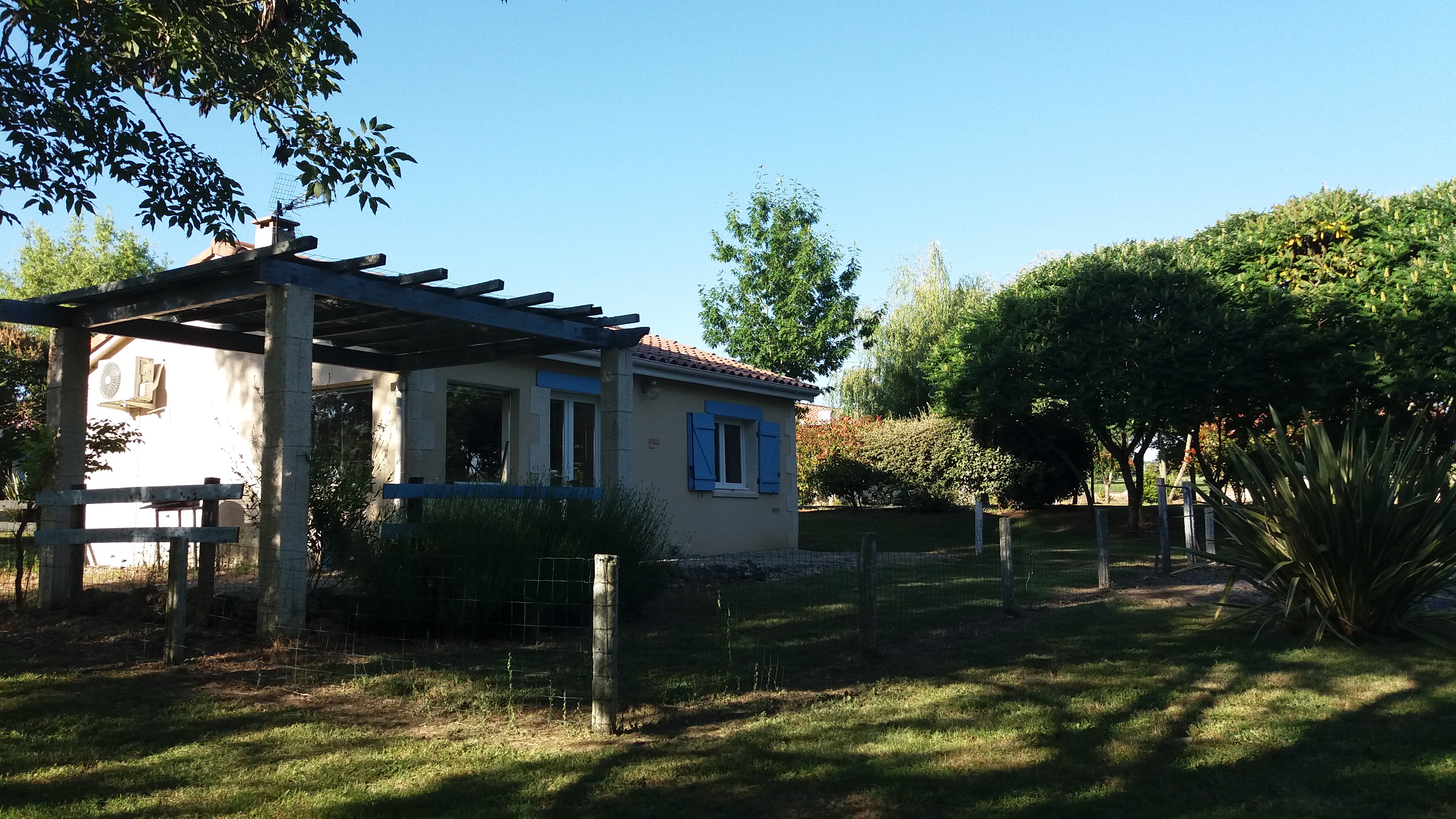 Maison indépendante pour quatre personnes, sur un terrain arboré et fleuri.