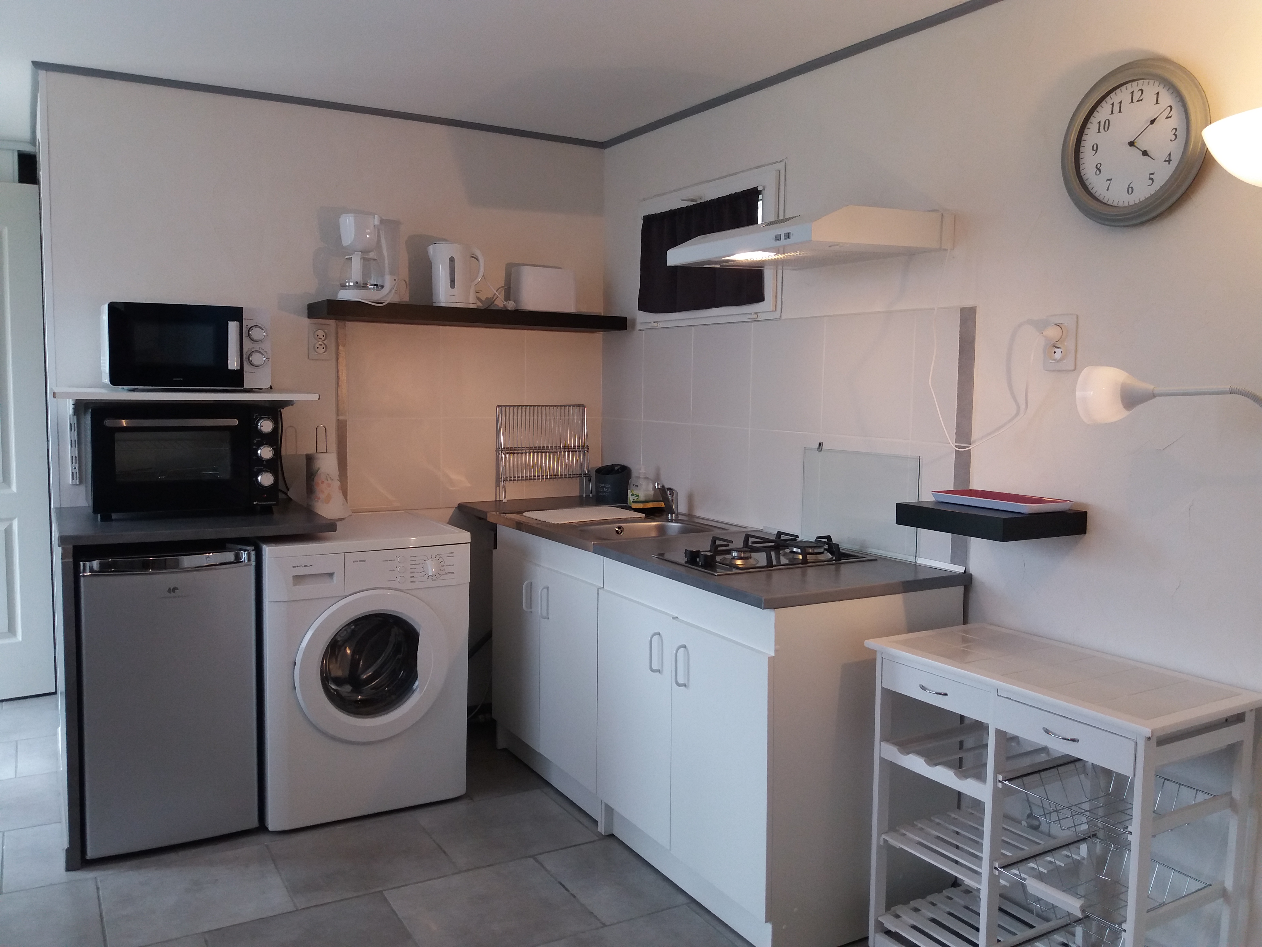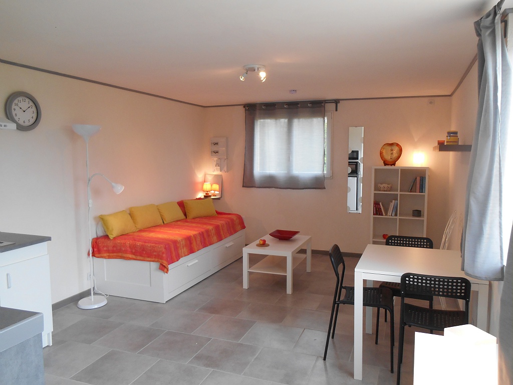 Espace cuisine bien équipé avec lave-linge, espace couchage avec une banquette lit très confortable offrant un couchage en 160×200. salle d’eau wc, grand placard.