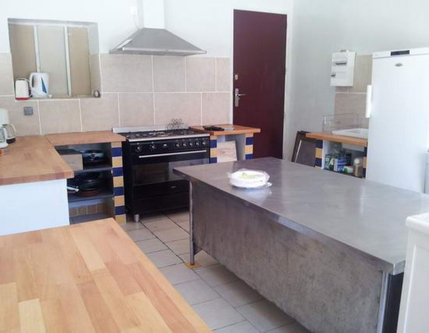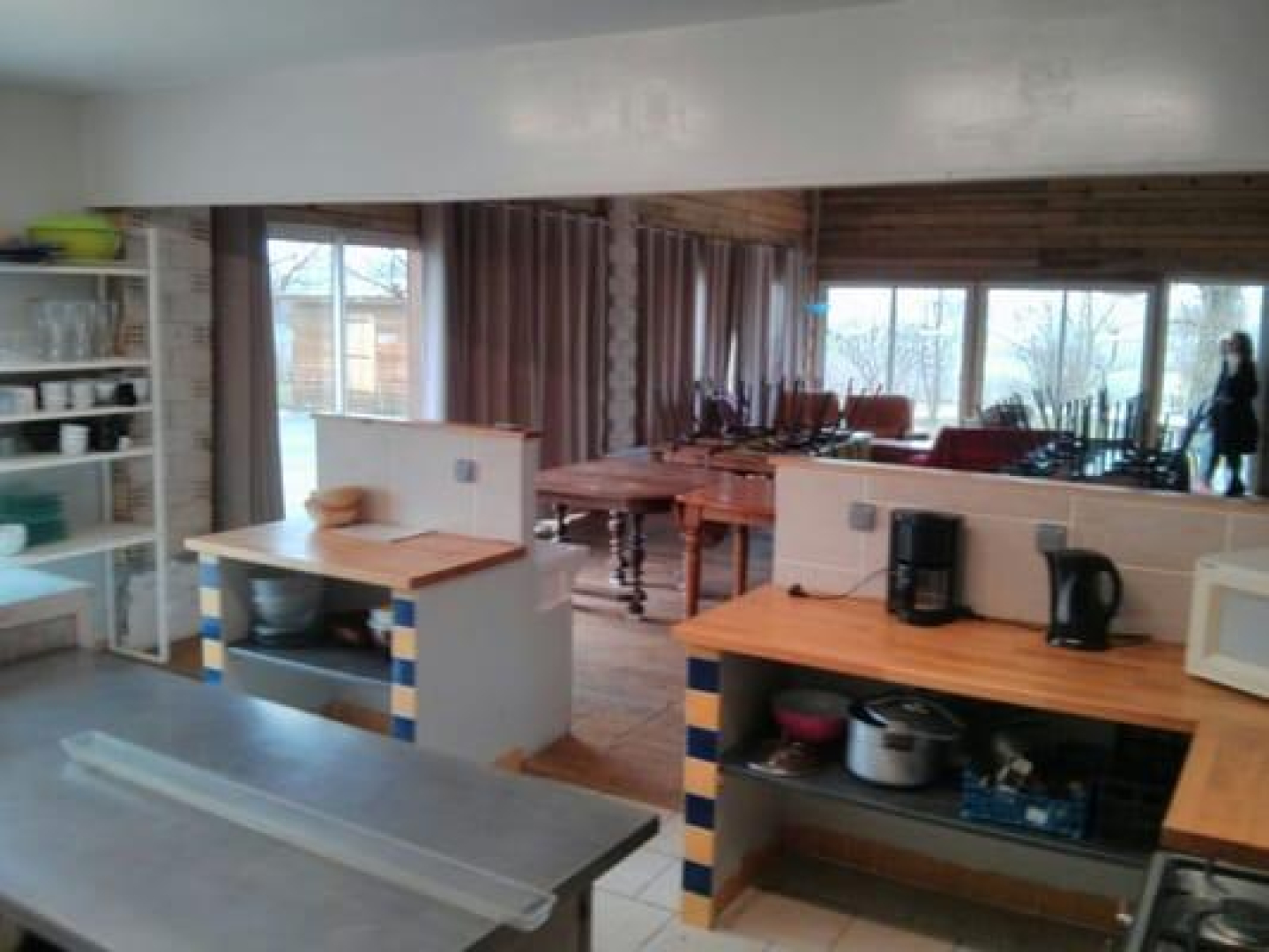Grande salle à manger donnant sur cuisine toute équipée dans un bâtiment.