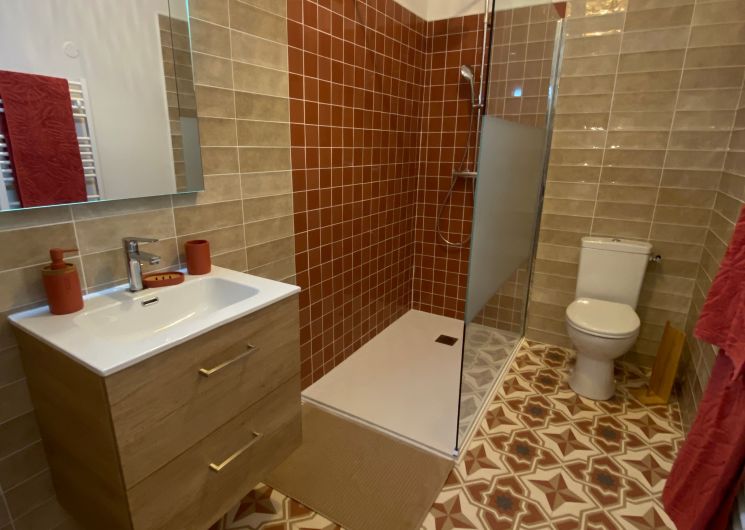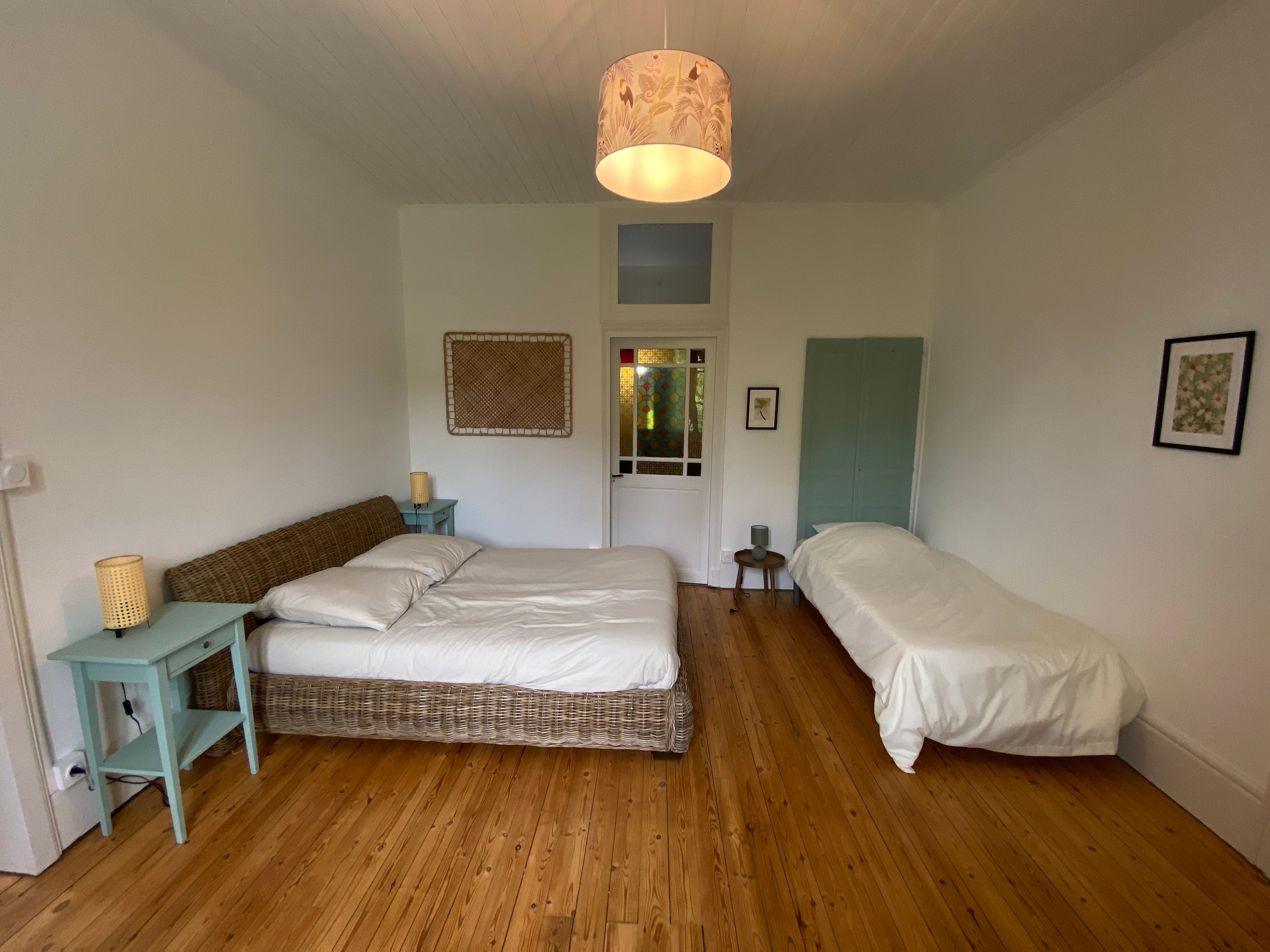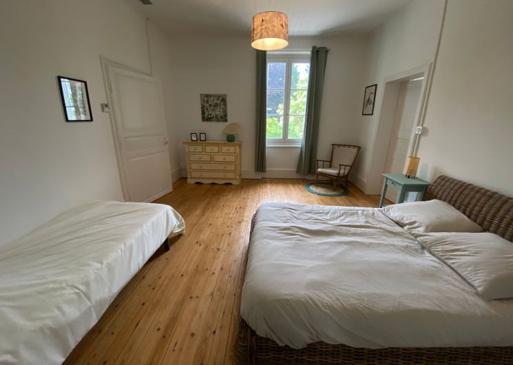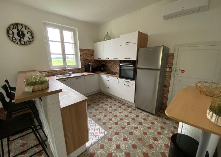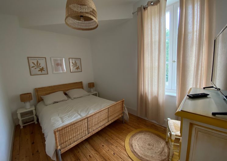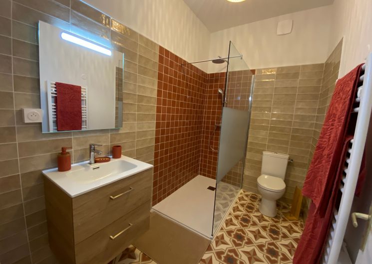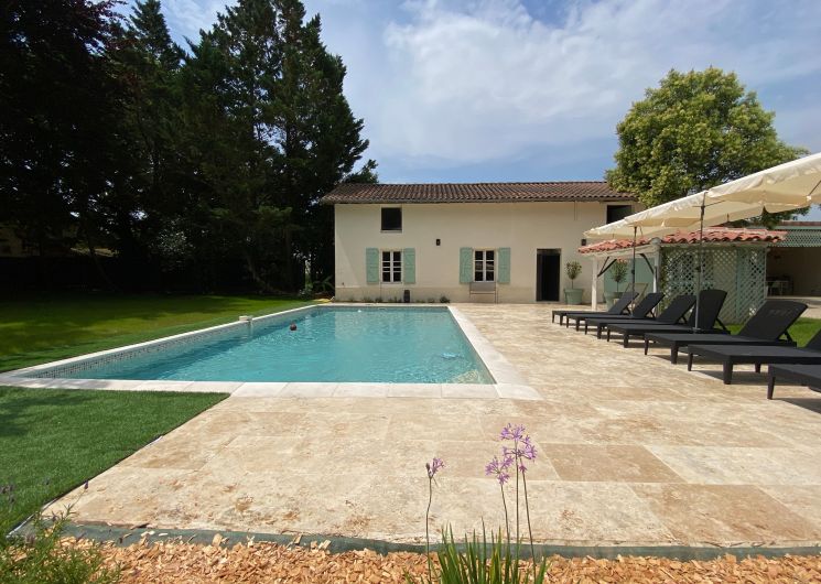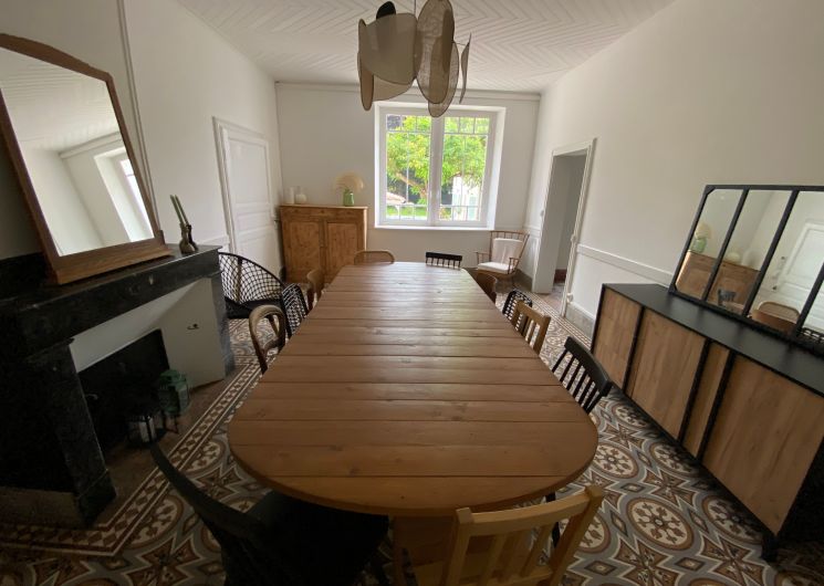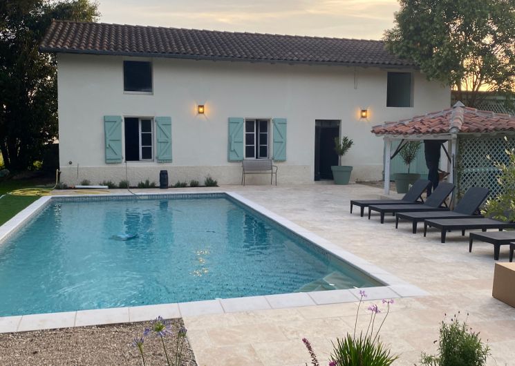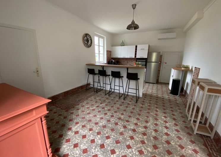 Après quelques marches, vous découvrez un grand couloir qui dessert une cuisine (éléments intégrés avec plaque, four, réfrigérateur, congélateur, lave-vaisselle), bar, une salle à manger. De l’autre côté se trouve le salon avec canapés fauteuils, TV. Par l’escalier en bois, l’étage propose deux chambres se partageant une salle d’eau avec wc et un sas de dégagement avec bureau. De l’autre côté du palier, une chambre avec 1 lit 140 et 1 lit 0,90 salle d’eau avec wc privatifs et une chambre avec 4 lits 0,90 salle d’eau et wc privatifs. Un wc au rez-de-chaussée avec lave-linge. Climatisation dans tout le gîte. A l’extérieur une grande piscine privative au gîte (10×5), jouxtant une terrasse totalement couverte avec salon de jardin chaises barbecue. Grand terrain de 3000 m2 autour du gîte clôturé.