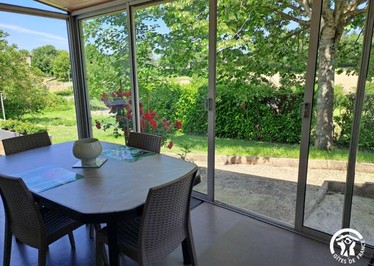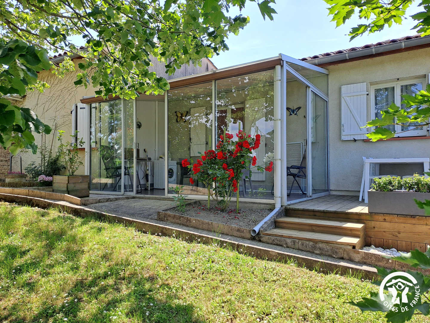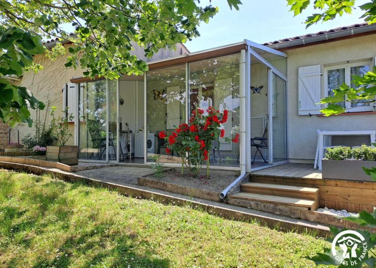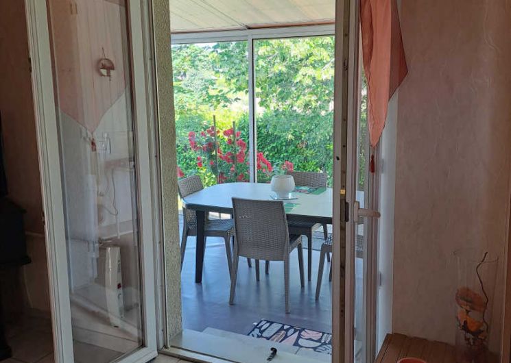 Les extérieurs offrent plusieurs espaces pour profiter du plein air : un jardin partagé, une terrasse aménagée, une véranda lumineuse et du mobilier de détente avec salon de jardin et transats.