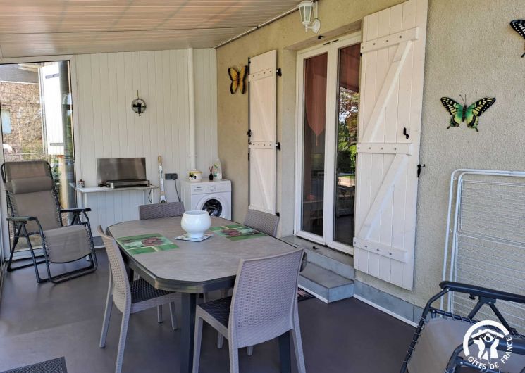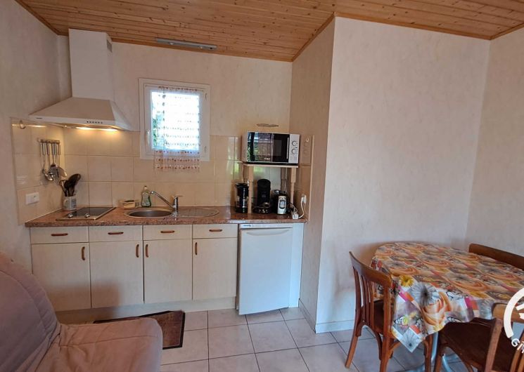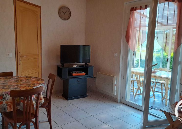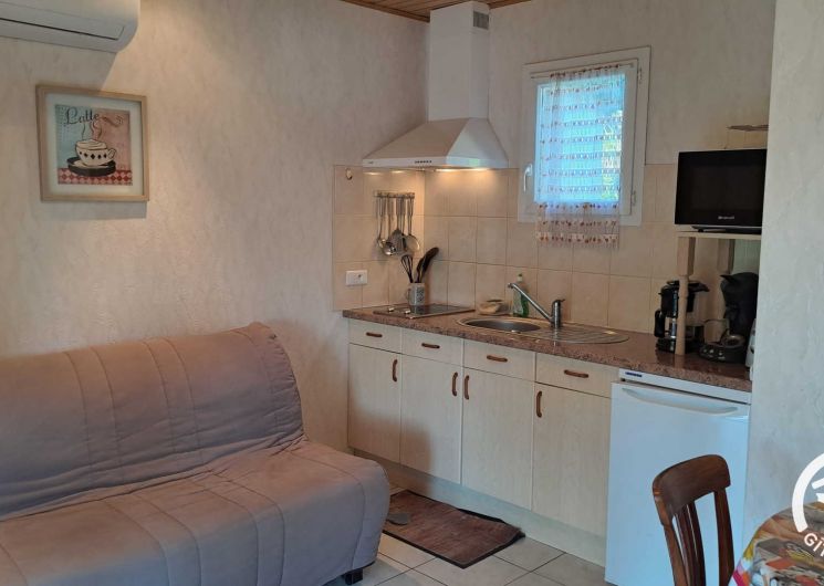 La pièce à vivre regroupe un coin salon avec petit canapé convertible et télévision, une table pour les repas et une cuisine ouverte équipée d’un micro-ondes, d’un réfrigérateur, d’une bouilloire et d’une cafetière à filtre et Senseo. La salle à manger se prolonge dans la véranda, agréable en toute saison, avec une belle table et une plancha.