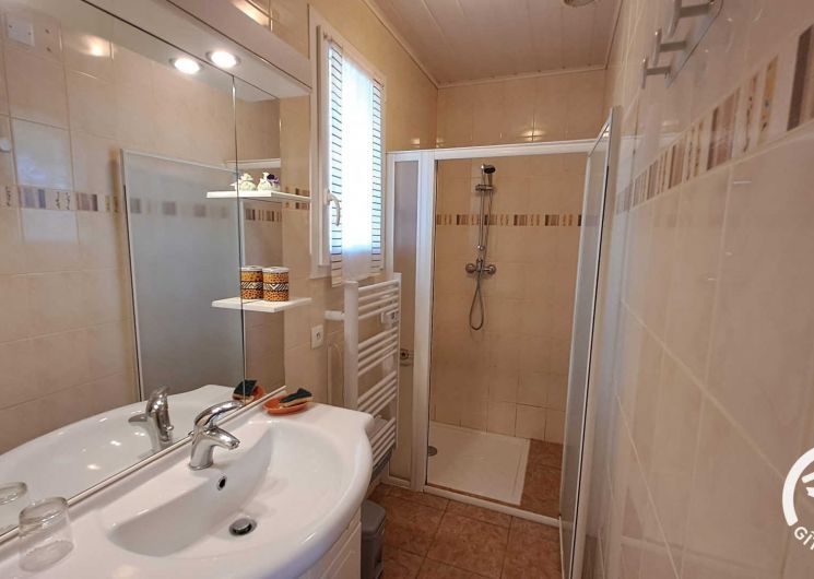 Une salle d’eau avec douche cabine et une grande vasque complète ce niveau, ainsi que des WC indépendants. Le gîte dispose également d’une climatisation réversible pour un confort optimal.