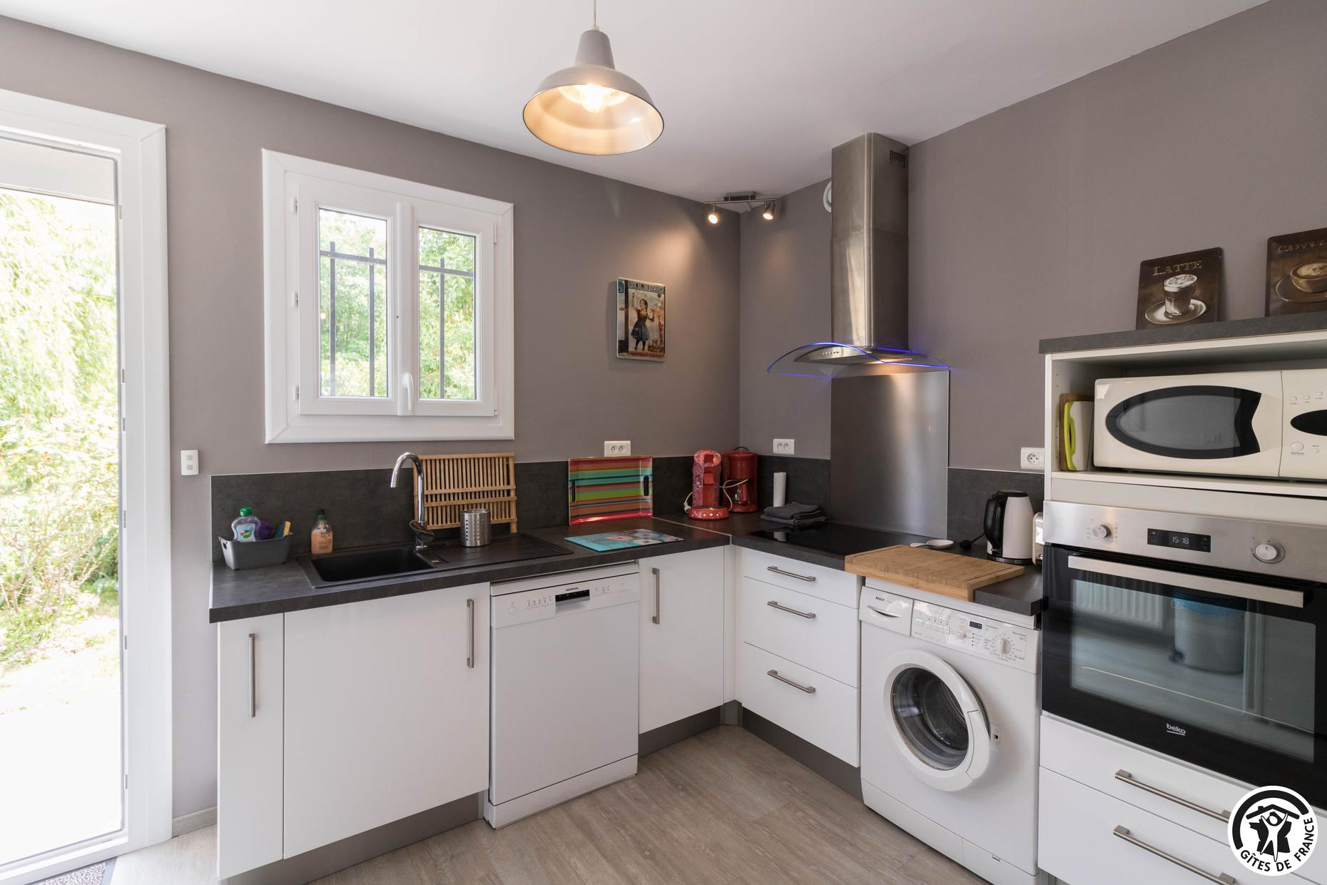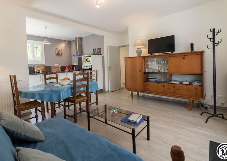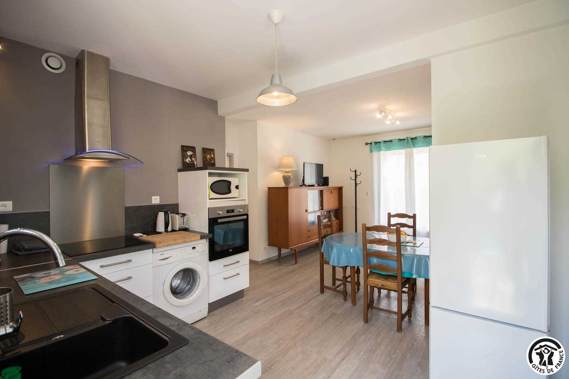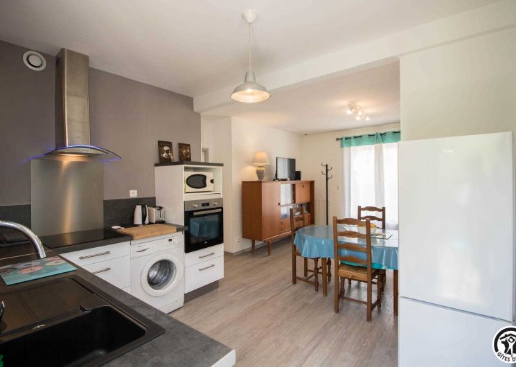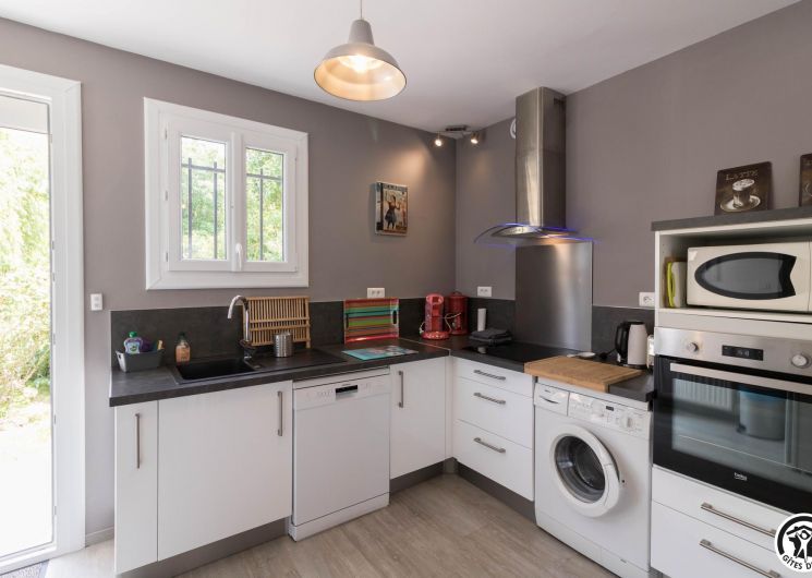 Cette petite maison individuelle tout confort bénéficie d’un grand jardin clos de 1500m² où vous aurez plaisir à vous détendre, que vous soyez là pour les vacances ou pour votre travail. Gîte en rez-de-chaussée accessible par 3 marches depuis la terrasse : entrée, WC indépendant, grand séjour/cuisine équipée : lave linge, lave vaisselle, plaque induction, four électrique, frigo congélateur, accessoires utiles pour cuisiner. Canapé BZ pour couchage complémentaire 140x190cm, 2 chambres (2 lits pour 1 personne en 90cm) (1 lit por 2 personnes en 140cm), salle d’eau. Chauffage central au gaz de ville. Accès Internet wifi.