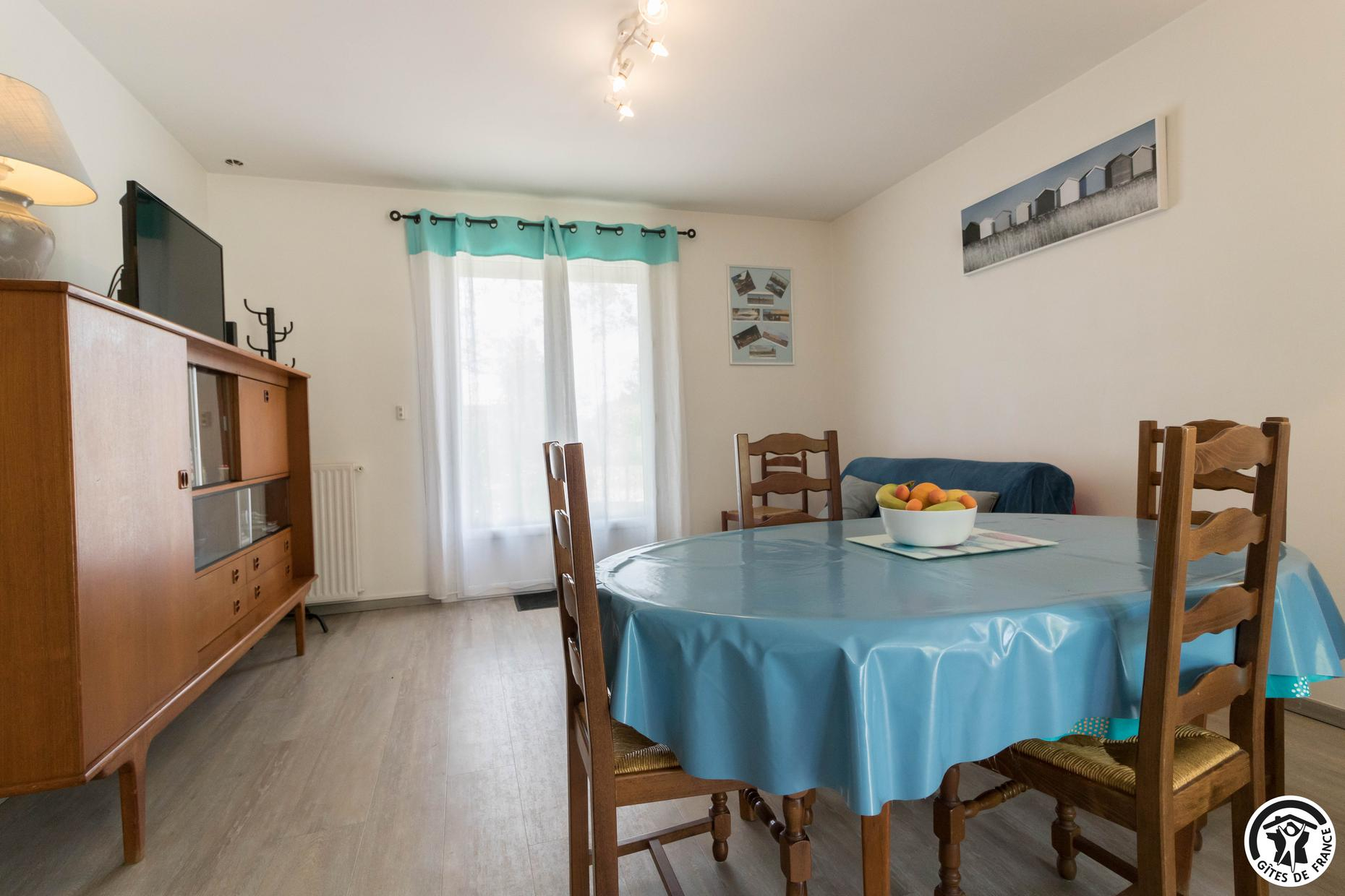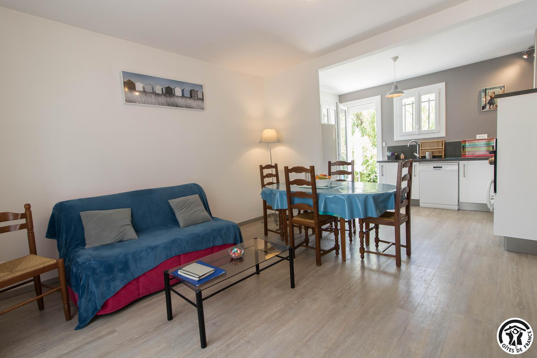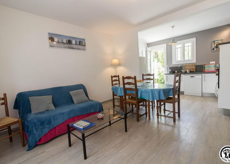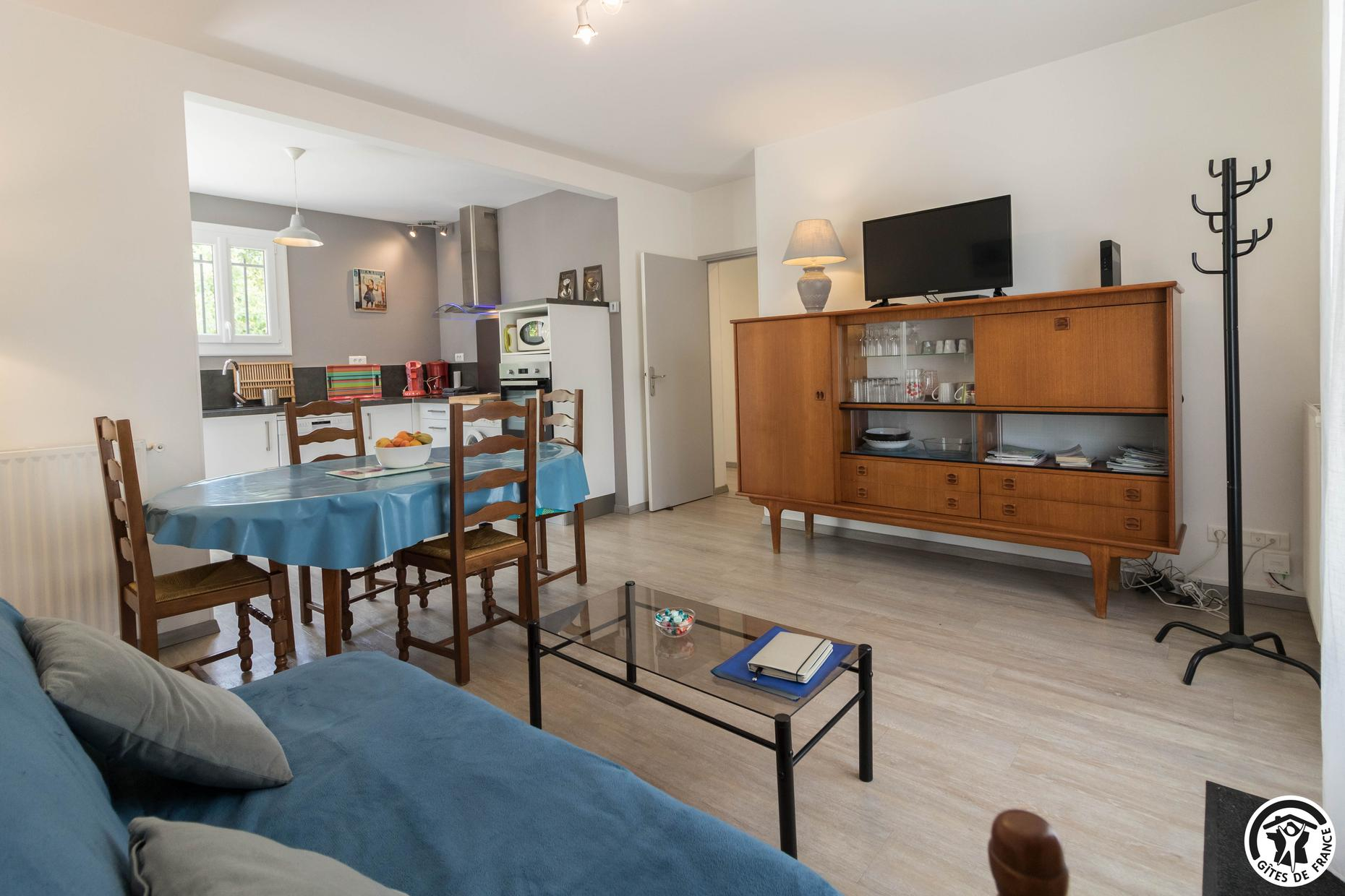 Cette petite maison individuelle tout confort bénéficie d’un grand jardin clos de 1500m² où vous aurez plaisir à vous détendre, que vous soyez là pour les vacances ou pour votre travail. Gîte en rez-de-chaussée accessible par 3 marches depuis la terrasse : entrée, WC indépendant, grand séjour/cuisine équipée : lave linge, lave vaisselle, plaque induction, four électrique, frigo congélateur, accessoires utiles pour cuisiner. Canapé BZ pour couchage complémentaire 140x190cm, 2 chambres (2 lits pour 1 personne en 90cm) (1 lit por 2 personnes en 140cm), salle d’eau. Chauffage central au gaz de ville. Accès Internet wifi.