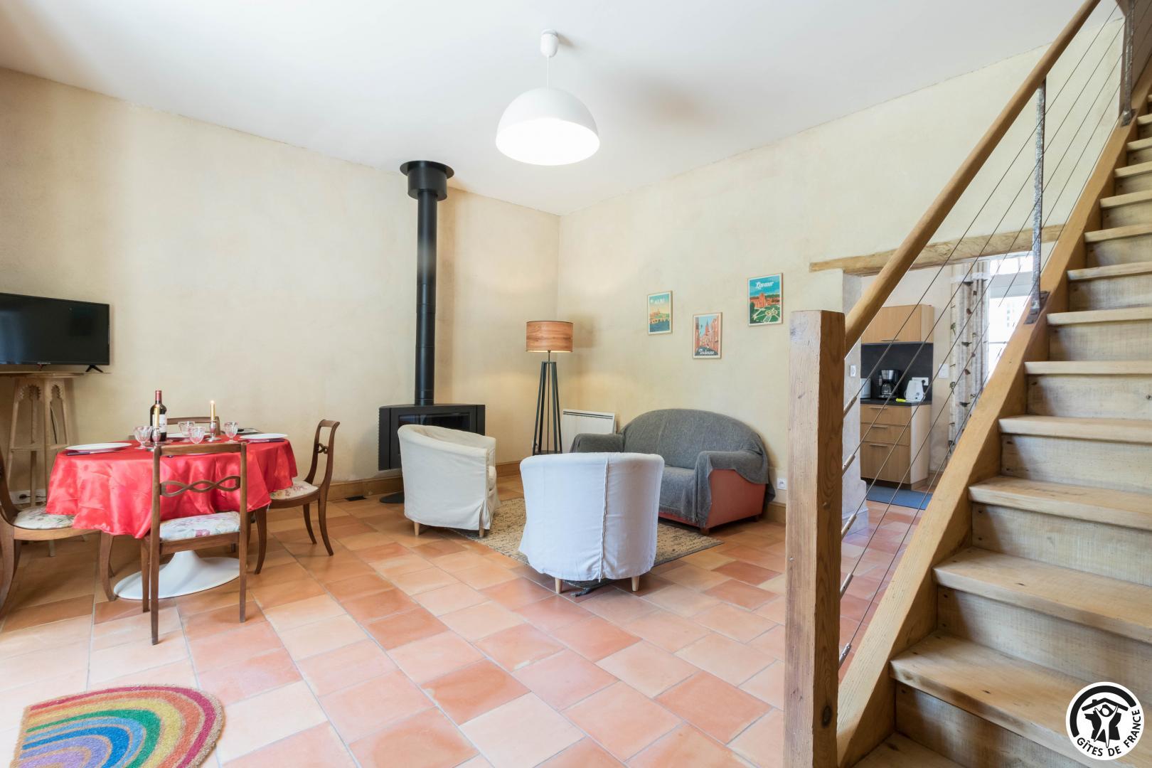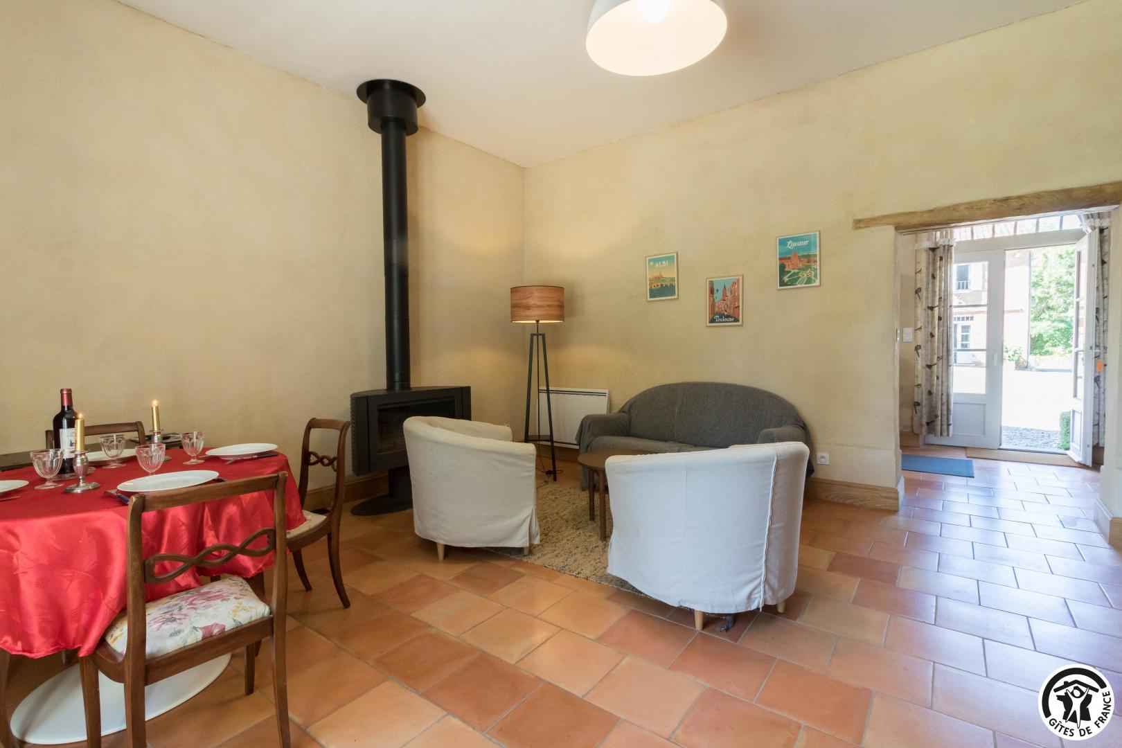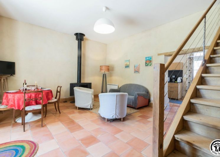 – Au rez-de-chaussée : une cuisine intégrée ouvrant sur l’entrée, une buanderie (lave-linge) avec WC, ainsi qu’un grand séjour (poêle à bois).