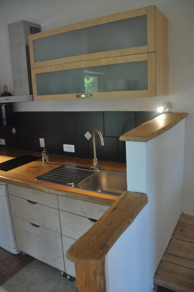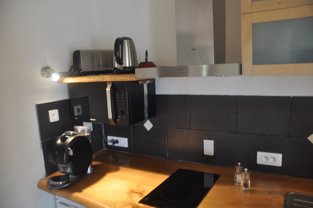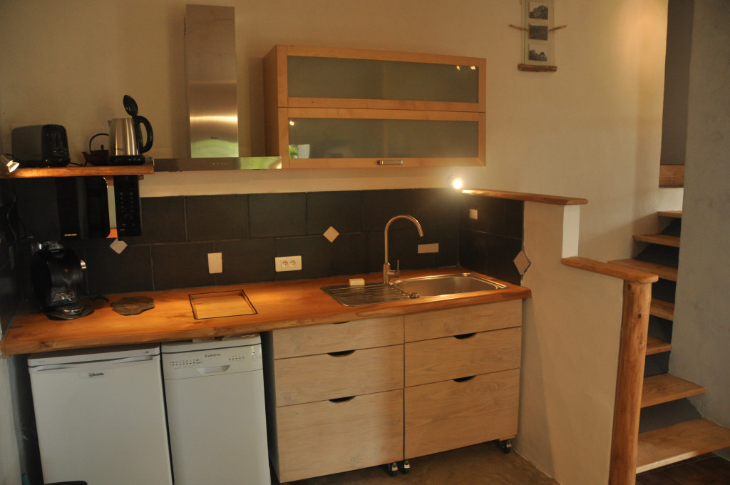 Il se compose d’une chambre et d’une grande pièce à vivre cuisine salon de 40m² organisée autour d’un poêle à bois qui est là pour la saison froide et vous permettre de passer d’agréables soirées au coin du feu dans une ambiance cosy.