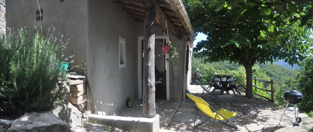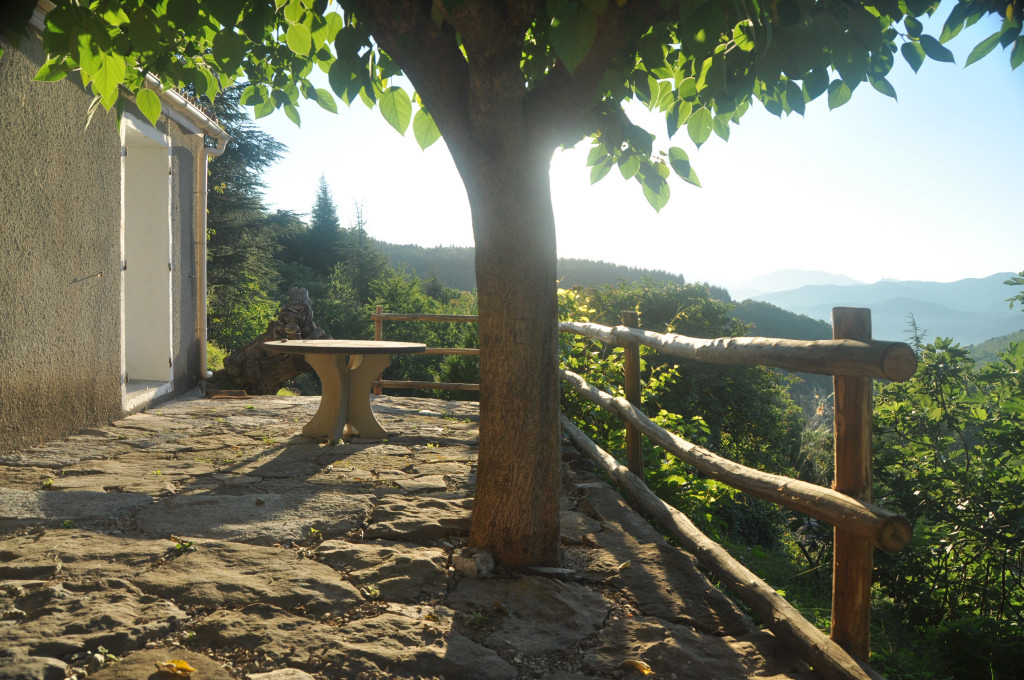 A l’extérieur on débouche sur une terrasse exposée plein sud avec vue dominante. Selon votre programme vous y petit déjeunerez avec les premiers rayons de soleil avant de partir en balade et de la retrouver pour un apéro-barbecue mérité ou vous y ferez tranquillement la sieste dans un hamac à l’ombre des arbres…. A vous de voir