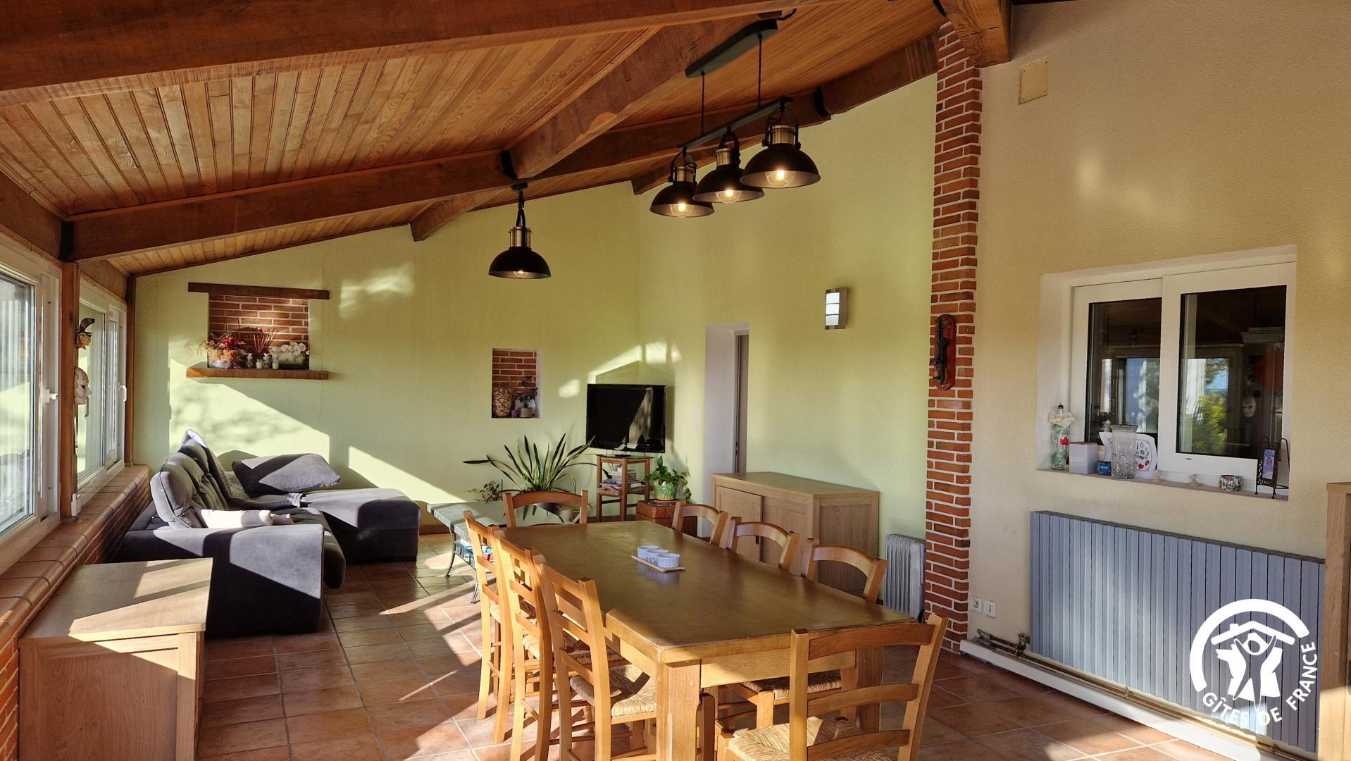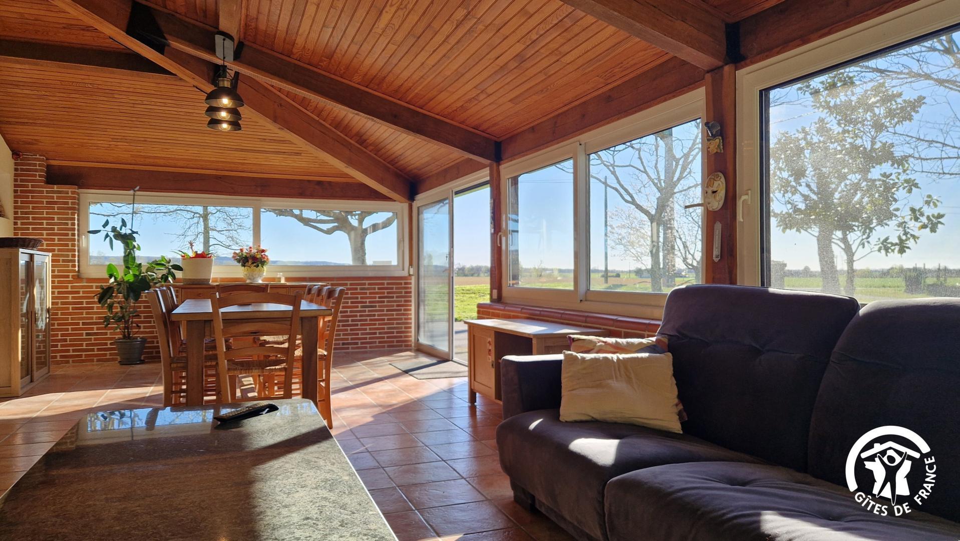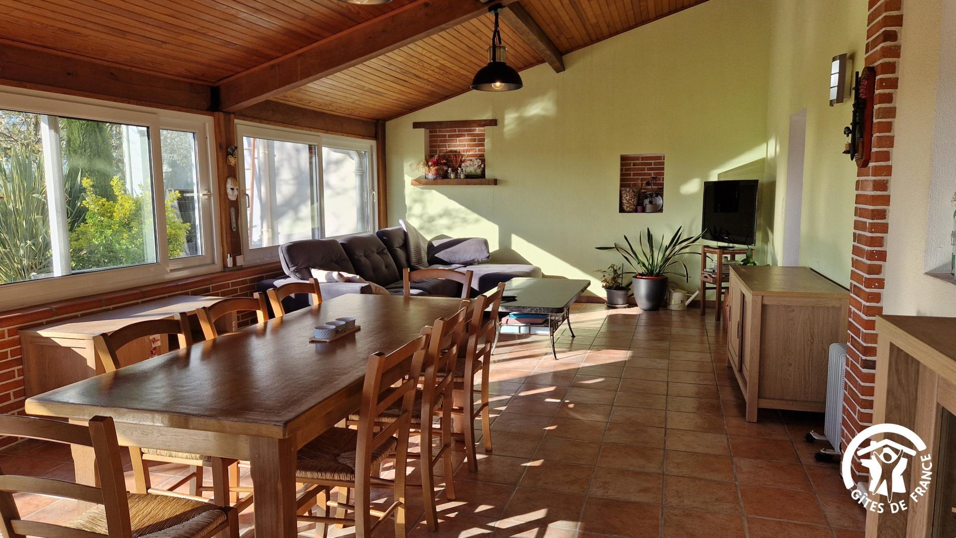 – véranda avec table à manger et salon avec canapé convertible pour un couchage pour 2 personnes supplémentaires