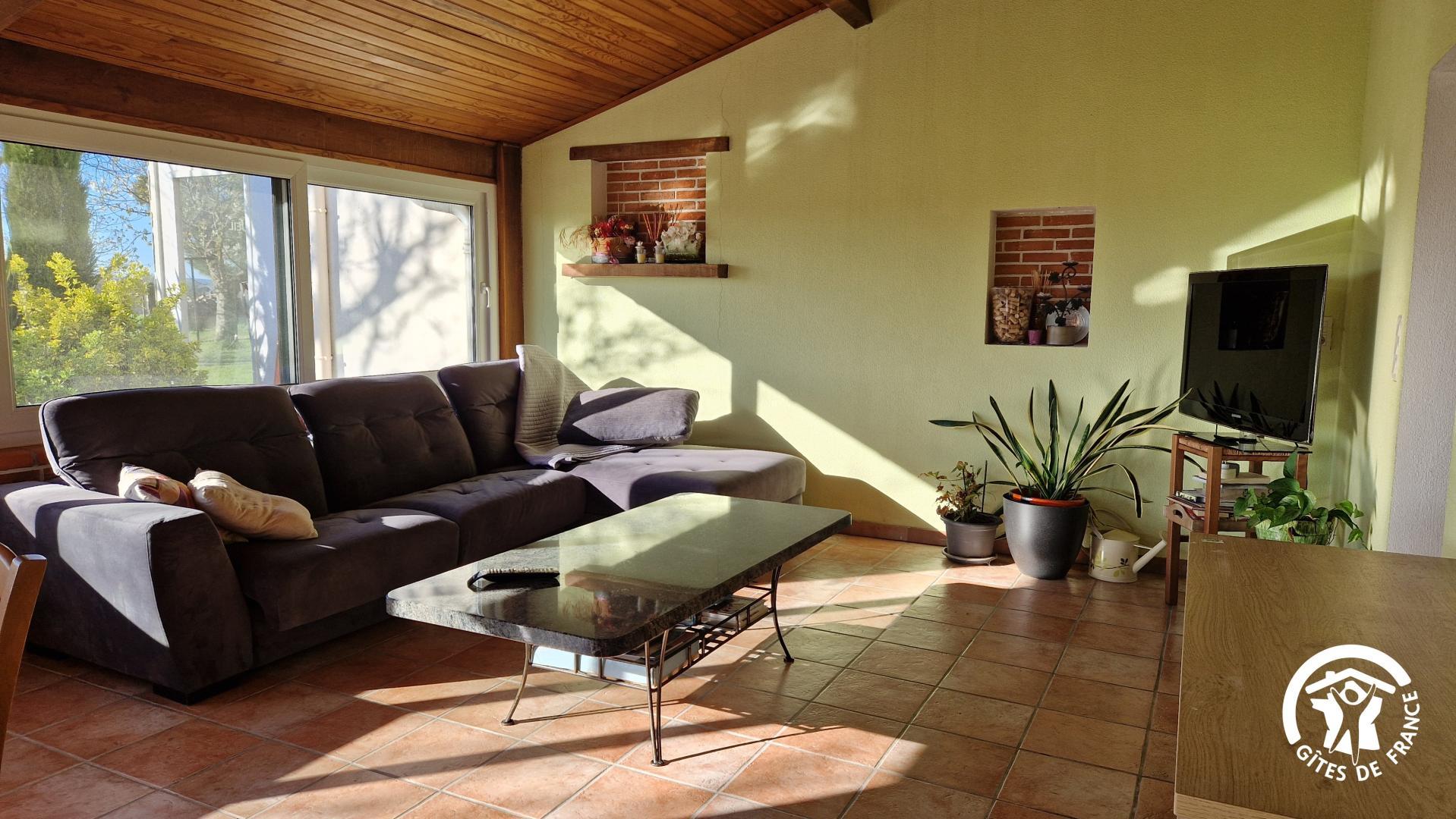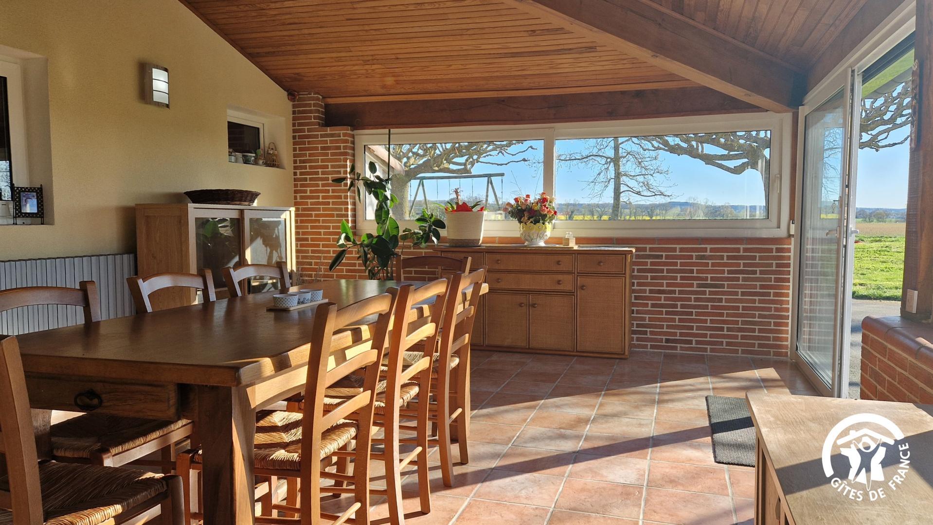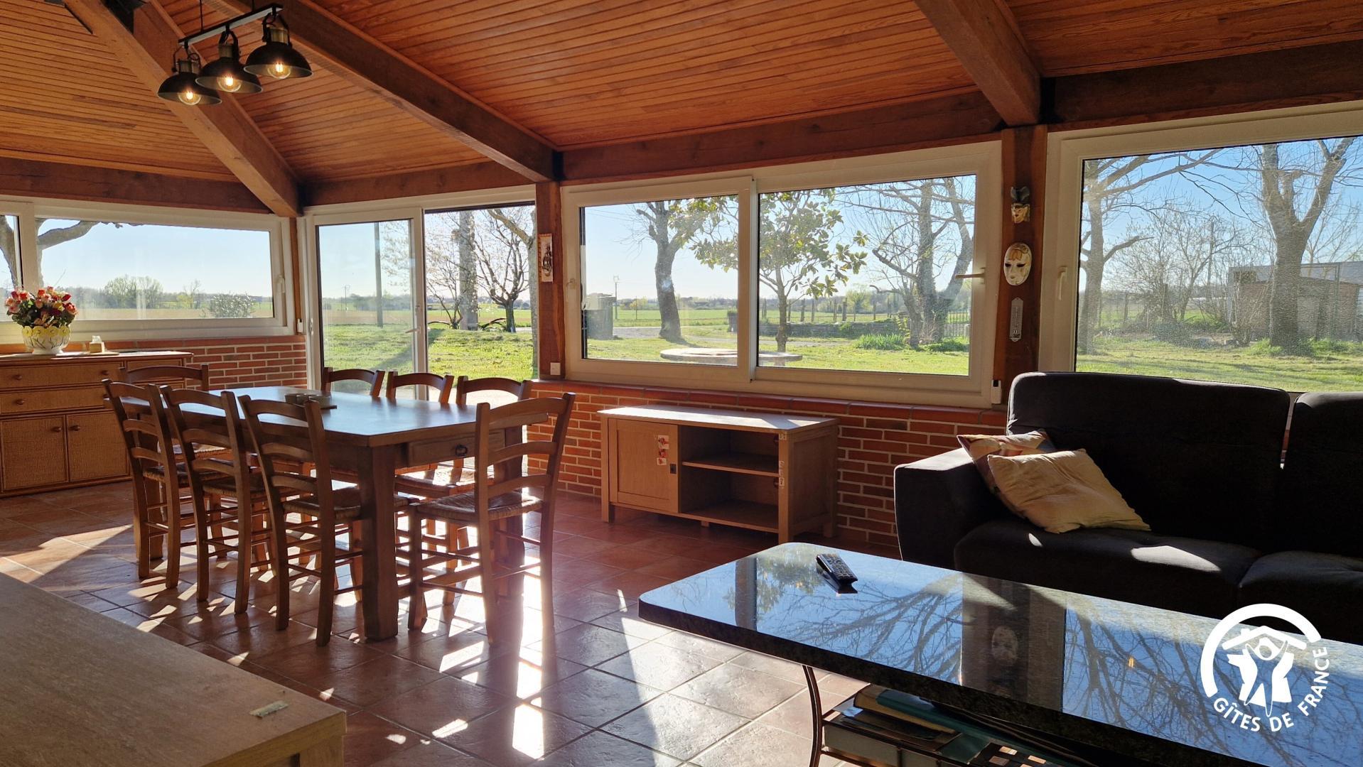 – véranda avec table à manger et salon avec canapé convertible pour un couchage pour 2 personnes supplémentaires