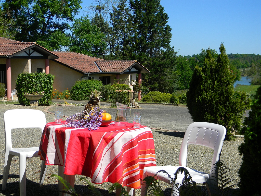 Jardin fleuri, 5 000m² privé face au lac, parking ombragé.
