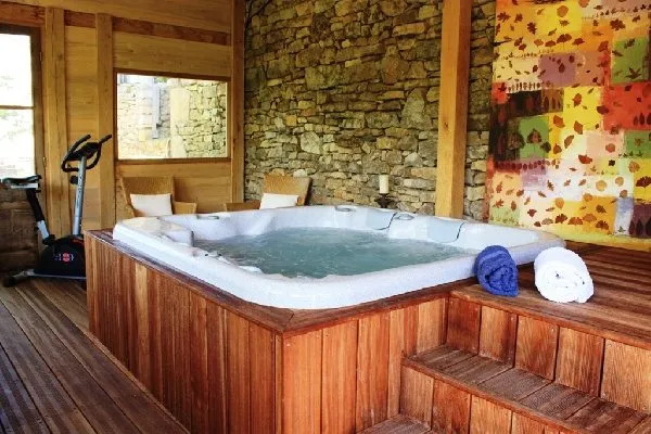 Piscine avec vue sur la vallée, jacuzzi et tennis.