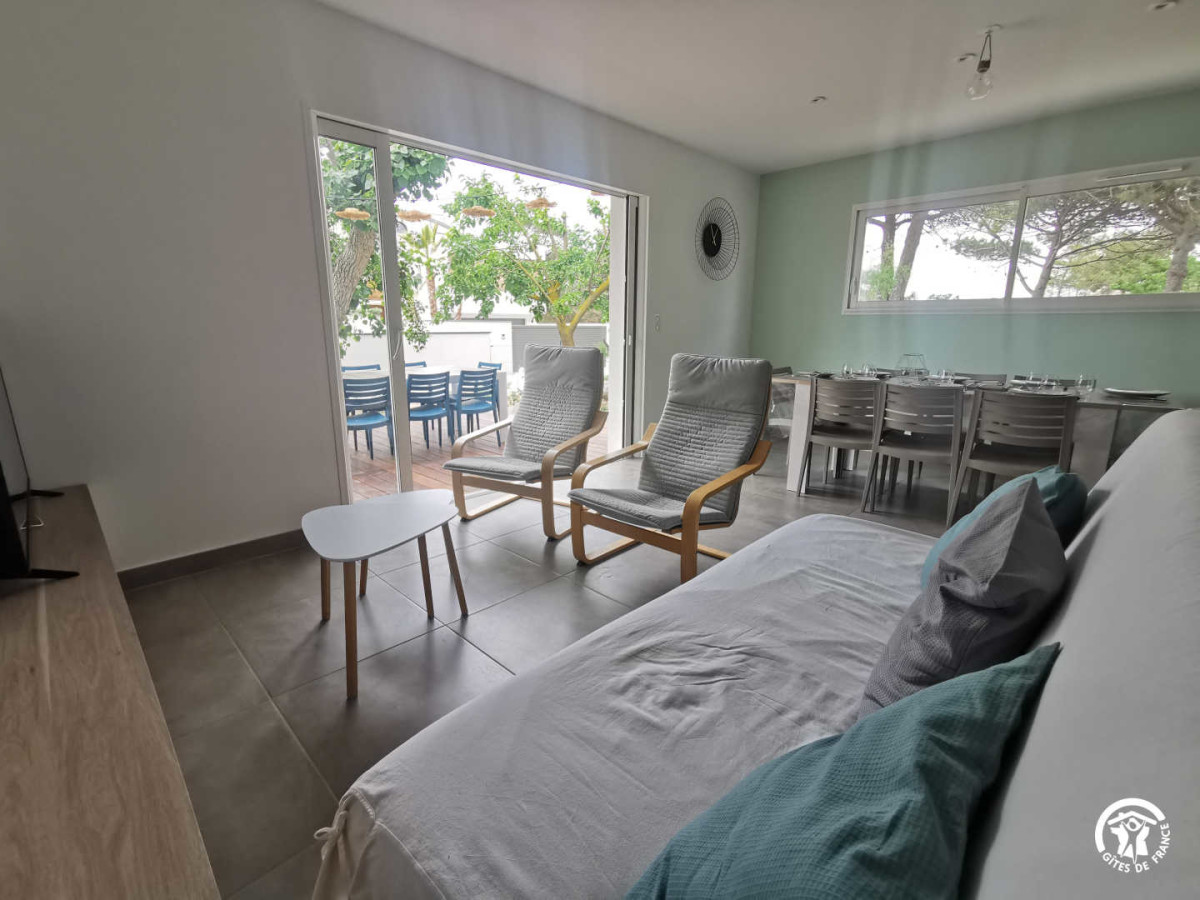 ..), retrouvez cette villa neuve vue mer pour 4 personnes avec 2 chambres. Au rez-de-chaussée, vous aurez accès à un spacieux espace de vie comprenant salon/salle à manger, ainsi qu’une cuisine toute équipée (lave-vaisselle, four, micro-ondes, électroménager..). Tout est sur place pour vous concocter de bons plats ! Cet espace s’ouvre sur une belle terrasse comprenant mobilier de jardin, bains de soleil et barbecue. Une chambre se trouve également au rez-de-chaussée (160×190) ainsi qu’une salle d’eau avec douche et WC. A l’étage, vous trouverez 1 chambre lumineuse avec vue sur mer et accès au balcon (avec un lit en 140×200 ). Et enfin, un WC indépendant ainsi qu’une salle de bain avec baignoire sont également à l’étage. Le stationnement est facile le long de la maison pour 2 voitures. Vous aurez également accès à un garage où des vélos sont mis à disposition ainsi qu’un espace buanderie avec lave-linge. Plancher rafraichissant et WIFI. Les draps et le linge de toilette sont en options: – Draps : 12€/lits – Linge de toilette : 5€/pers Le ménage est inclus dans le tarif. Réduction de -15% pour les séjours de 7 nuits et plus sur les périodes suivantes : Vacances de pâques 2025, Juin 2025, Septembre 2025. Animaux acceptés et fêtes interdites. ATTRAITS TOURISTIQUES : Accès plage à 2 min à pied, proximité du grau d’Agde (station familiale et port de pêche). Cap d’Agde, Marseillan, Sète, l’étang de Thau (parcs ostréicoles), Béziers, Pézenas, Canal du Midi, sports nautiques, plages.