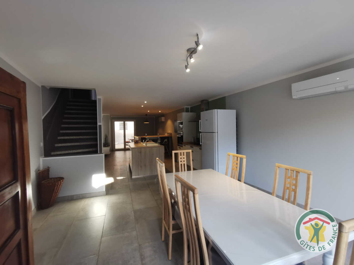Au premier étage, vous entrez dans une pièce à vivre de près de 45m². Vous y trouverez un espace salle à manger, une cuisine (cafetière à filtre) et un espace salon qui s’ouvre sur une terrasse aménagée avec Barbecue. Un WC séparé complète l’espace. Au deuxième étage, vous profiterez de trois chambres. La première, avec son lit double (140×200) et son dressing, est ouverte sur une terrasse privative. Les deux chambres suivantes sont en enfilade. La première est également une chambre double (140×200) avec ouverture sur une terrasse privée. La seconde est composée de deux lits de 90×200. La salle de bain – WC complète l’étage (sèche cheveux à disposition). Le rez-de-chaussée, quant à lui, accueille un garage idéal pour motos ou deux véhicules. Un supplément électricité peut être demandé sur place en fonction de la consommation. Nécessaire de nettoyage (aspirateur, éponges, produits nettoyants, etc.) ATTRAITS TOURISTIQUES : Pézenas (ville d’art où séjourna Molière), Servian (village médiéval, église fortifiée du XIIème, Jardin Saint Adrien), Villeneuvette (manufacture royale), le Cirque de Mourèze, Agde (cité phocéenne), Marseillan. Lac du Salagou. Béziers.