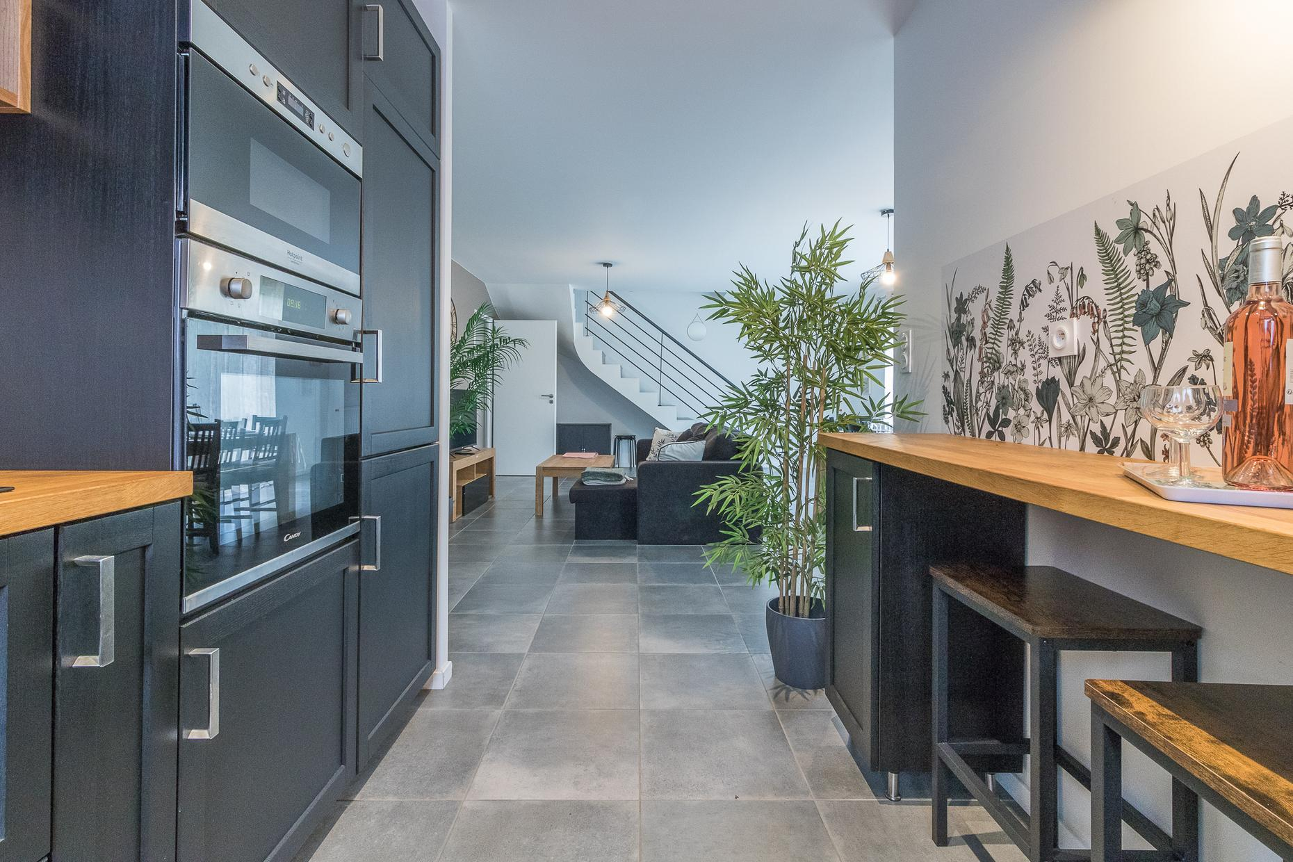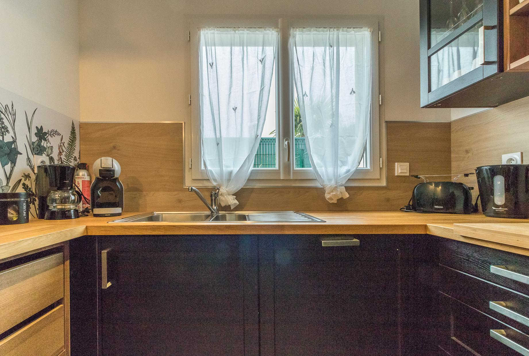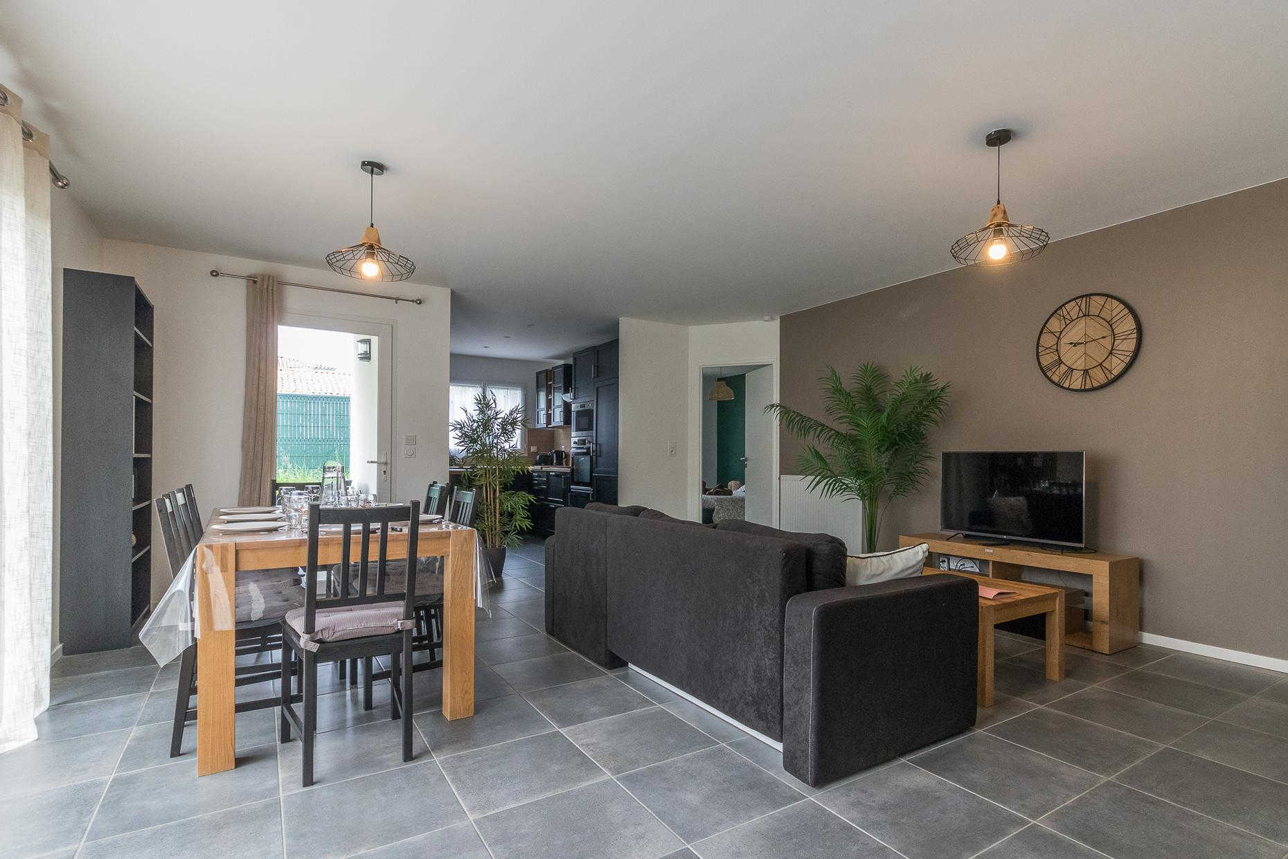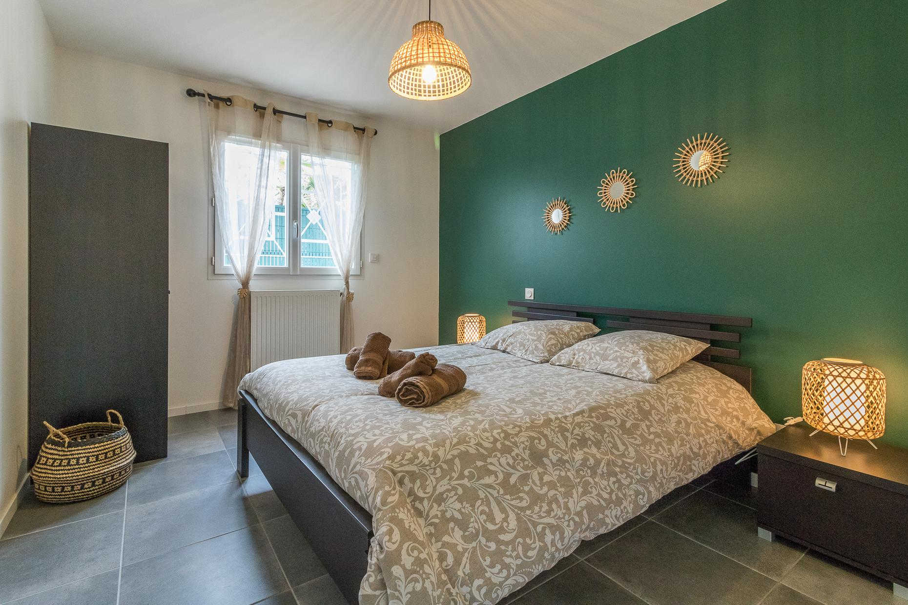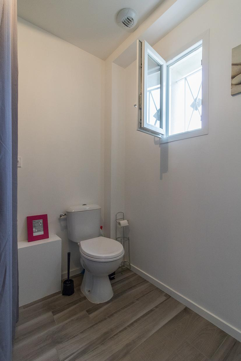 Au rez-de-chaussée : 1 chambre (1 lit double en 140*190cm) avec salle d’eau privative, un salon lumineux, une cuisine entièrement équipée, une entrée et des WC.