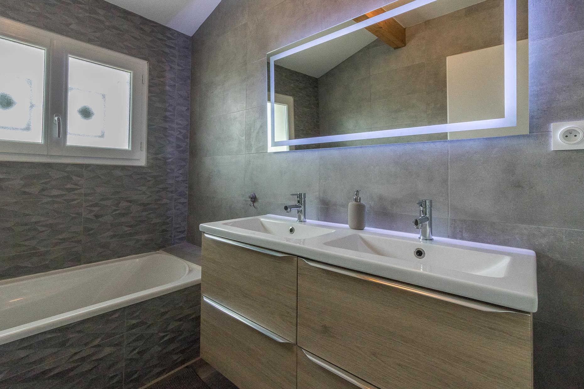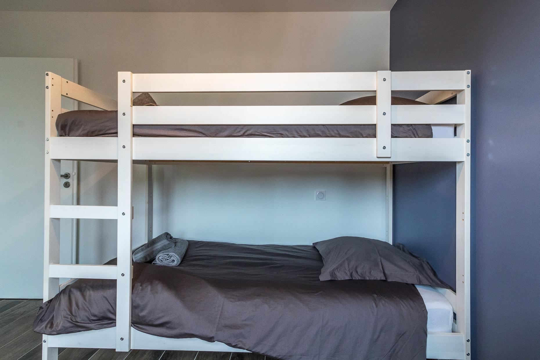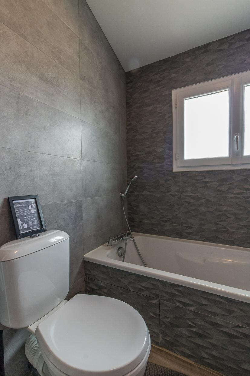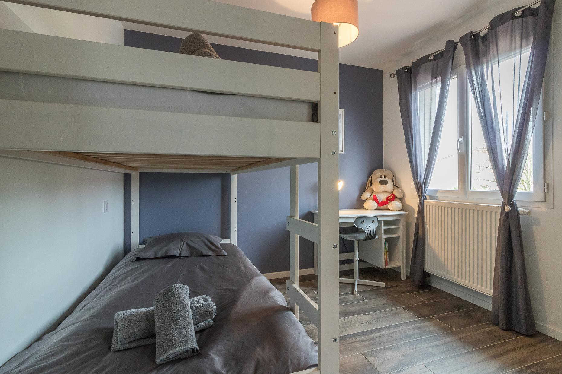 A l’étage : 3 chambres décorées avec goût (1 lit double en 140*200cm),(1 lit double en 160*200cm)(2 lits superposés en 90*190cm), une salle de bains moderne avec baignoire, douche et WC.