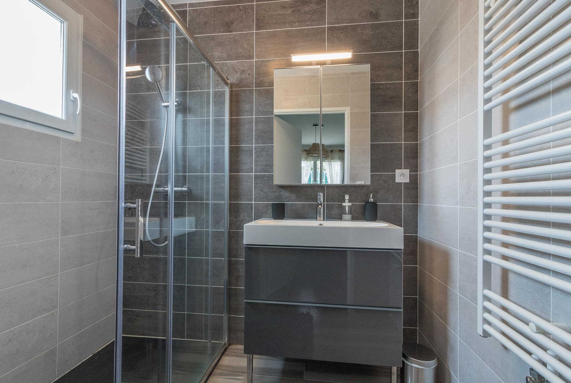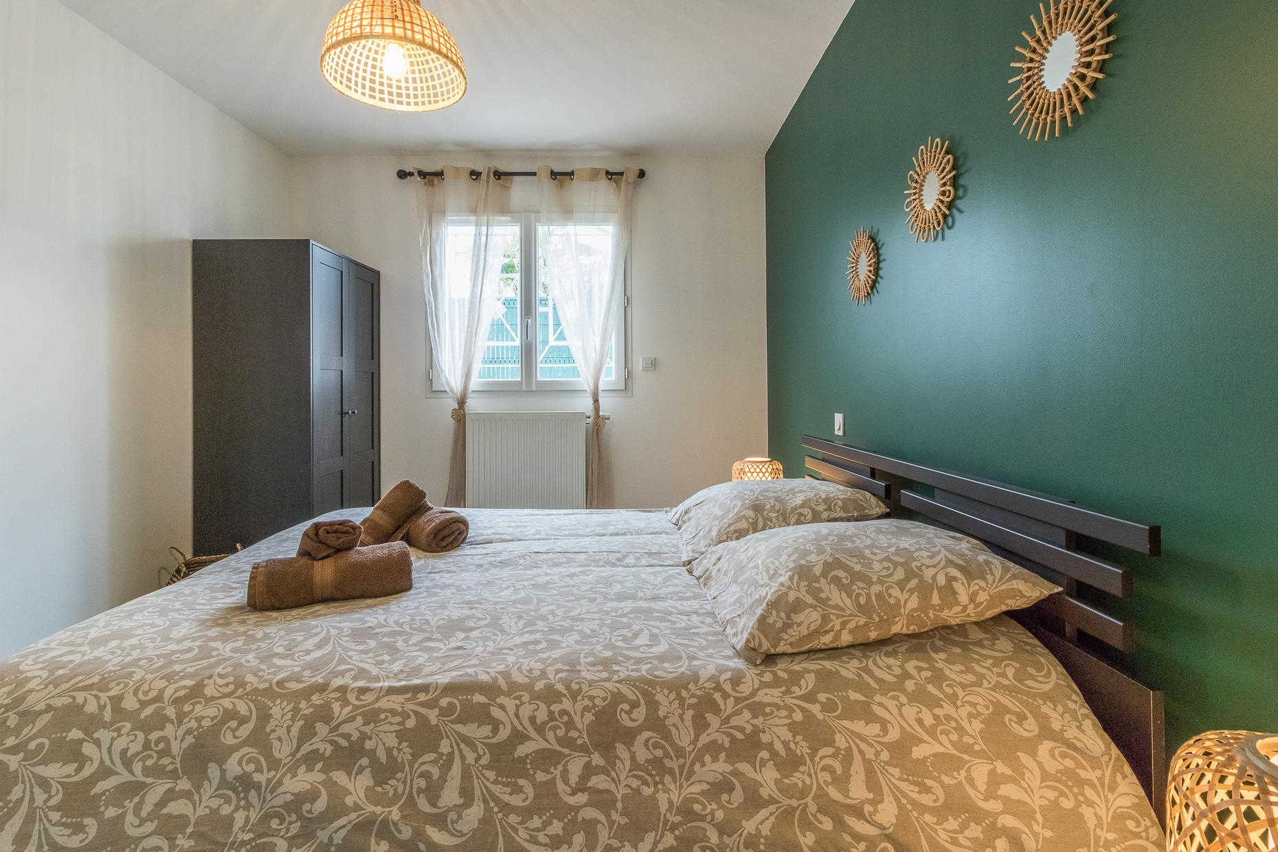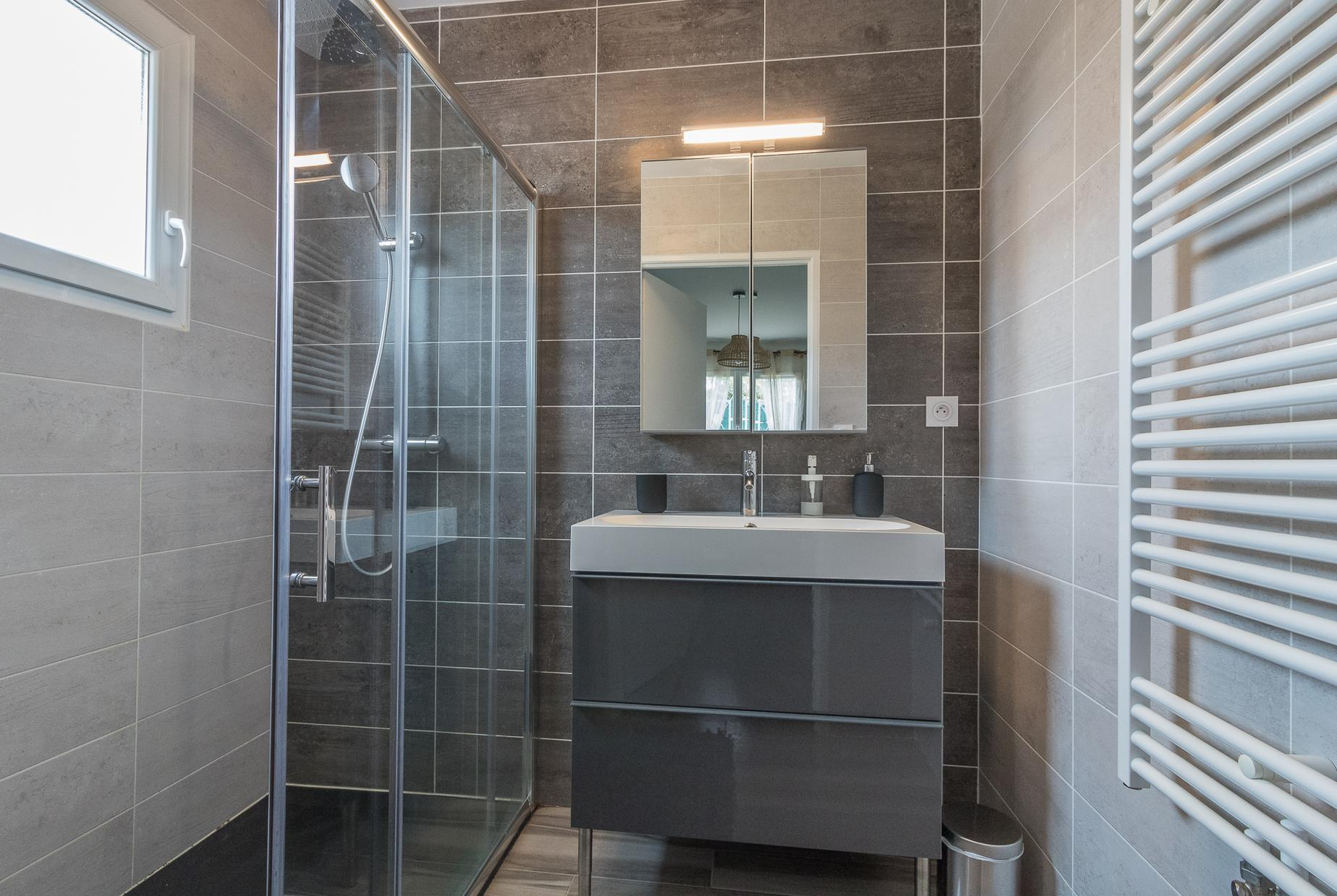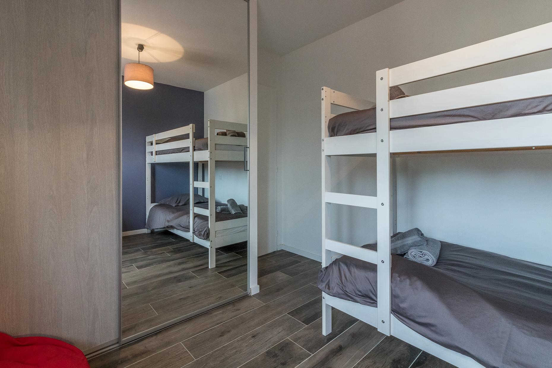 A l’étage : 3 chambres décorées avec goût (1 lit double en 140*200cm),(1 lit double en 160*200cm)(2 lits superposés en 90*190cm), une salle de bains moderne avec baignoire, douche et WC.