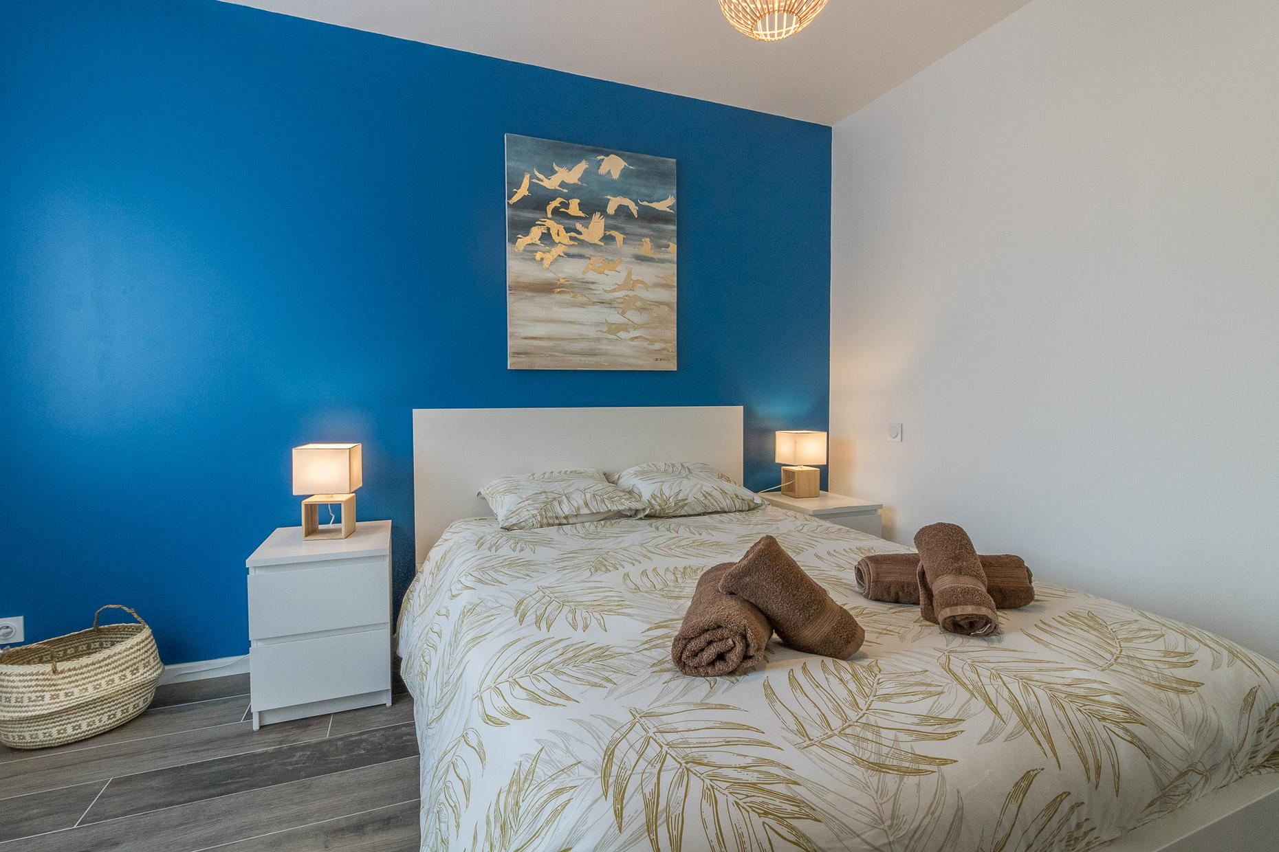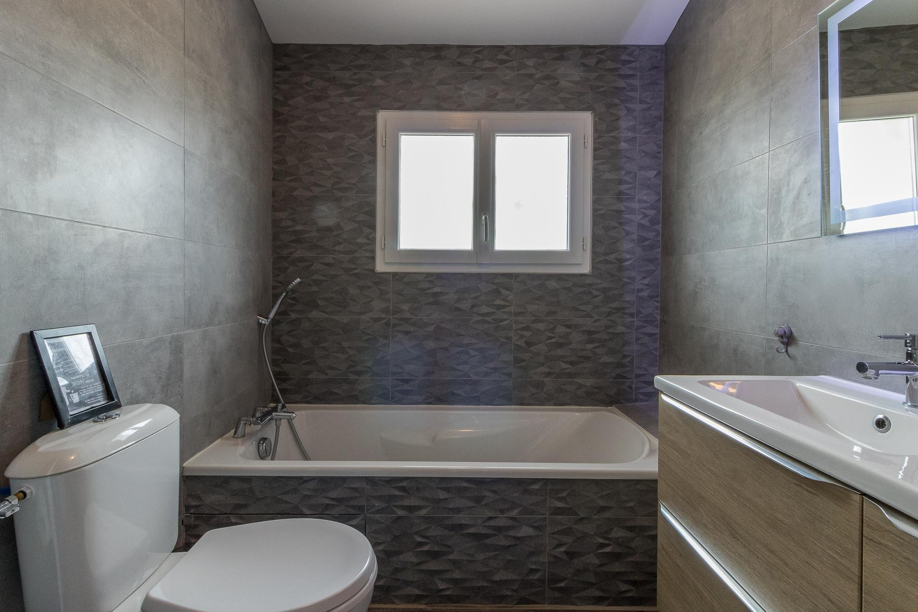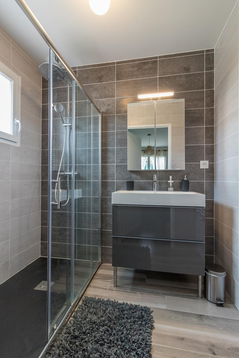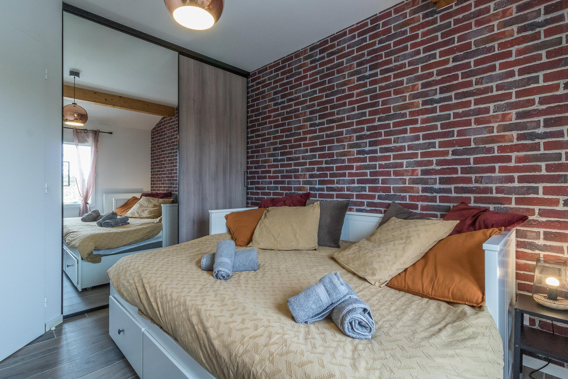 A l’étage : 3 chambres décorées avec goût (1 lit double en 140*200cm),(1 lit double en 160*200cm)(2 lits superposés en 90*190cm), une salle de bains moderne avec baignoire, douche et WC.