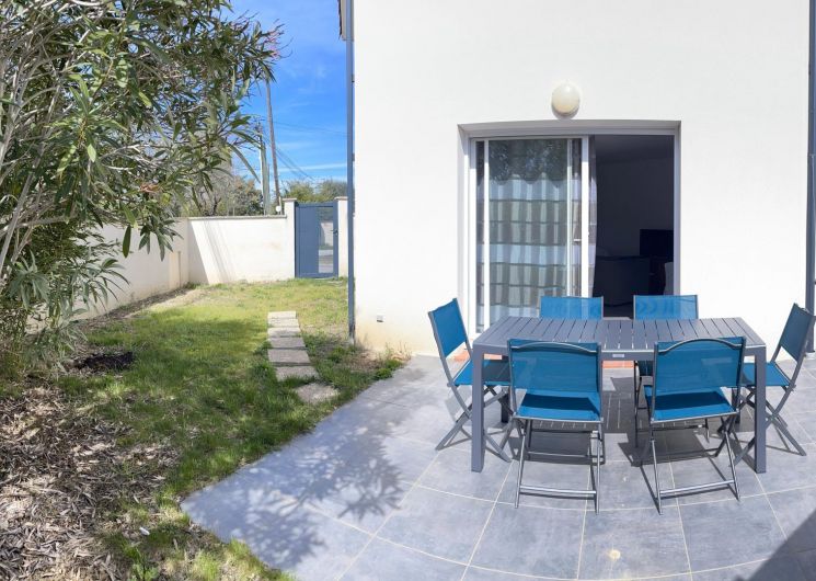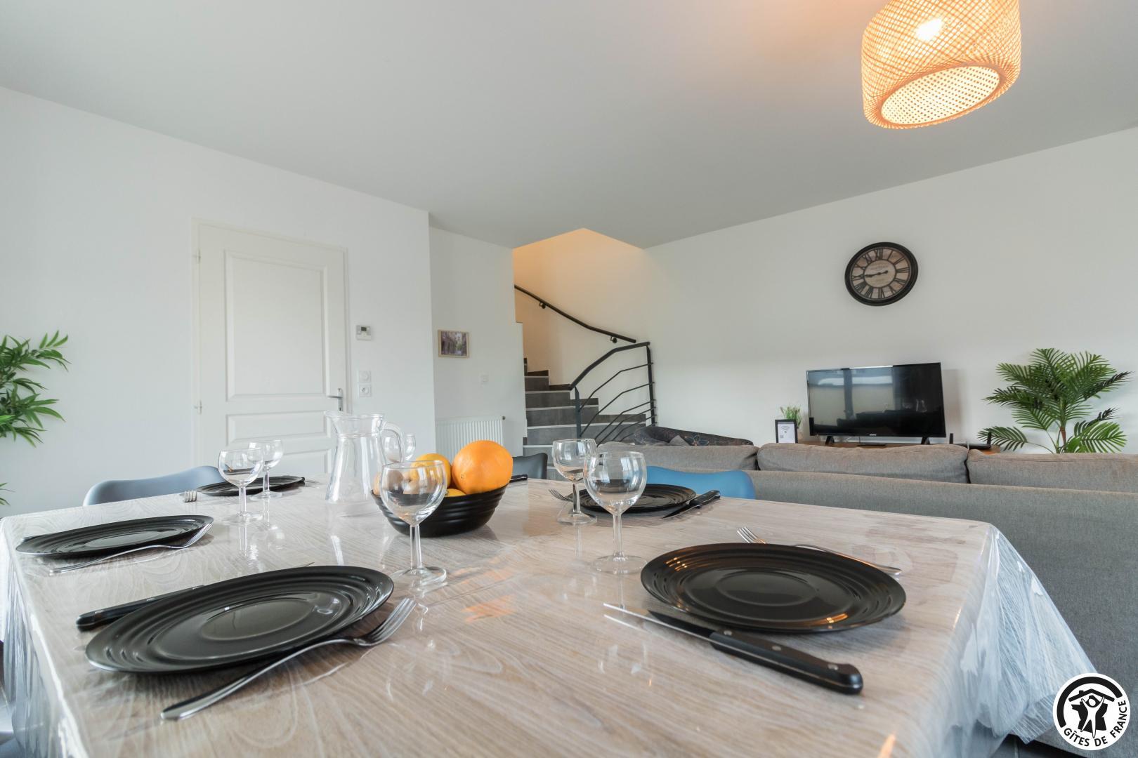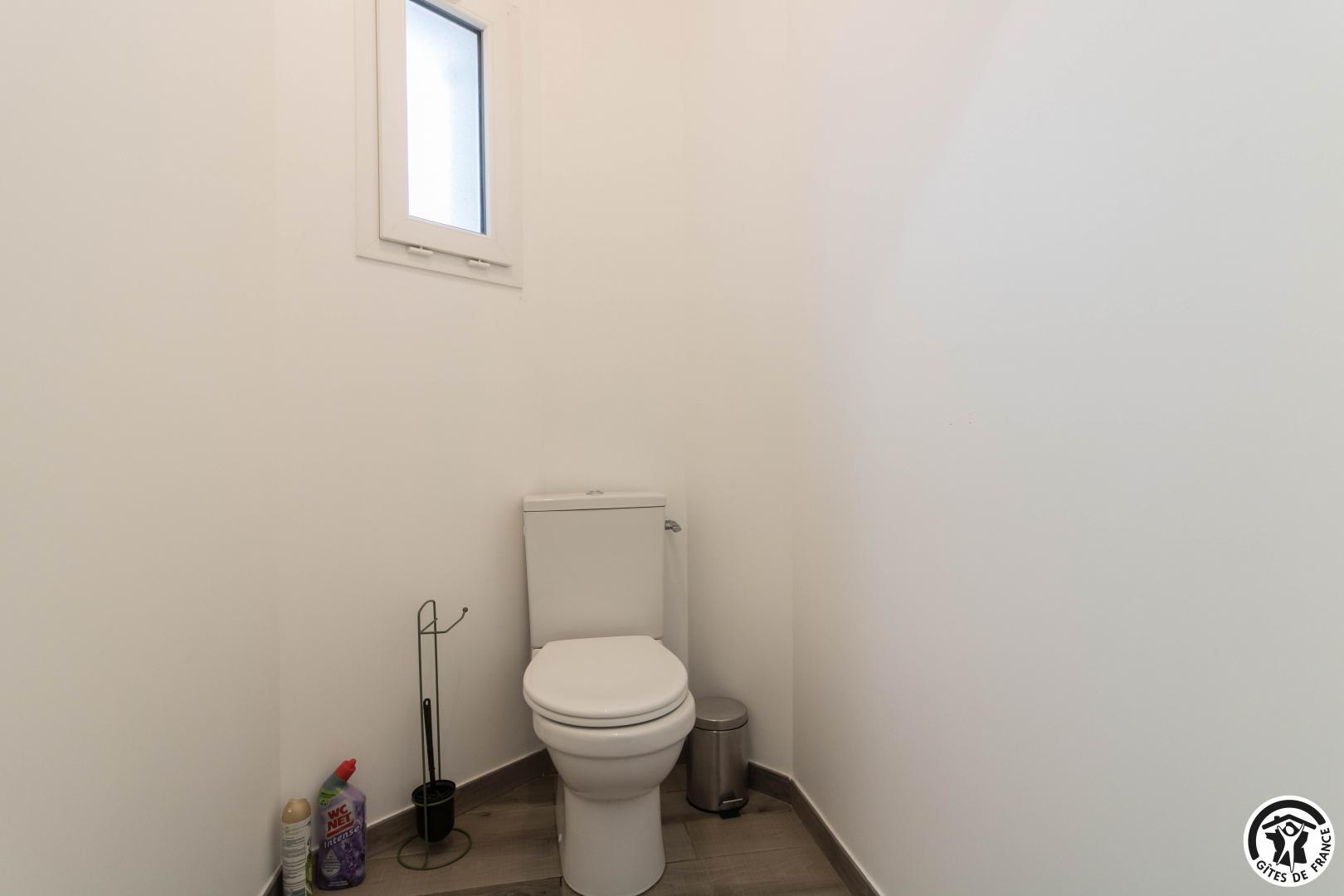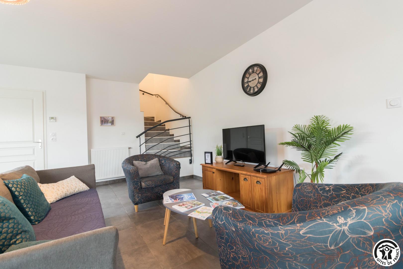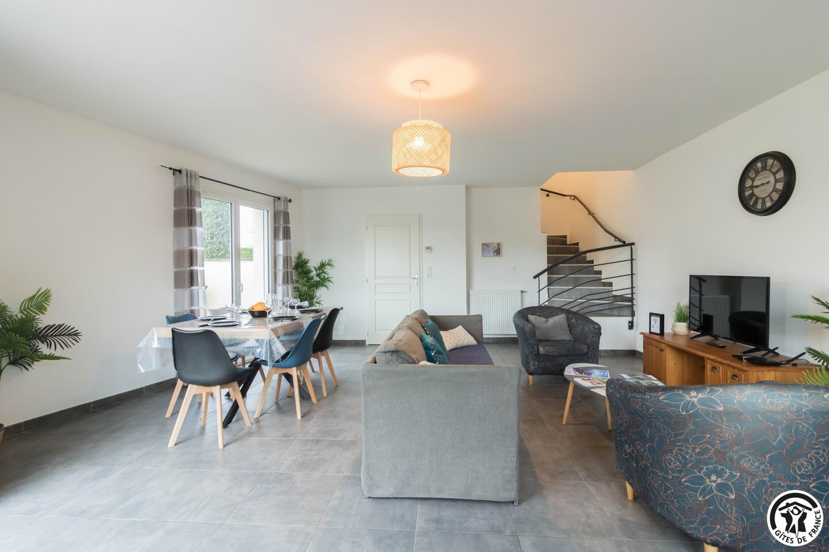 Au rez-de-chaussée : un salon lumineux, une cuisine entièrement équipée, une entrée et des WC.