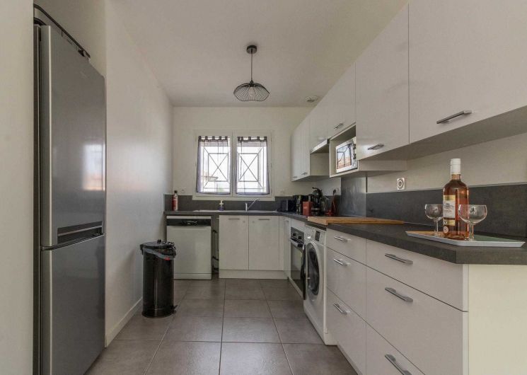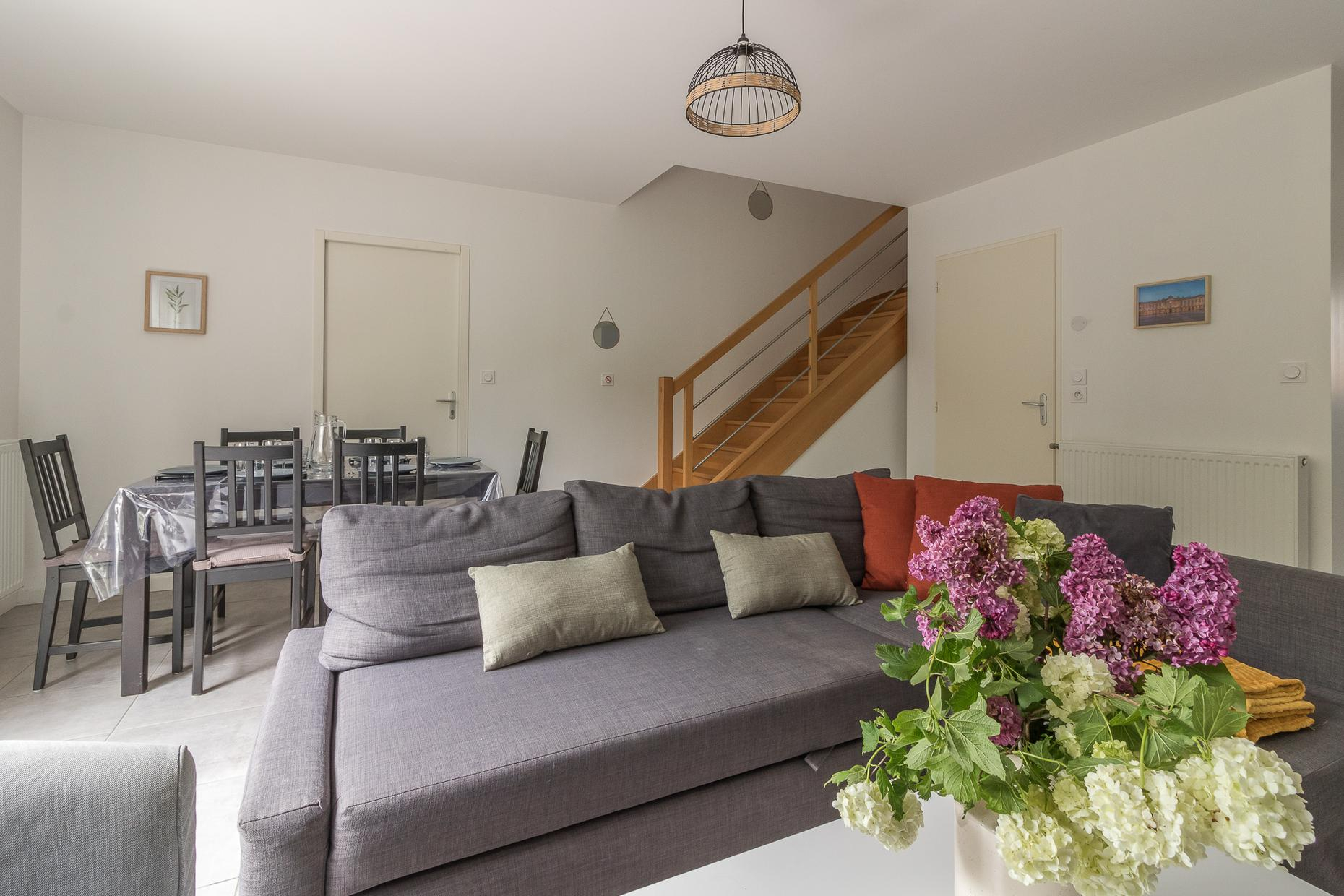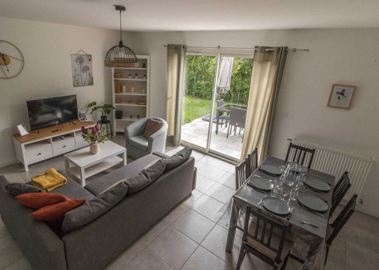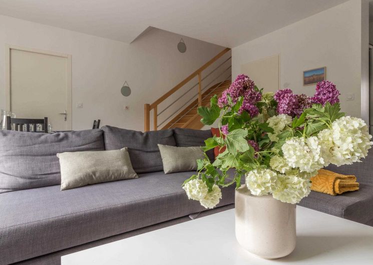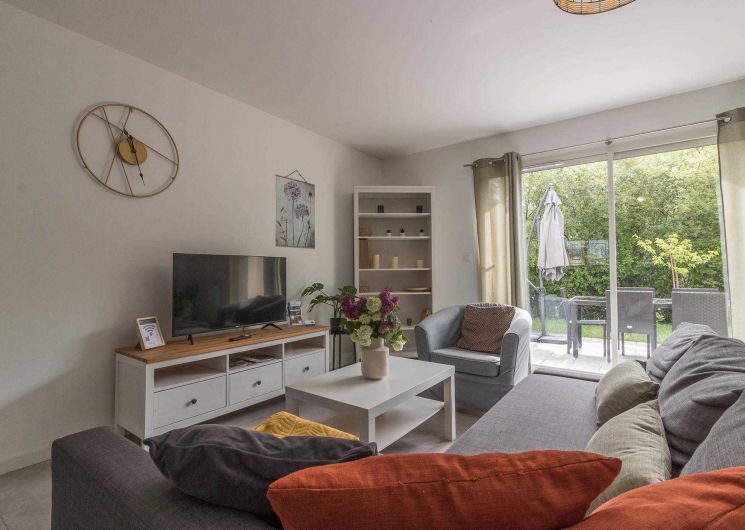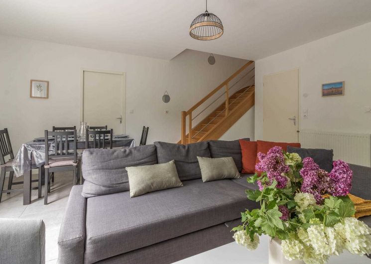 Au rez-de-chaussée : un salon lumineux, une cuisine entièrement équipée, une entrée et des WC.