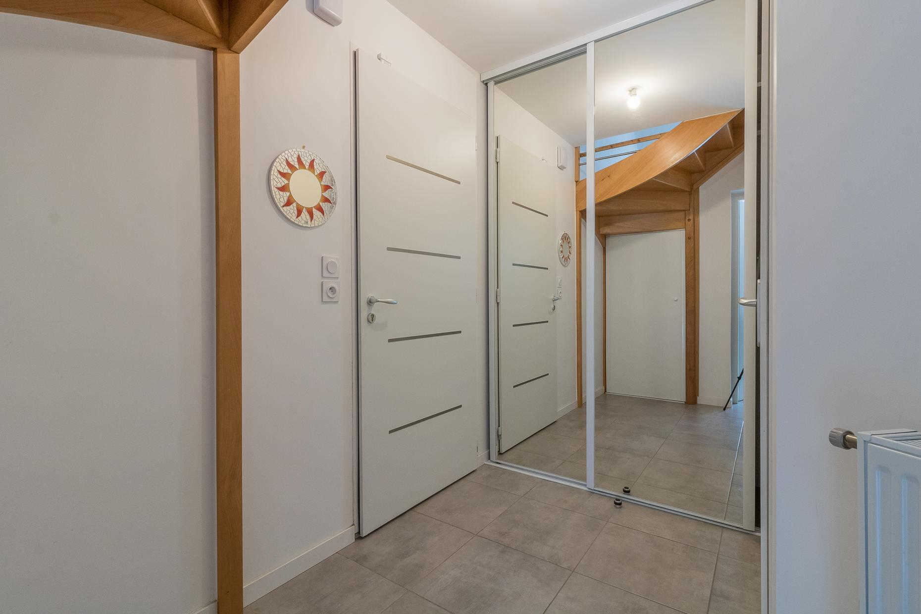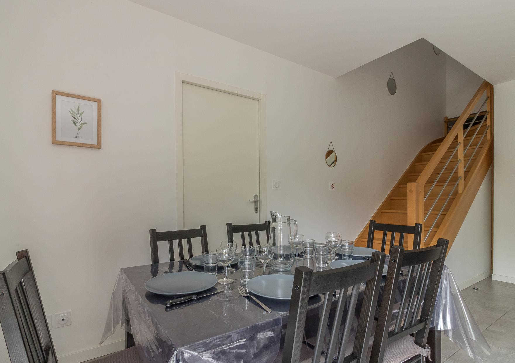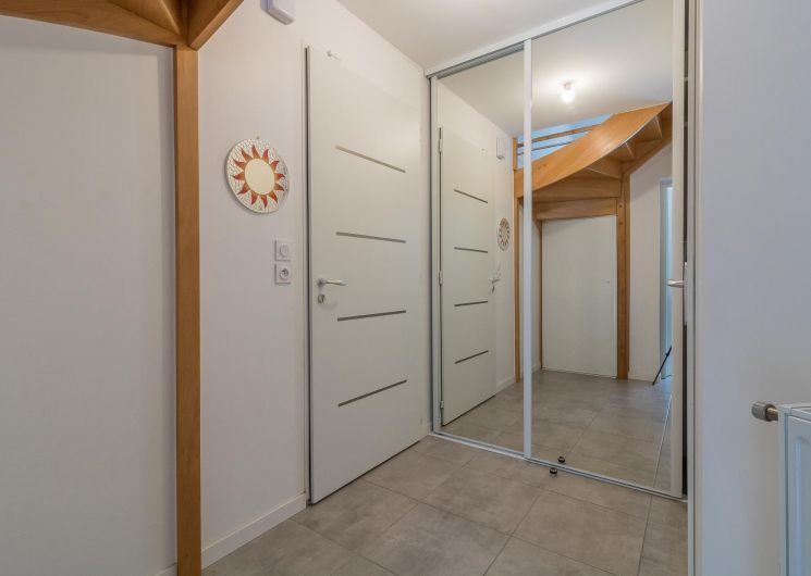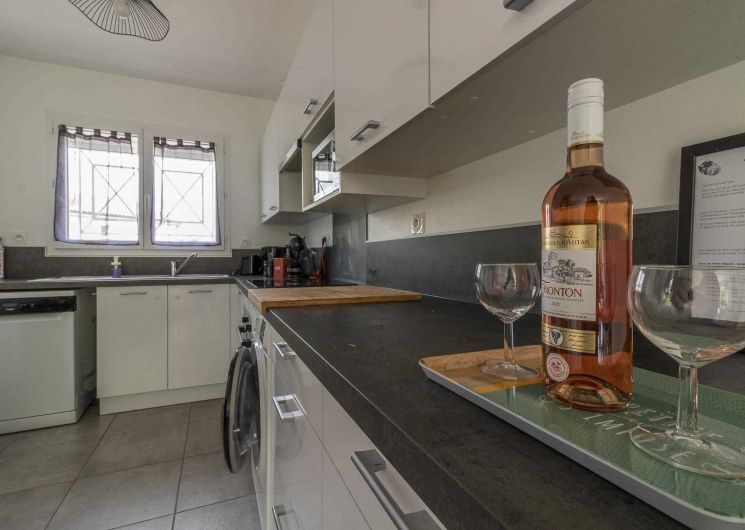 Au rez-de-chaussée : un salon lumineux, une cuisine entièrement équipée, une entrée et des WC.