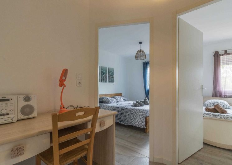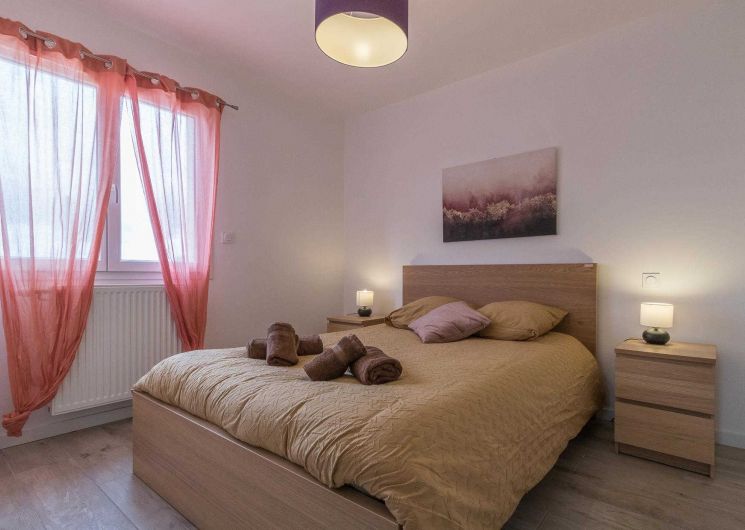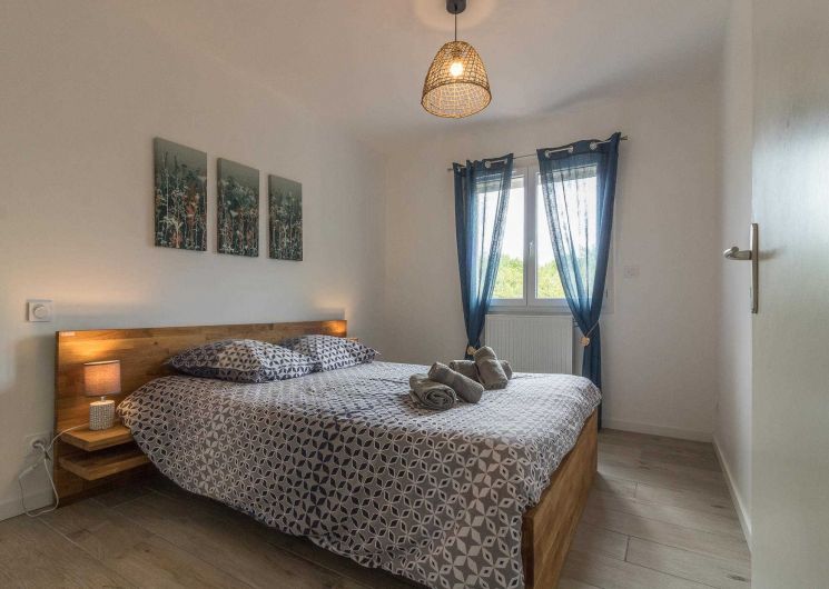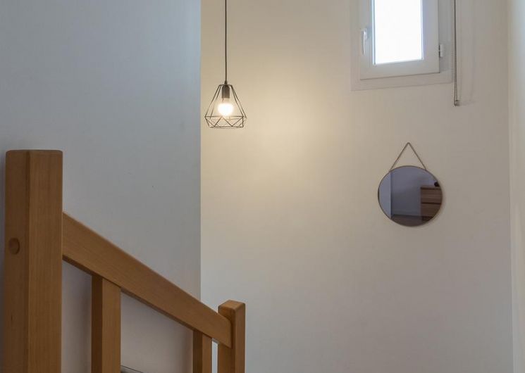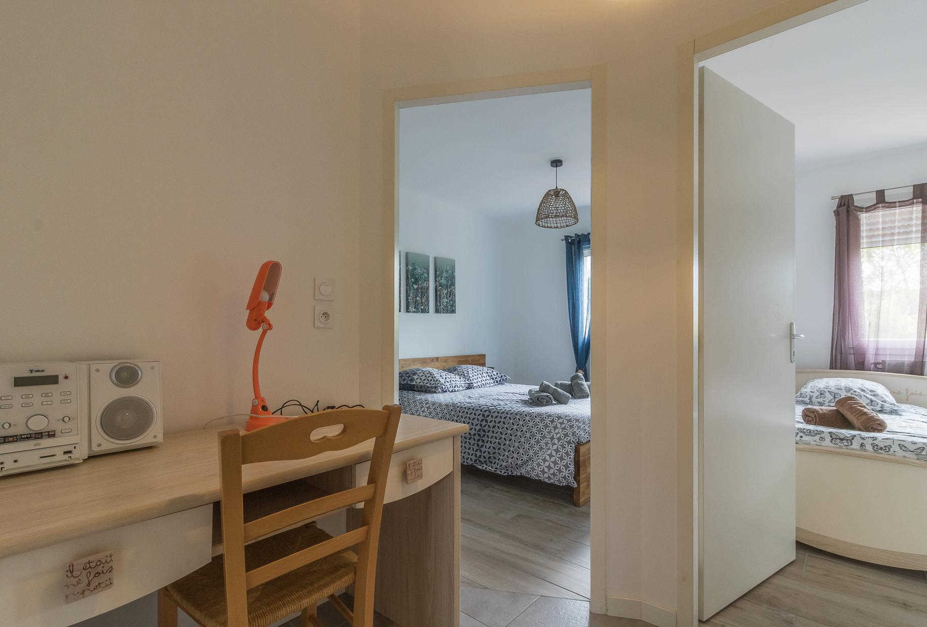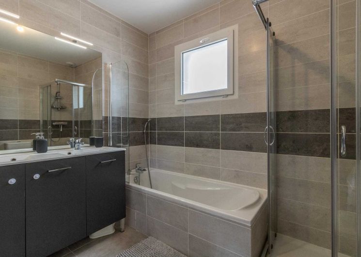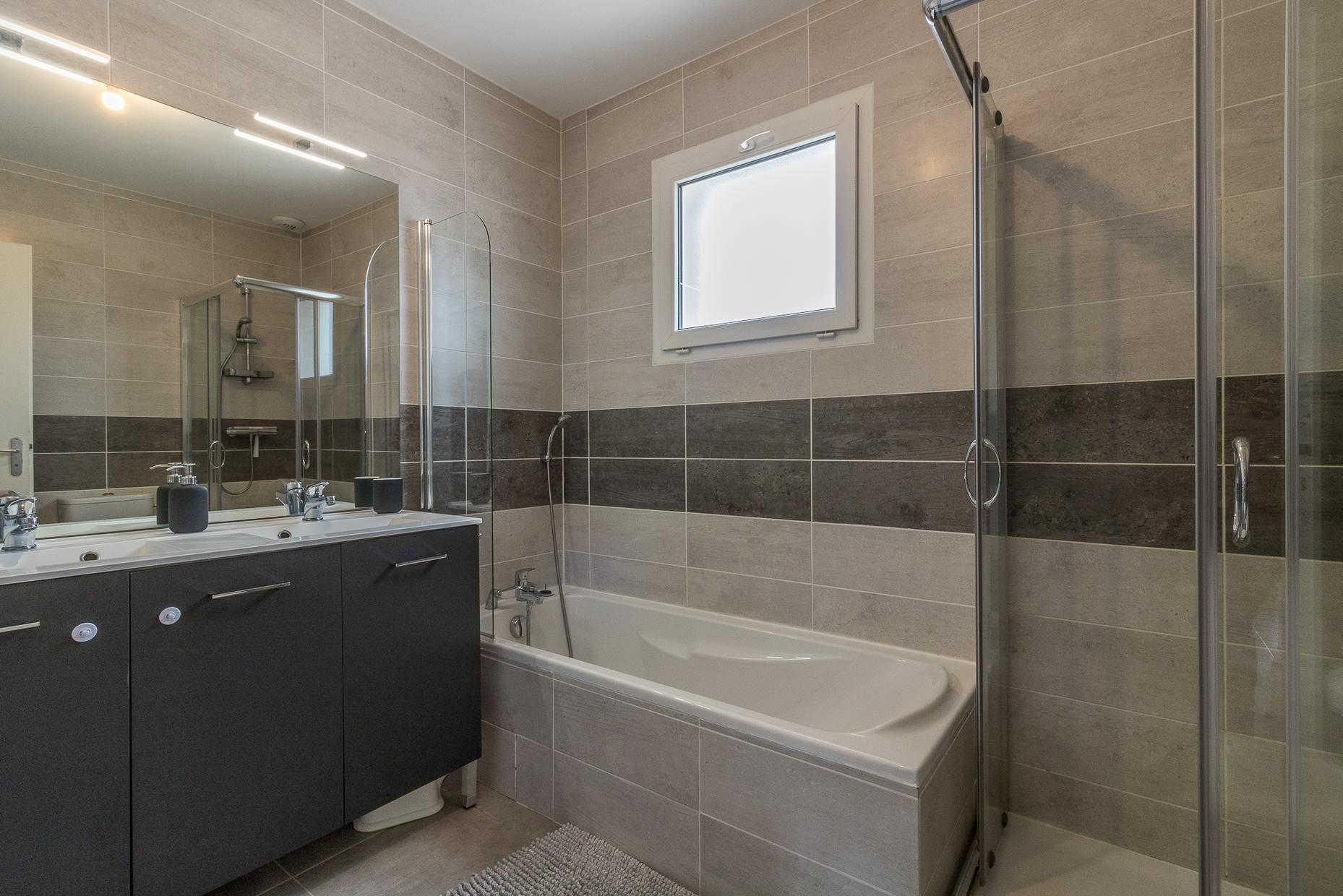 A l’étage : 3 chambres décorées avec goût (1 lit double en 140*200cm),(1 lit double en 140*200cm)(2 lits simples en 90*200cm et 80*200cm), une salle de bains moderne avec baignoire, douche et WC.