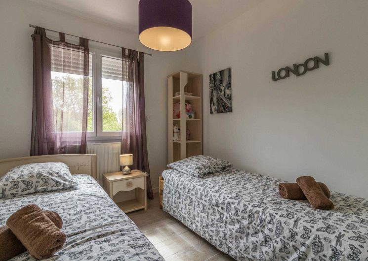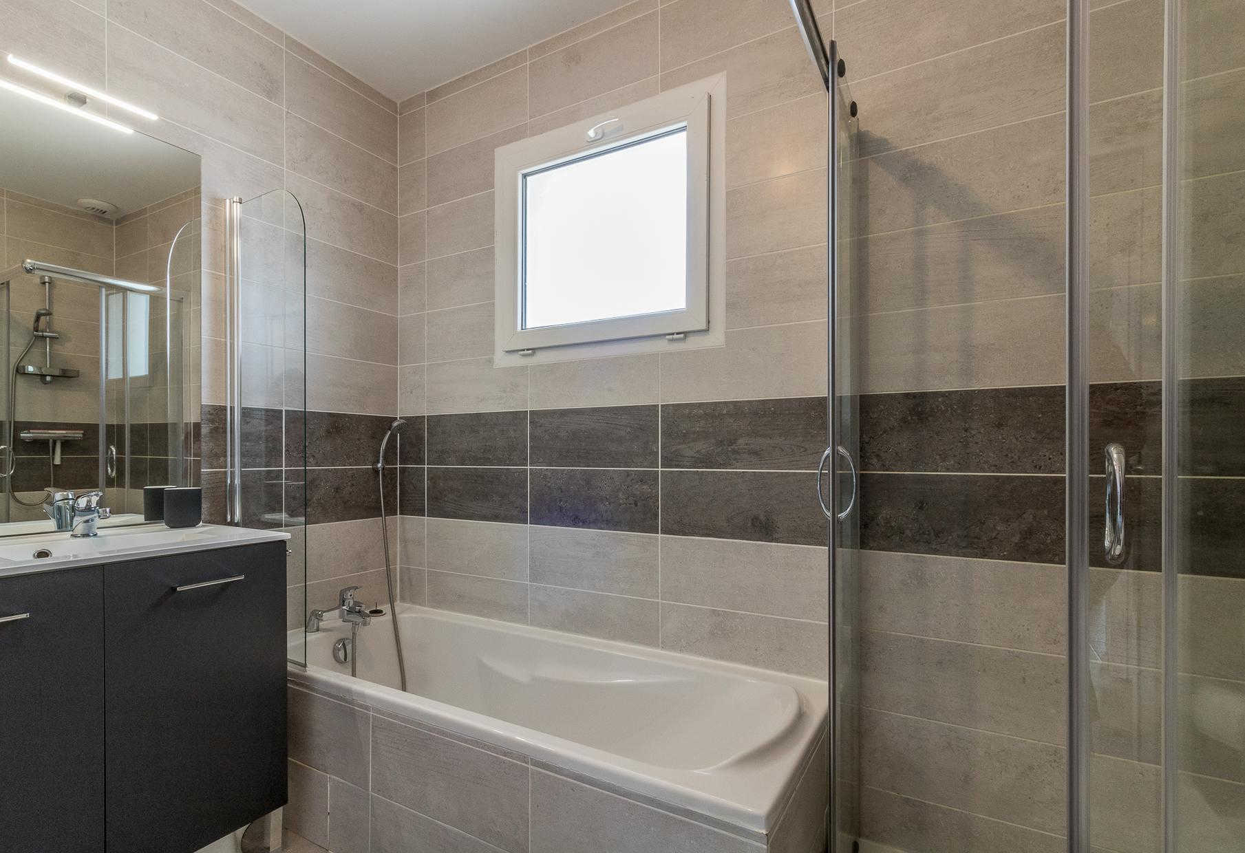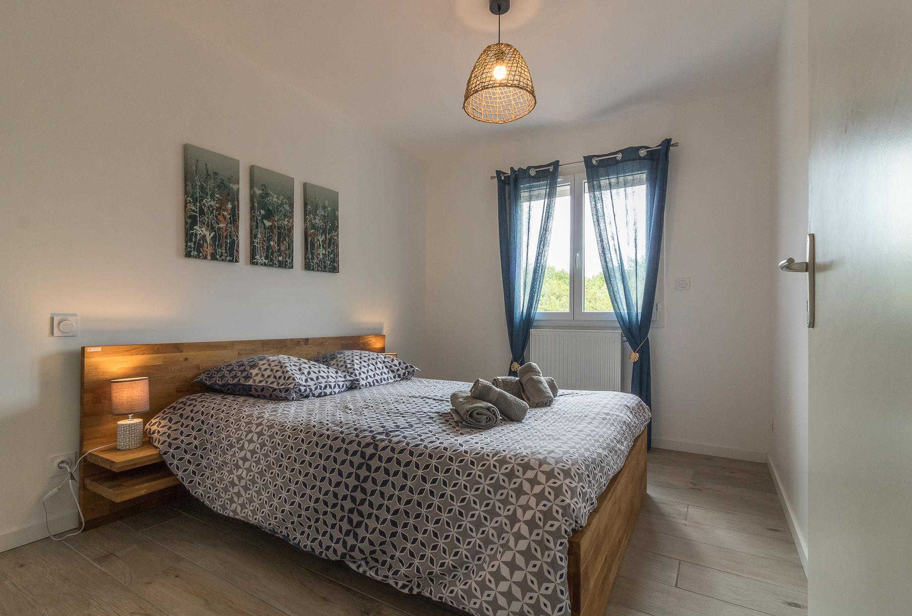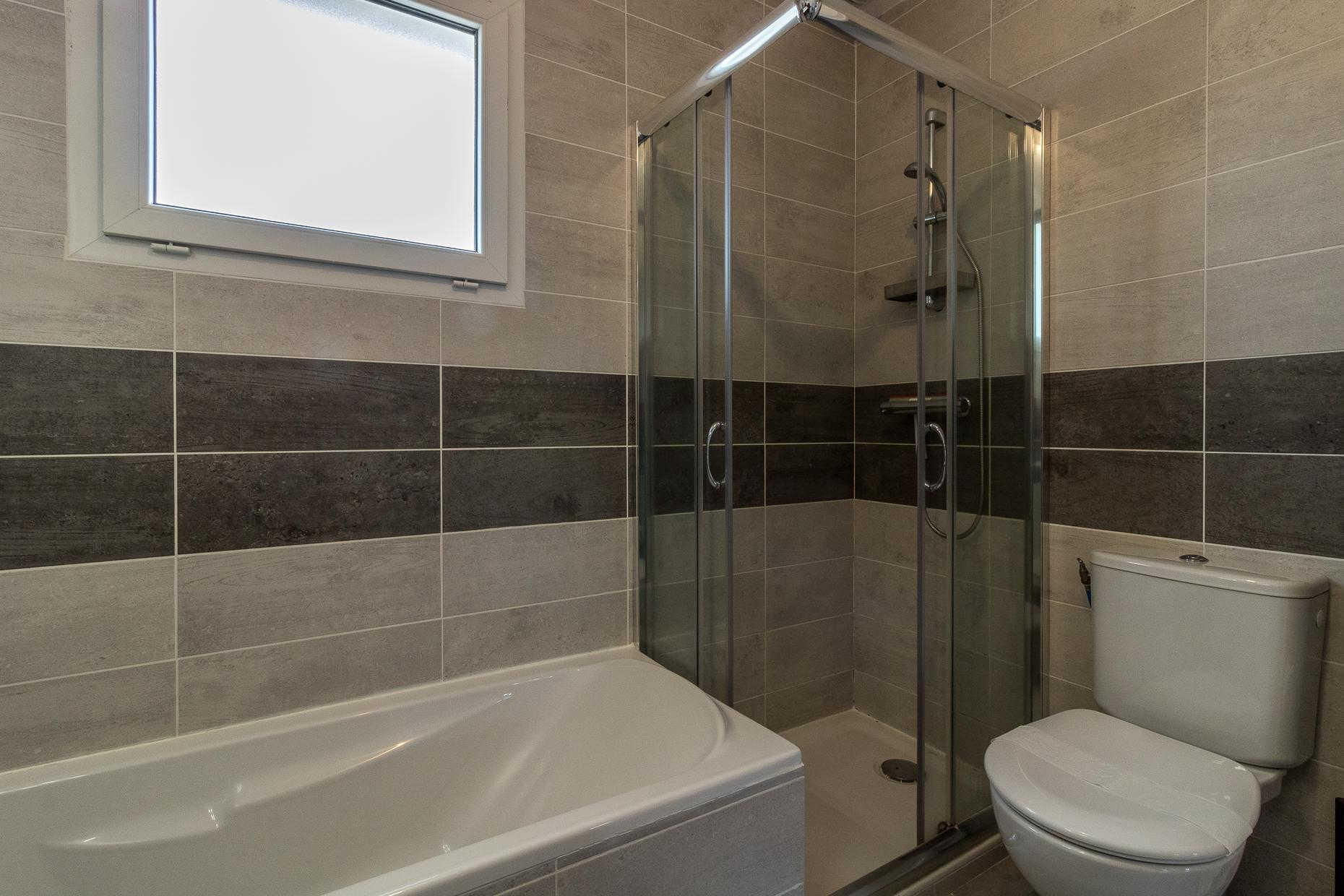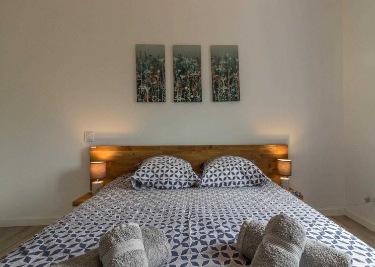 A l’étage : 3 chambres décorées avec goût (1 lit double en 140*200cm),(1 lit double en 140*200cm)(2 lits simples en 90*200cm et 80*200cm), une salle de bains moderne avec baignoire, douche et WC.
