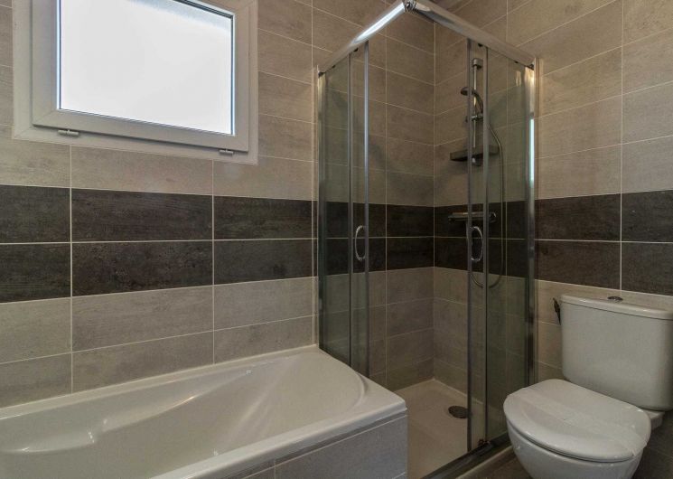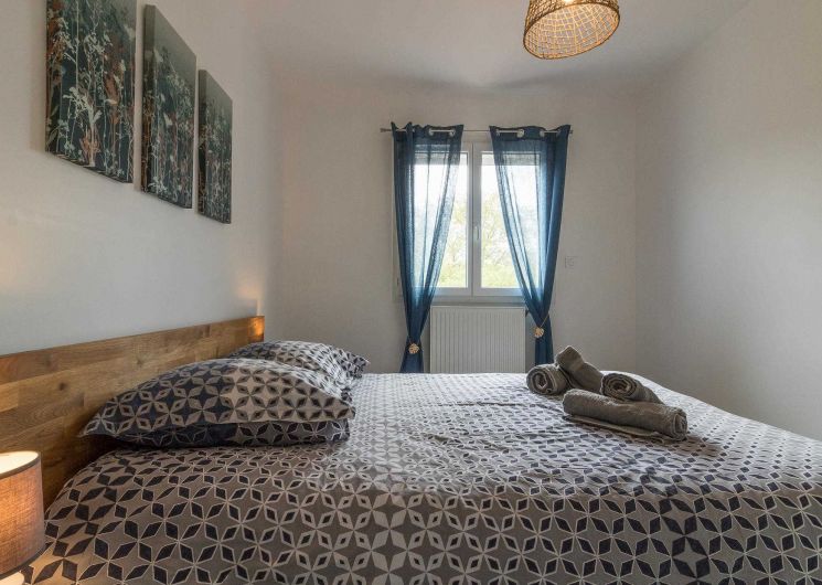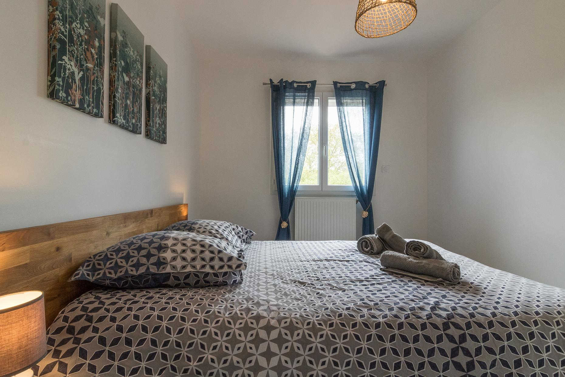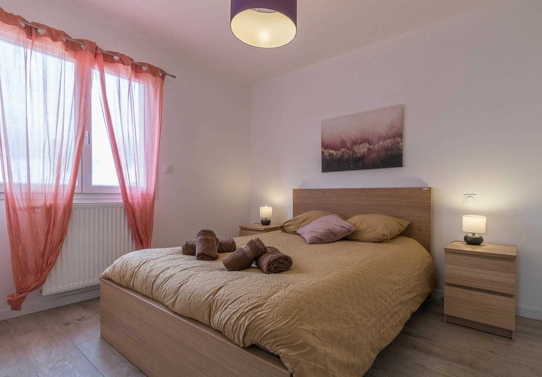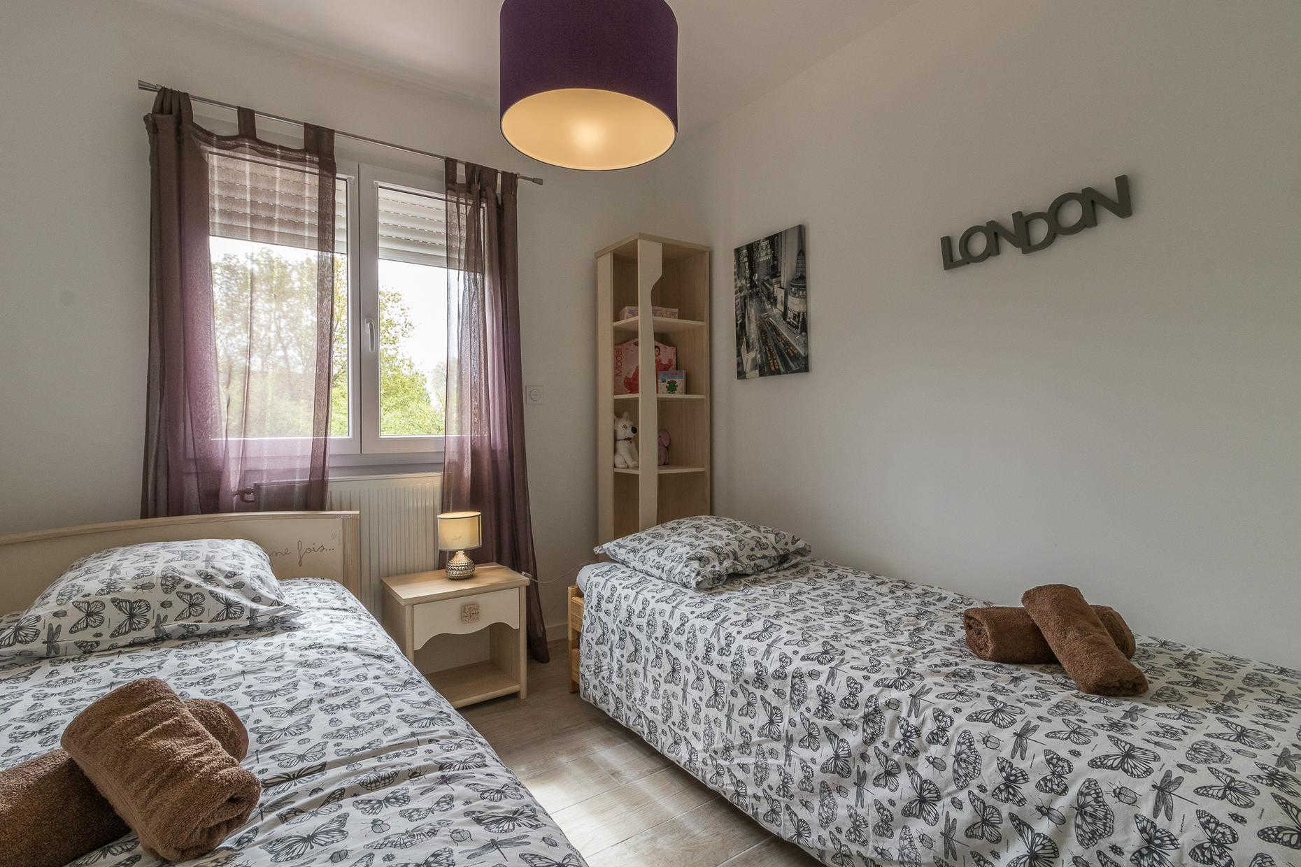 A l’étage : 3 chambres décorées avec goût (1 lit double en 140*200cm),(1 lit double en 140*200cm)(2 lits simples en 90*200cm et 80*200cm), une salle de bains moderne avec baignoire, douche et WC.